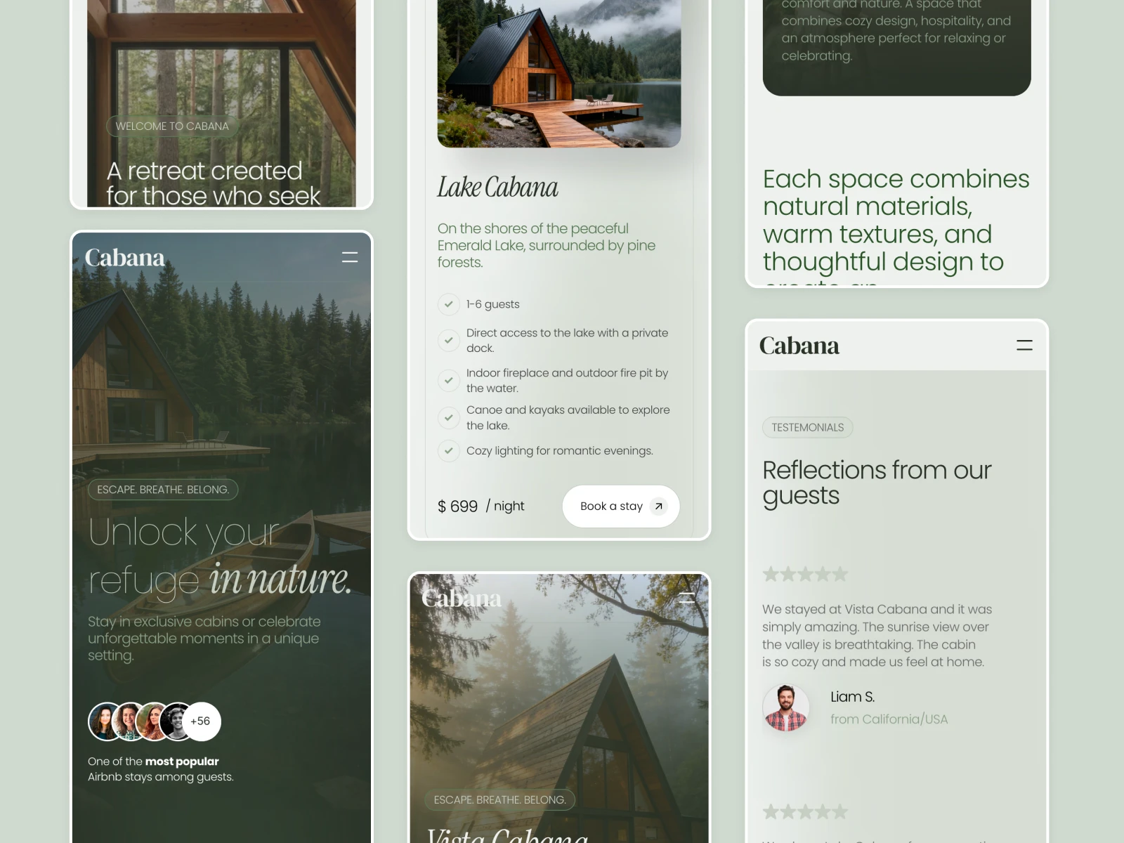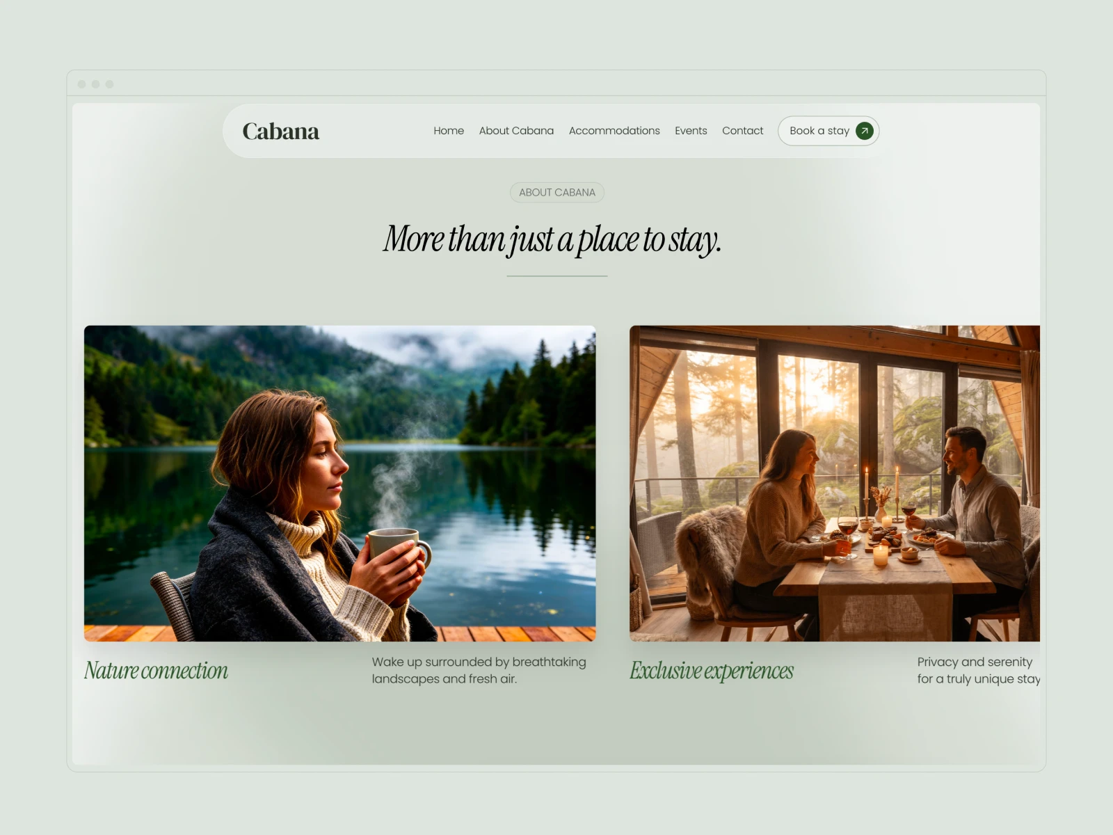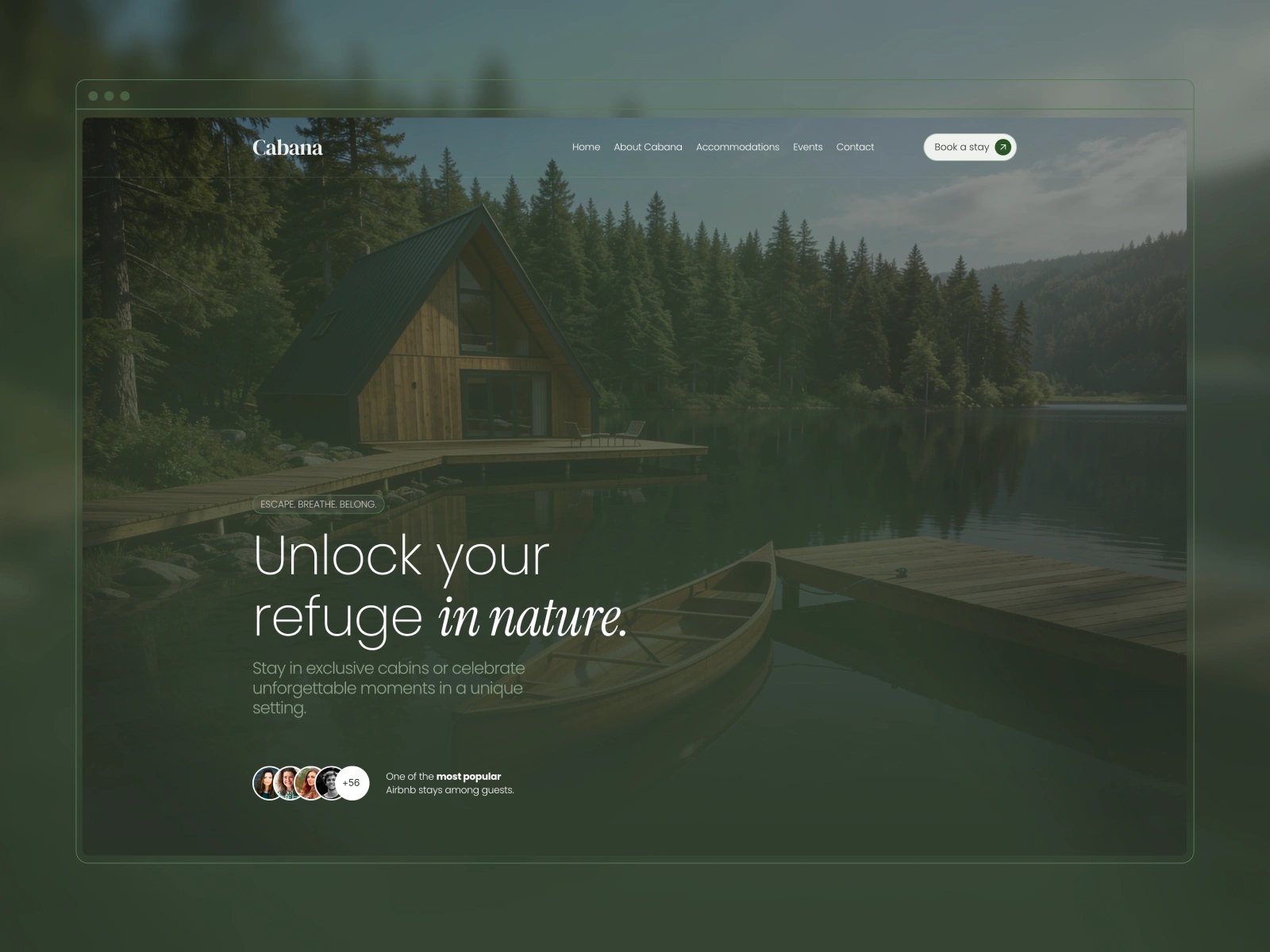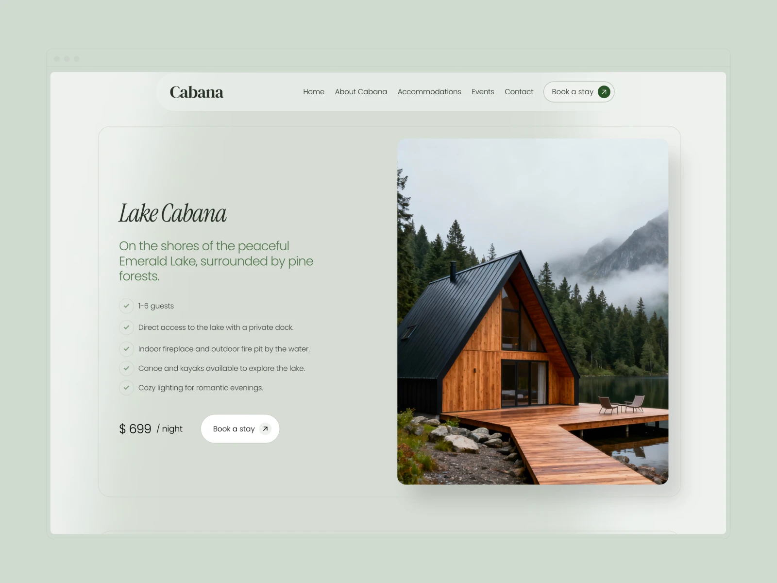 Cabana is a premium Framer model designed for nature retreats, boutique accommodations, cabins, guesthouses, or small hotels. It features cozy accommodations, event spaces, and an engaging narrative through refined layouts, tranquil interactions, and atmospheric visuals.