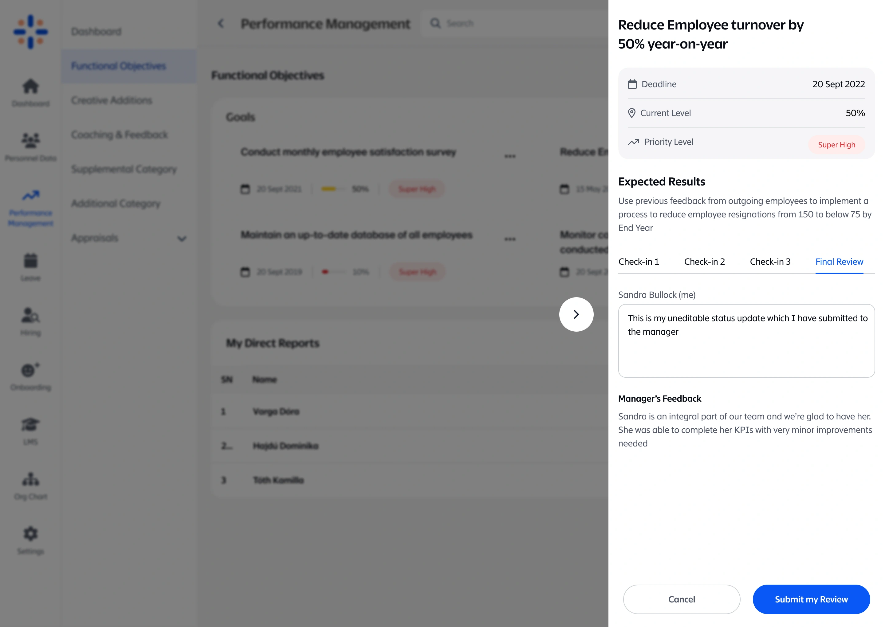 HR business partners saw companies struggling with fragmented performance tracking. I designed integrated platform with reviews, goal tracking, 1-on-1s, continuous feedback, development planning. Intuitive workflows balancing manager efficiency and employee engagement.