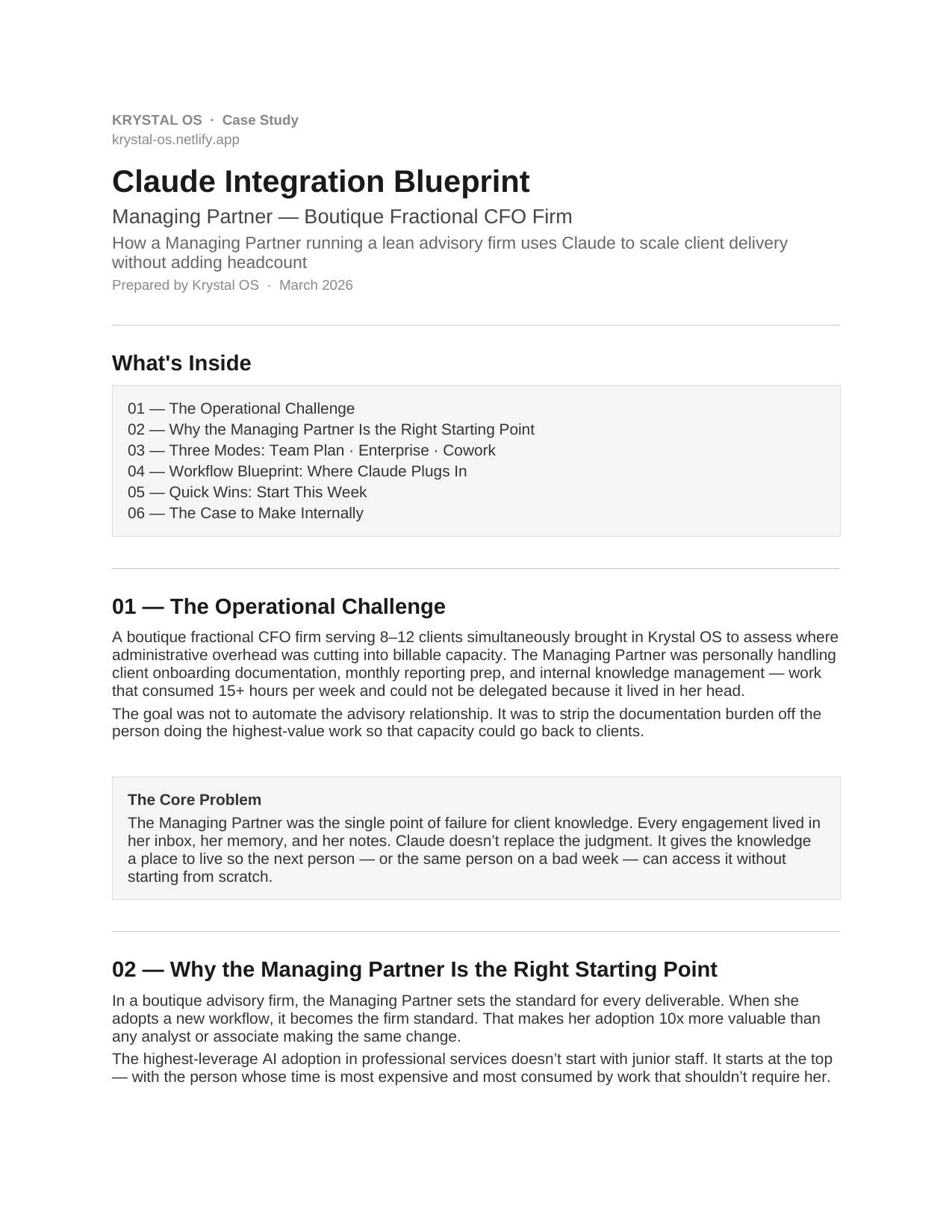 AI workflow blueprint for a Managing Partner at a boutique fractional CFO firm. Mapped Claude adoption across client delivery, reporting, and firm operations.
