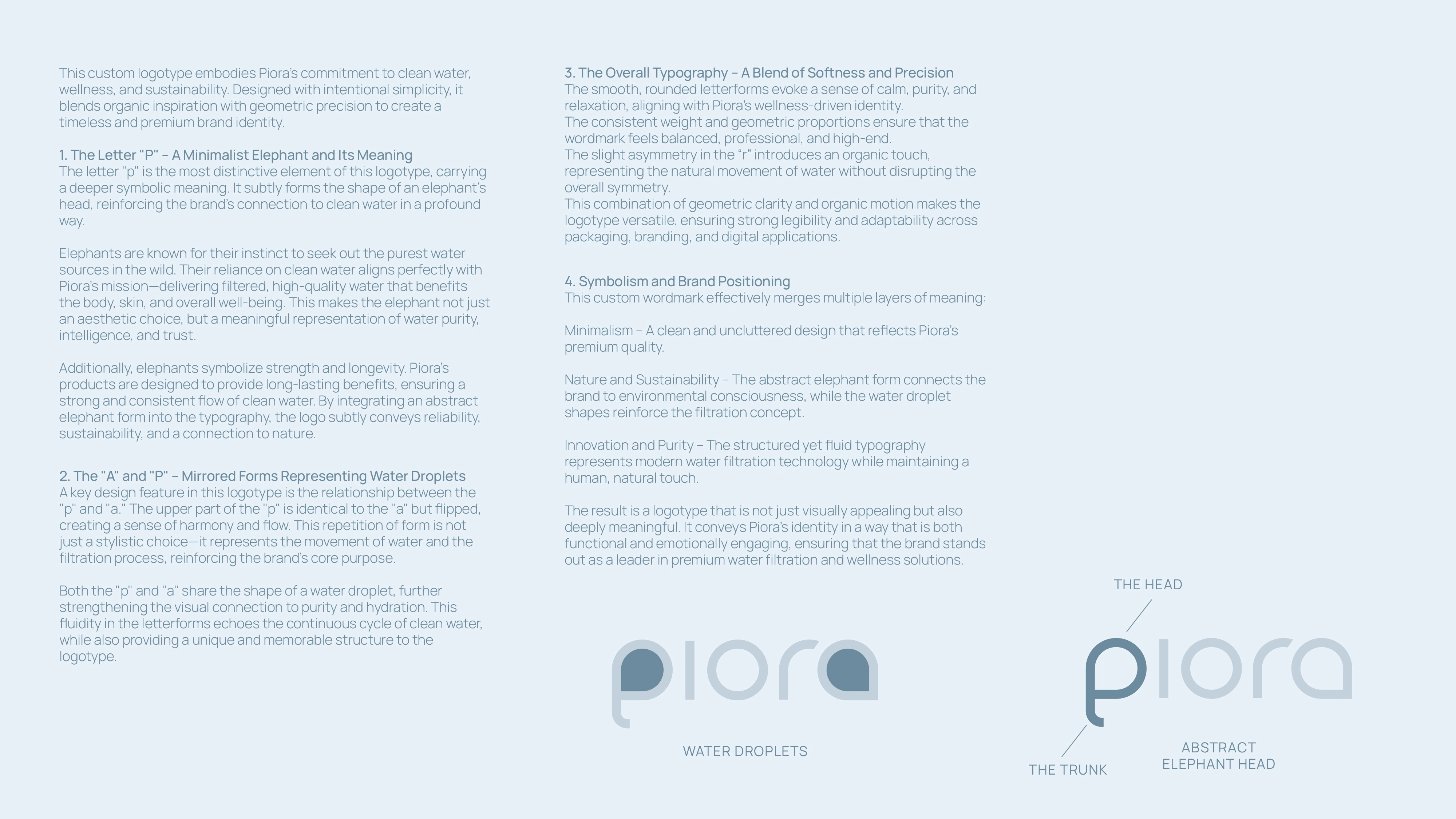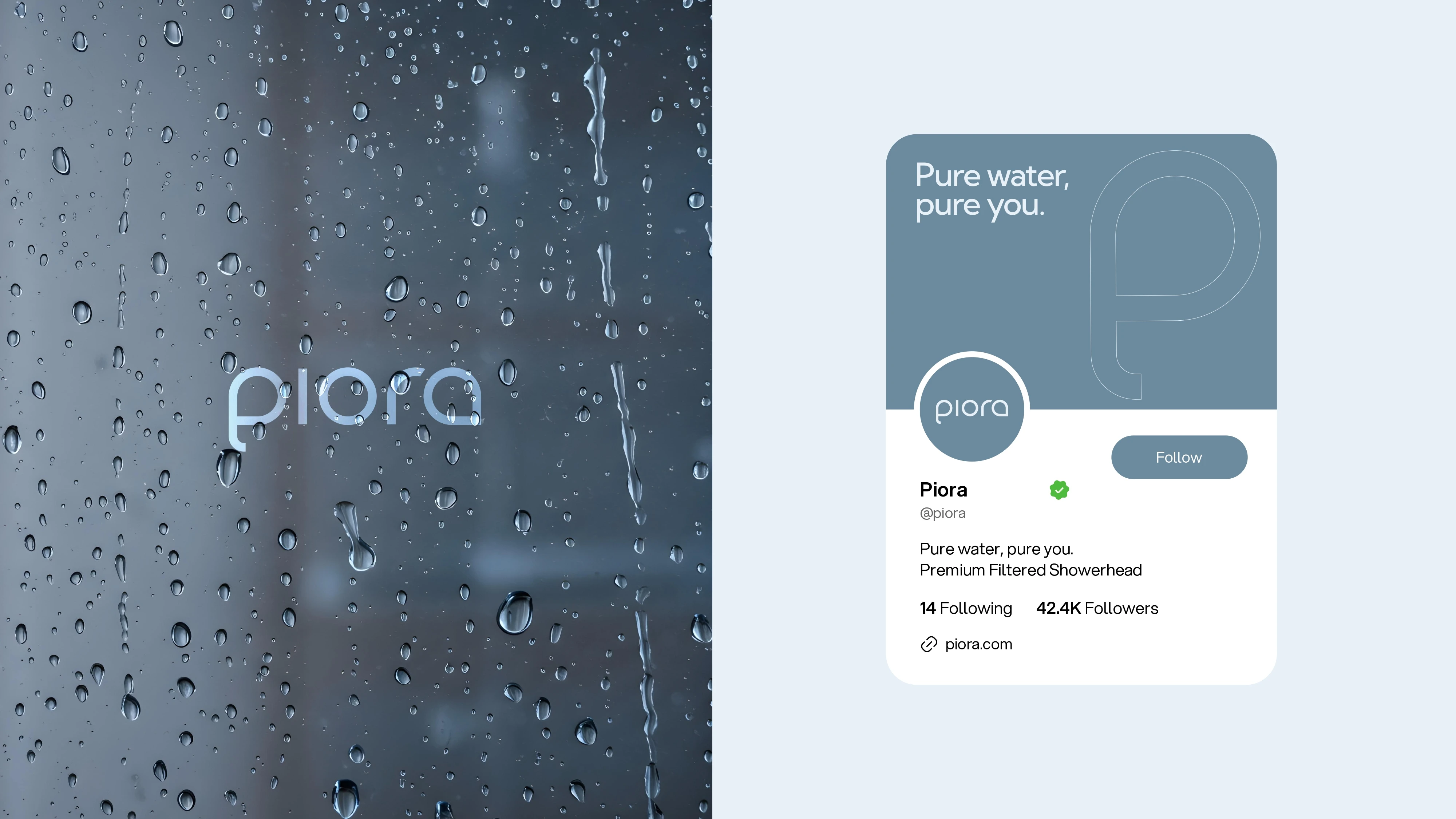 Designed Piora’s premium brand identity for a filtered showerhead, using a nature-inspired wordmark and calm visuals to express purity and wellness.