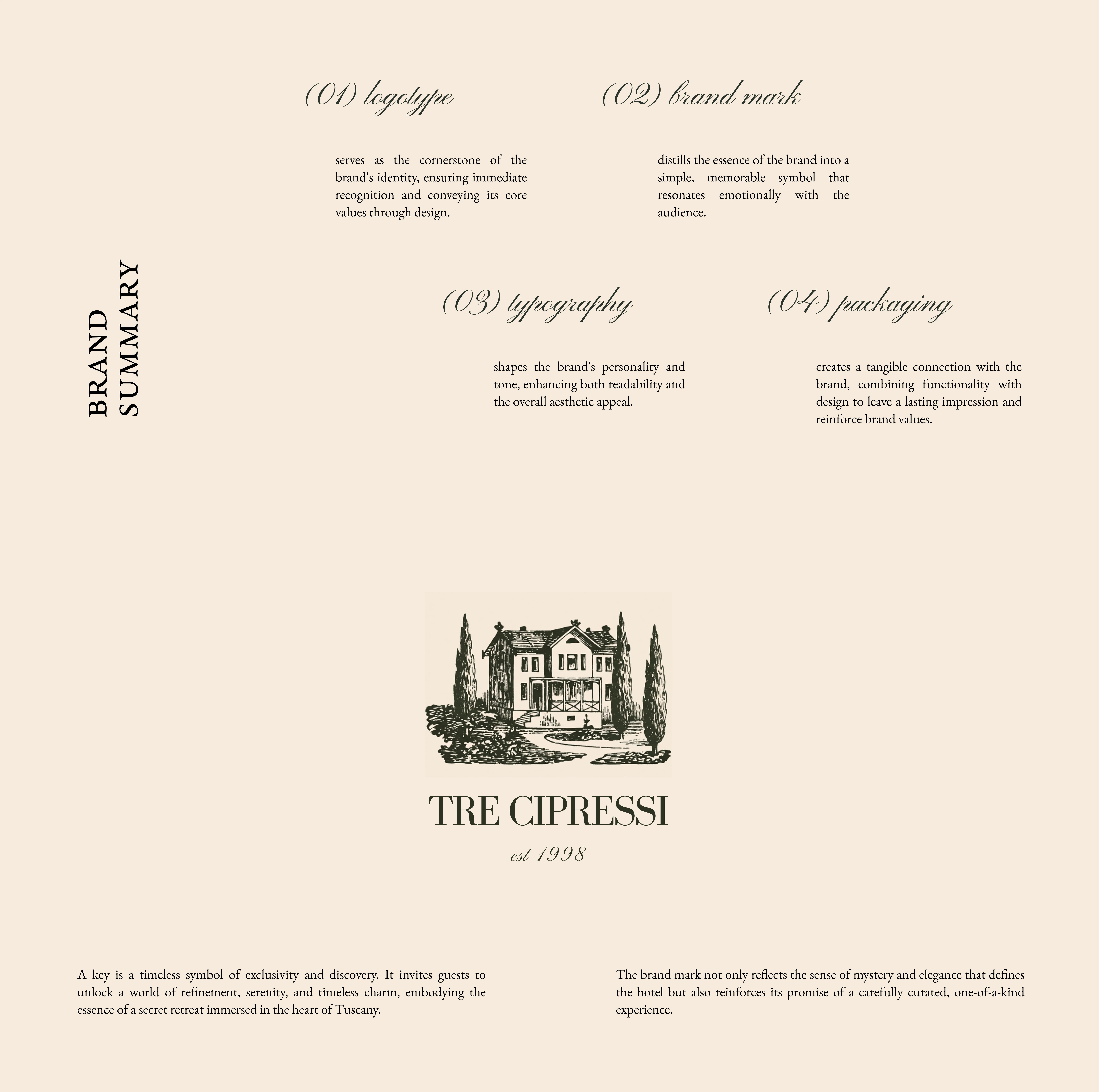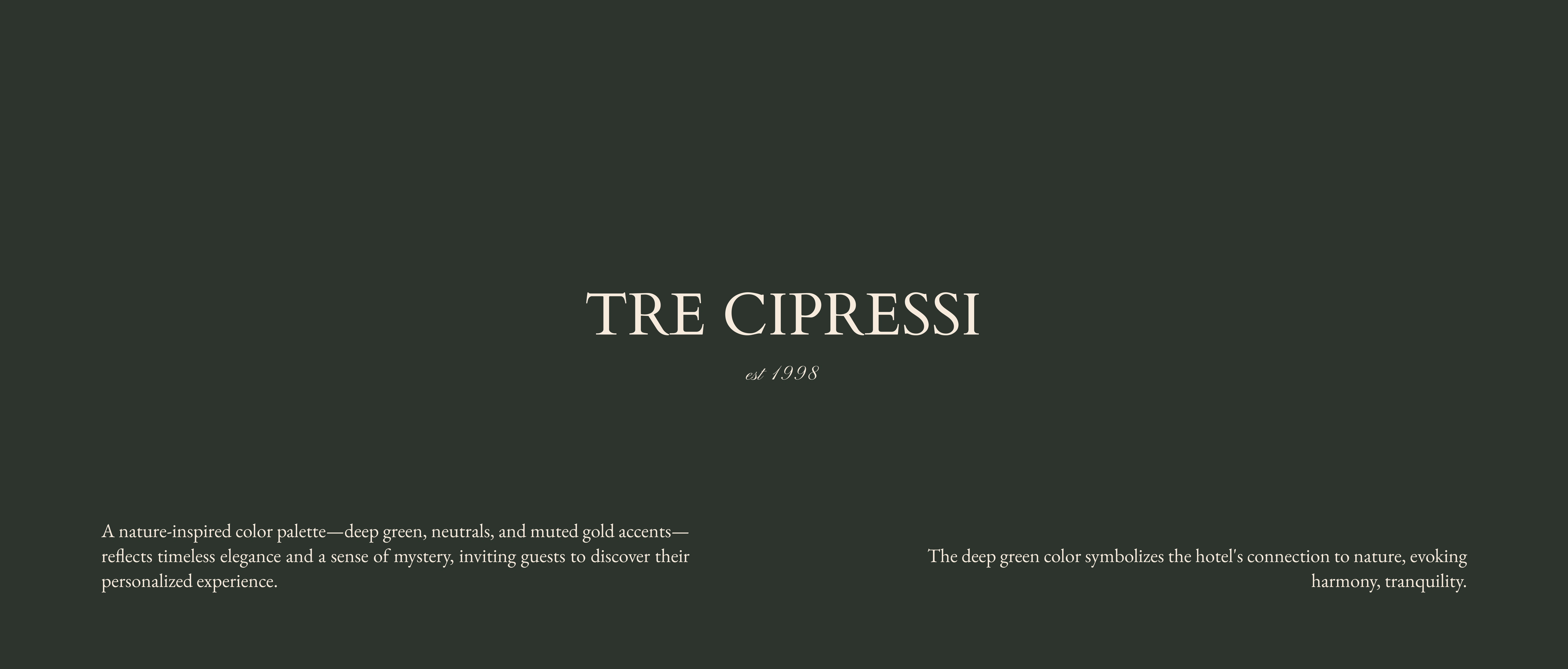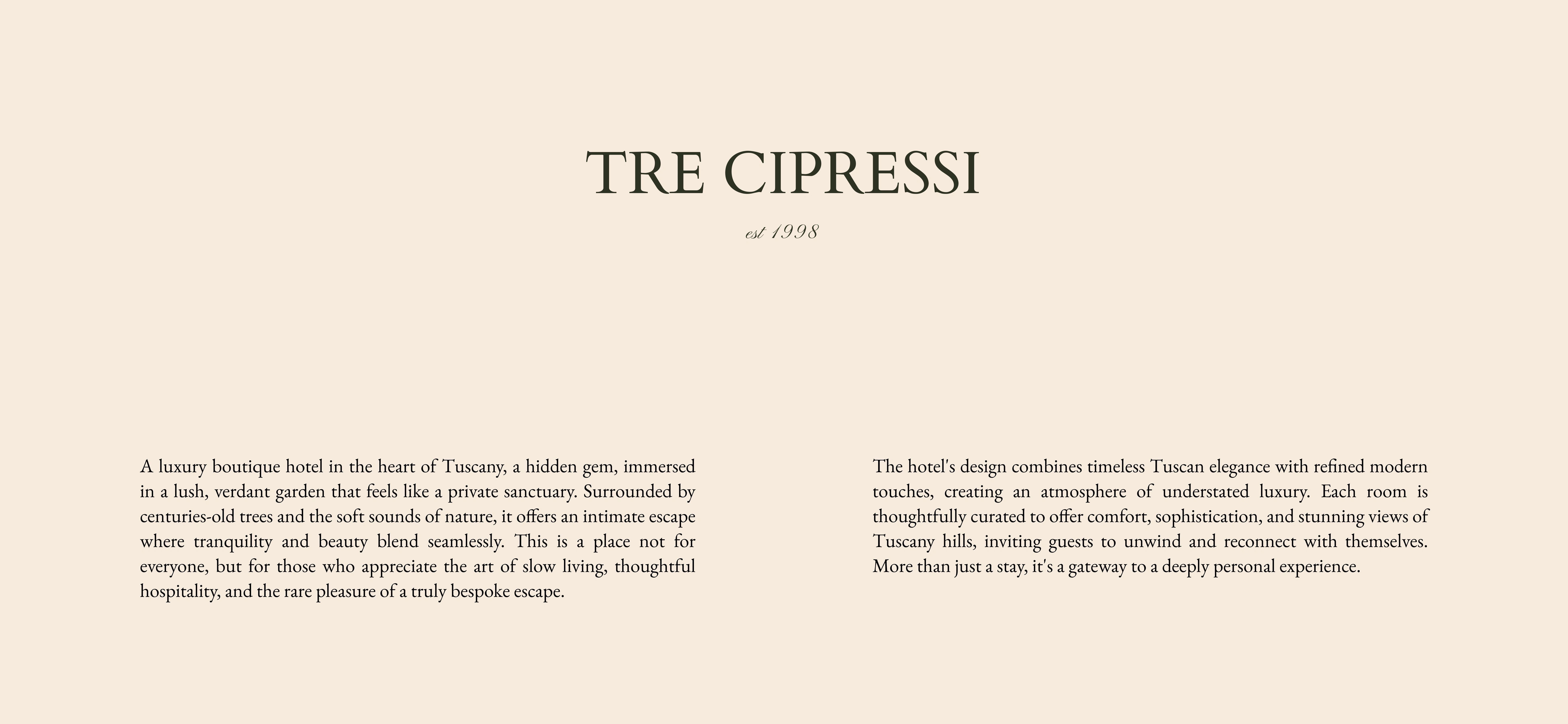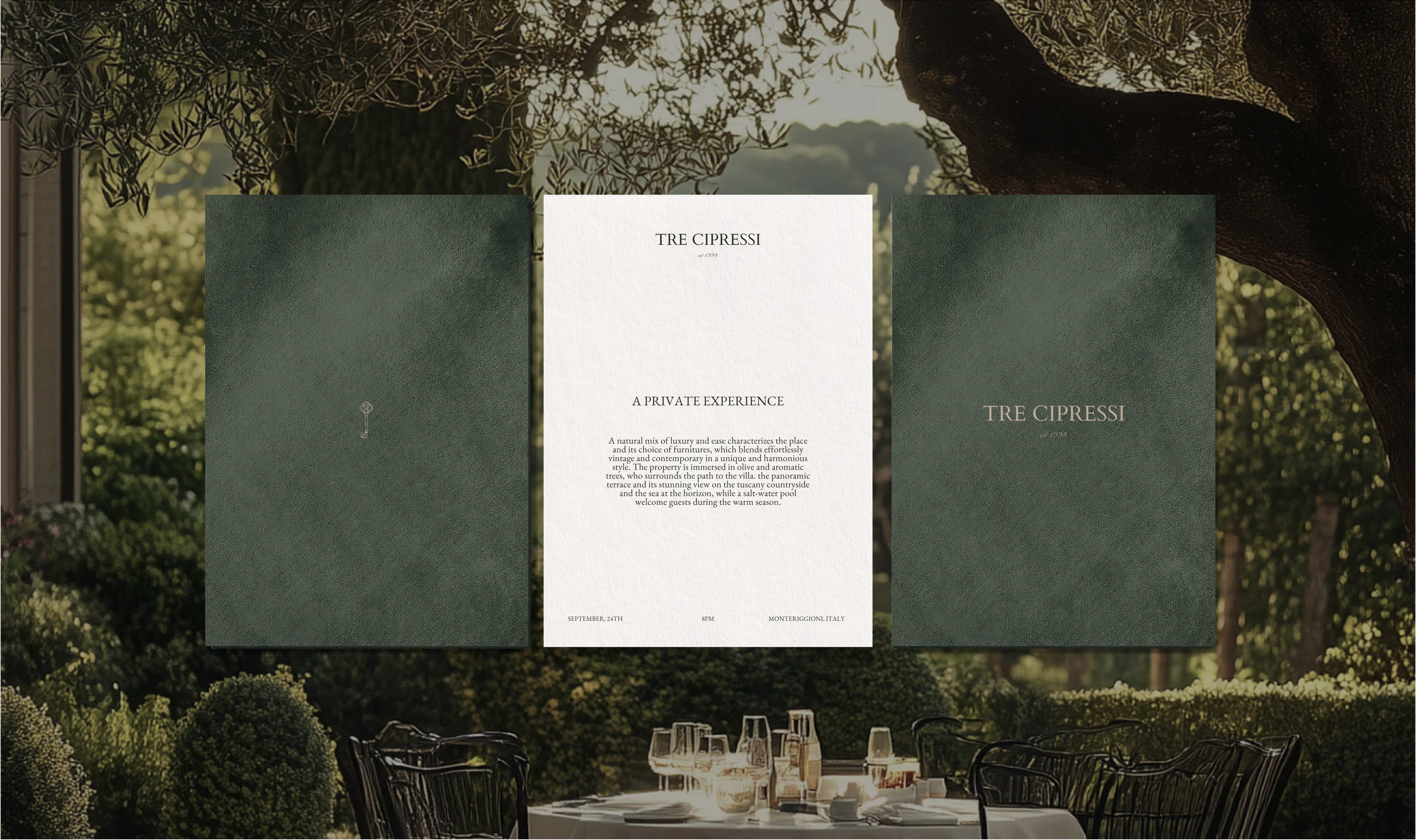 Created a cohesive brand identity for Tre Cipressi, a boutique hotel in Tuscany, Italy, inspired by calm elegance and timeless Italian aesthetics.