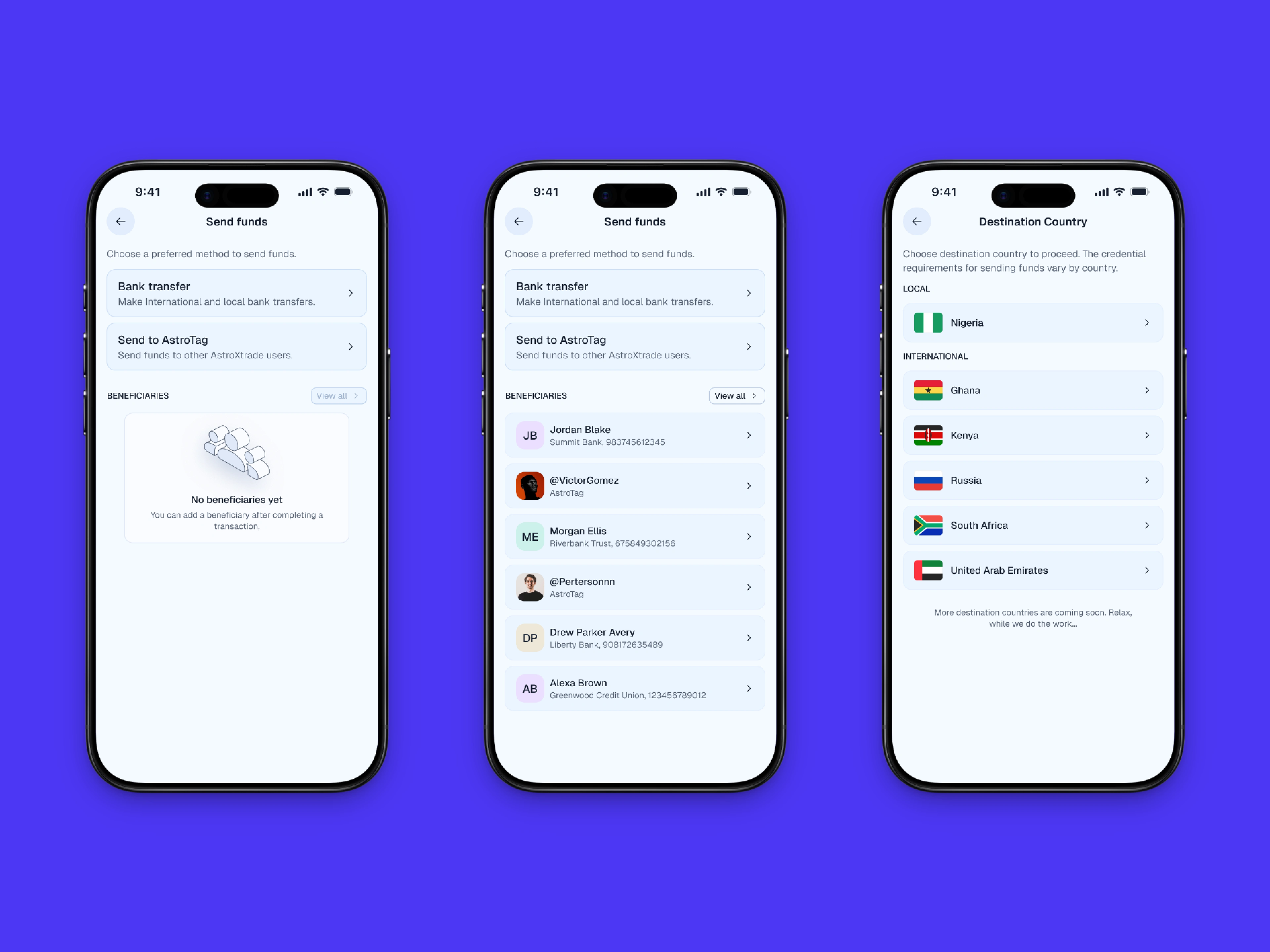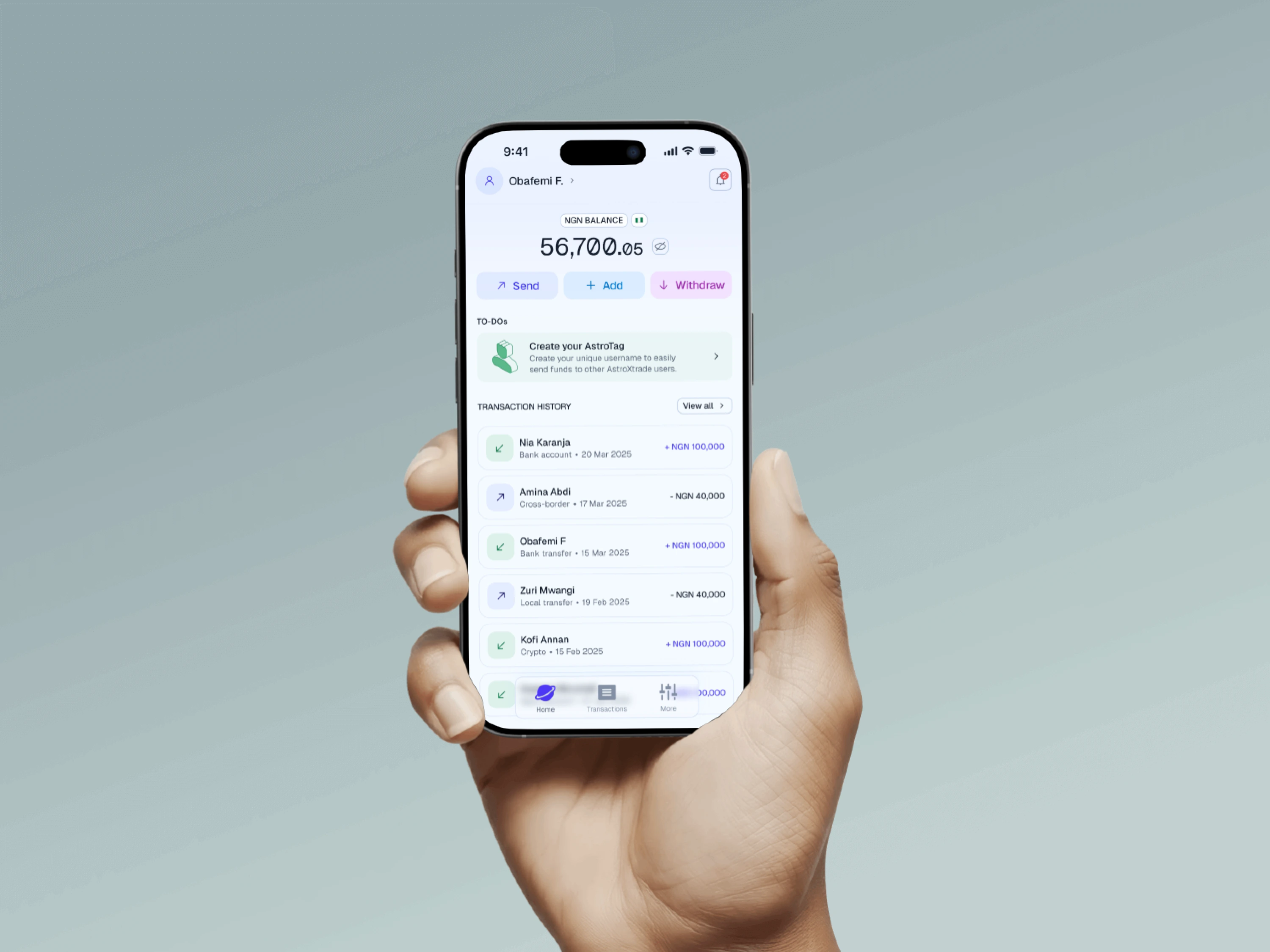 AstroXtrade is a cross-border money transfer app designed to help users send and receive money across Africa and restricted regions such as Eastern Europe. The app supports fiat transfers, card payments, and crypto top-ups (USDT & USDC), with automatic conversion into local currencies.