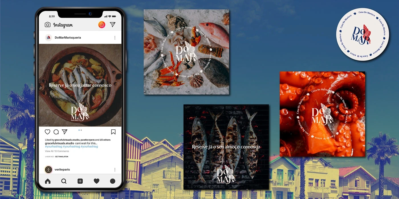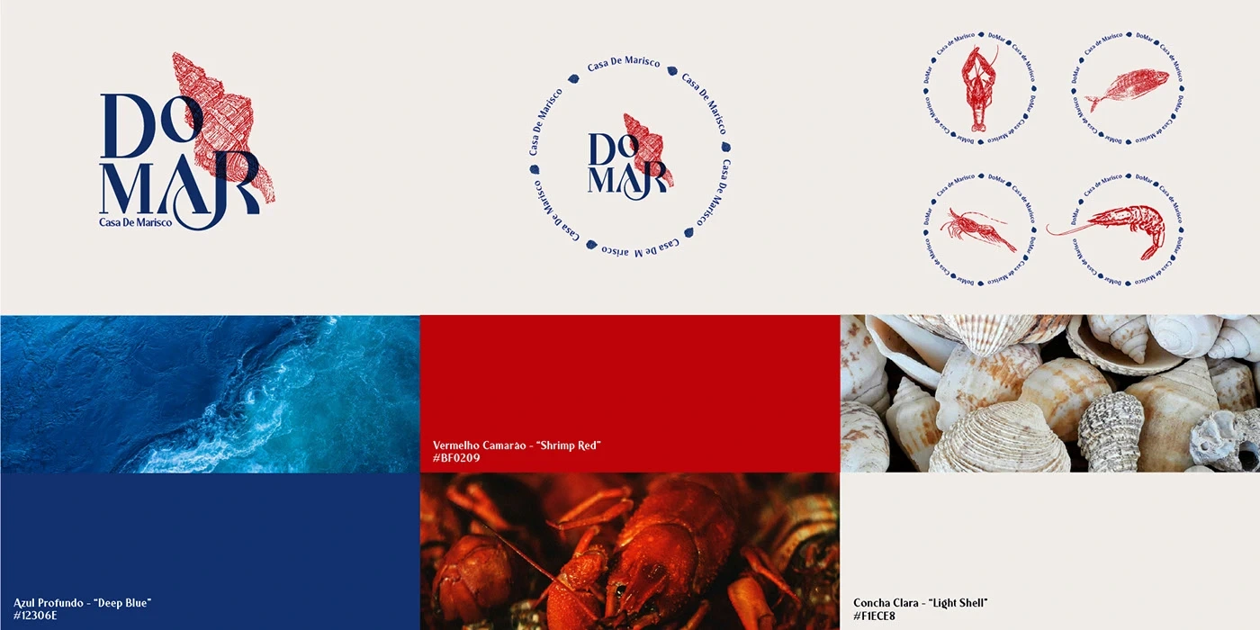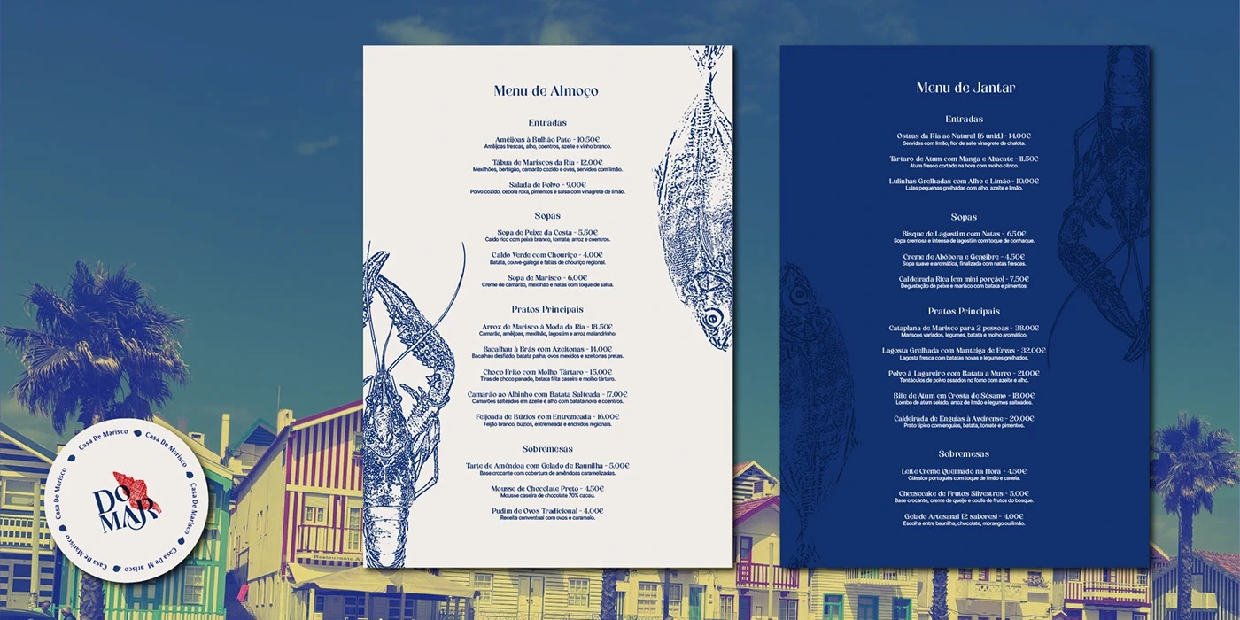 Do Mar Marisqueira is a new seafood restaurant located on the Portuguese coast, aiming to offer a refined yet approachable dining experience that celebrates the region's deep connection to the sea. The client approached me to create a complete visual identity for the brand, including the logo, menus (for both lunch and dinner), takeout packaging, staff uniforms, and social media visuals. The main goal was to craft a cohesive identity that felt modern, elegant, and distinctly maritime—one that would resonate with both locals and tourists looking for a fresh seafood experience.