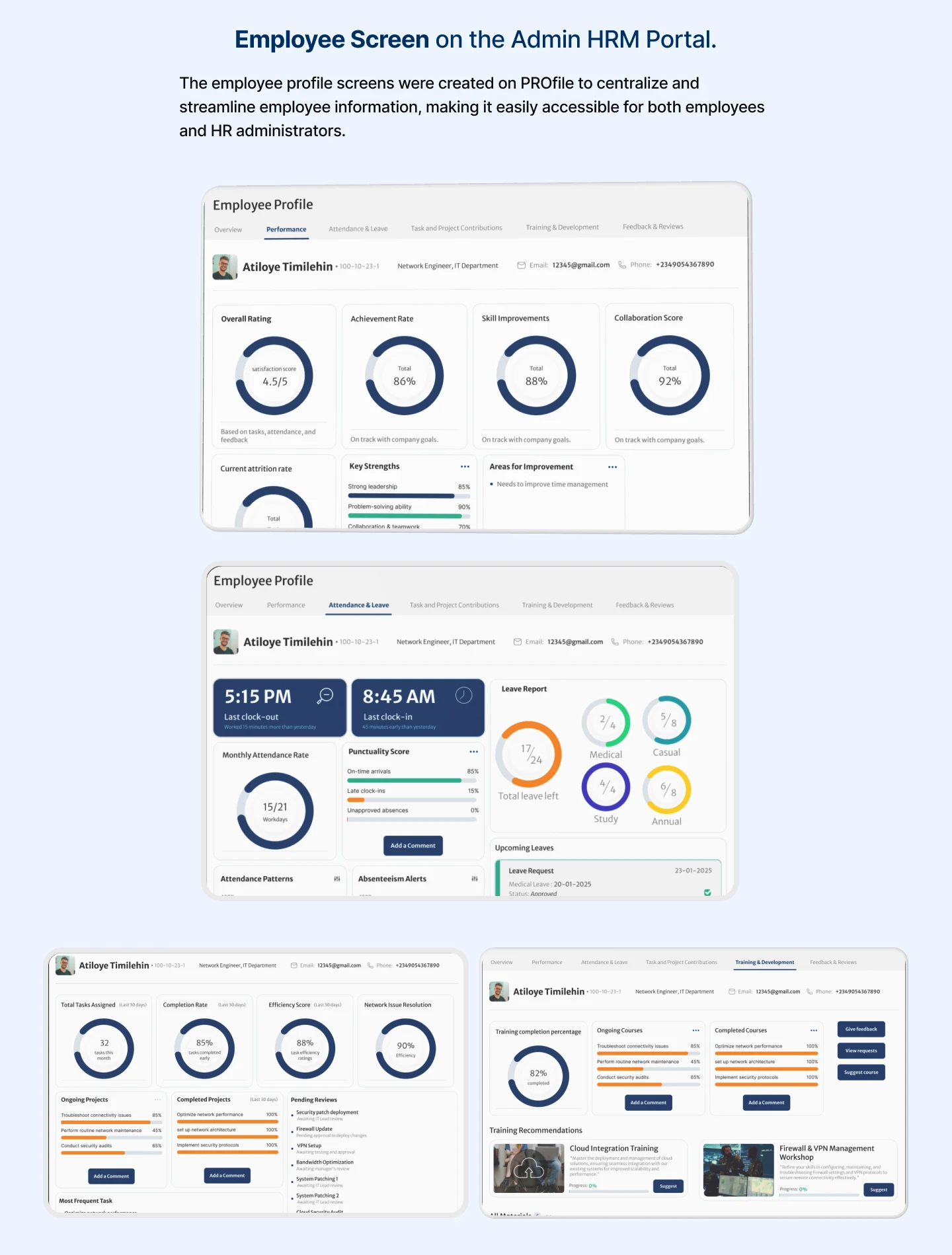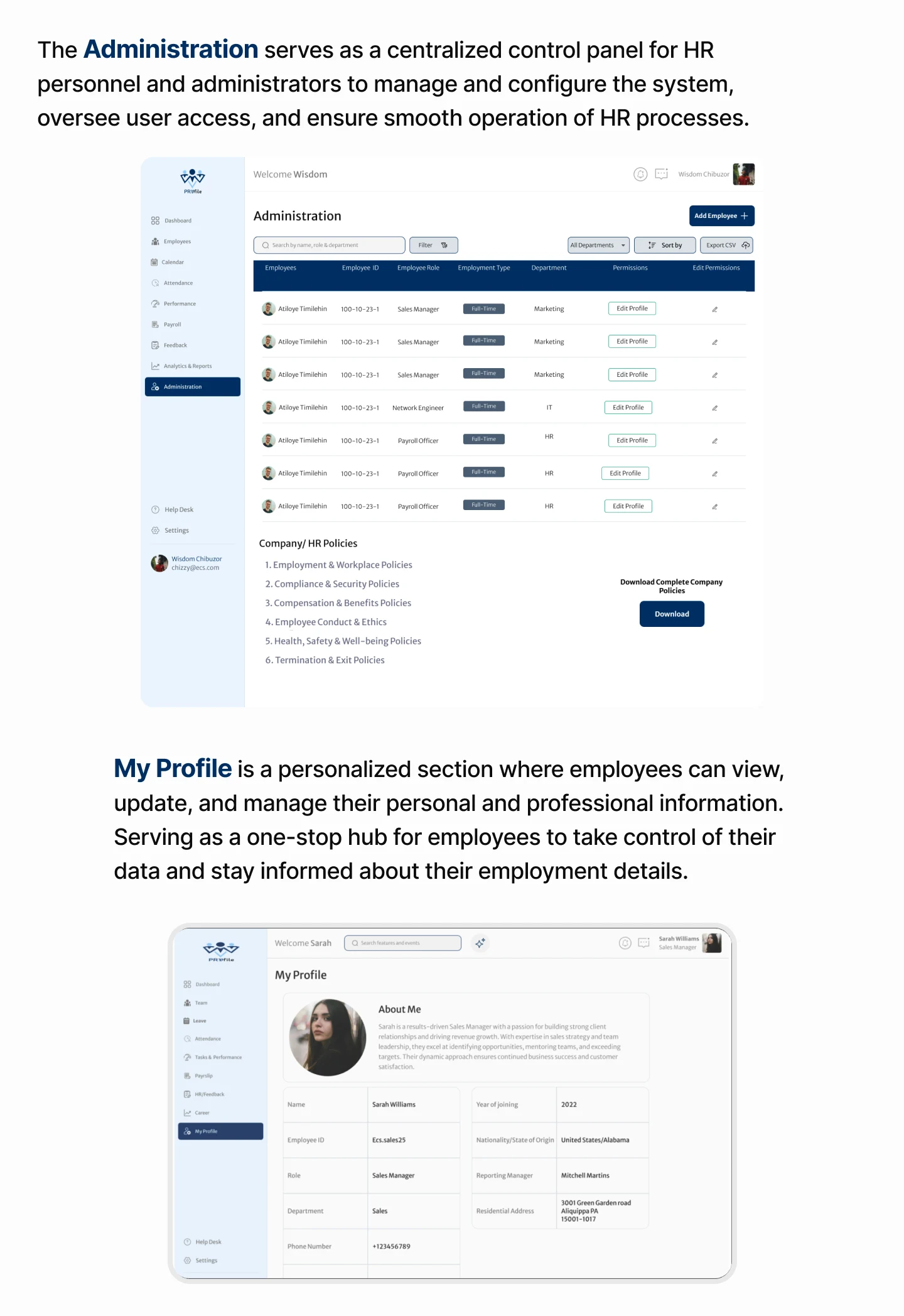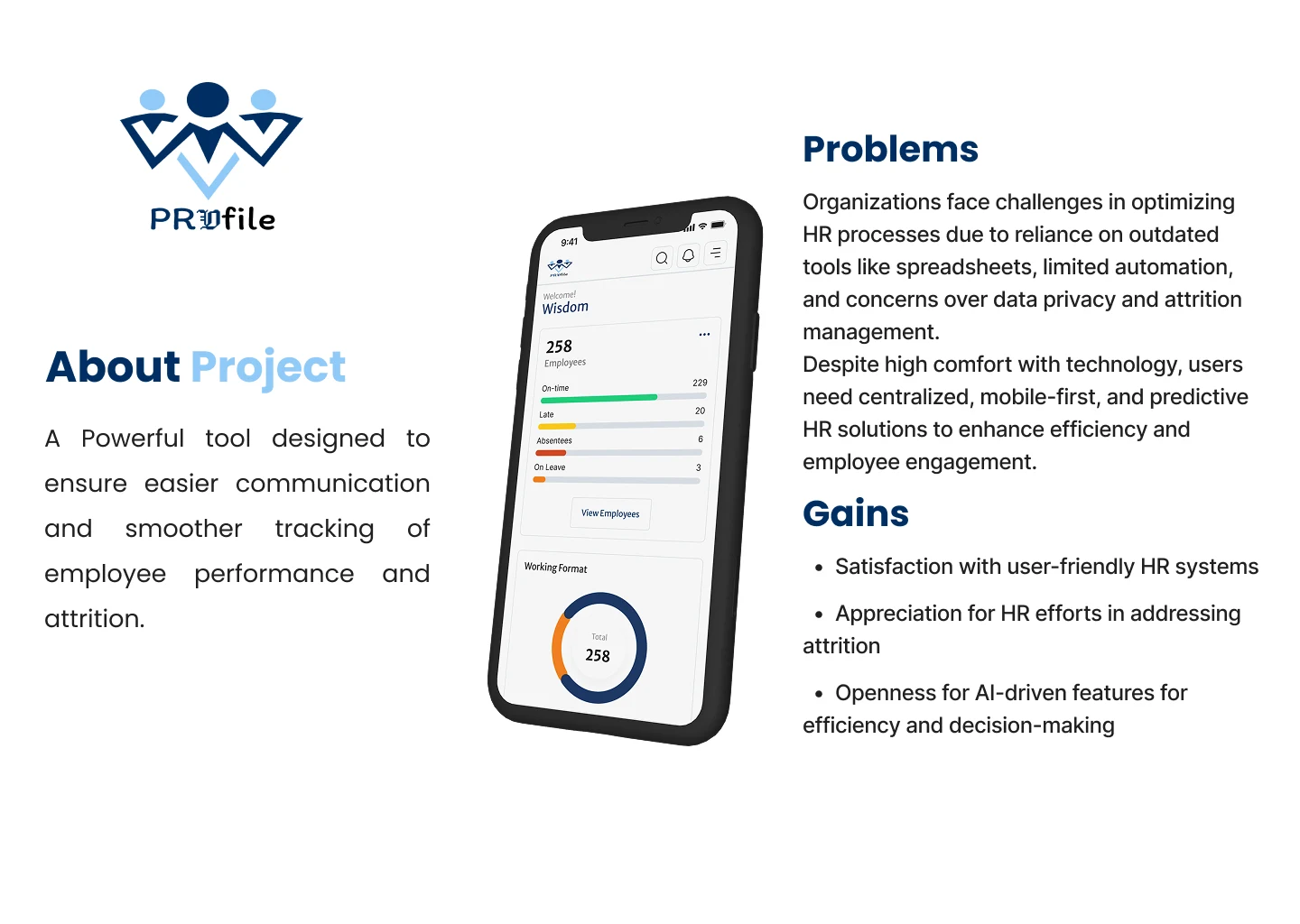 PROfile is an HRM and ESS portal that organizes information, tracks Performance, Attrition and Clock-in, for Employees, HRs and Business Owners
