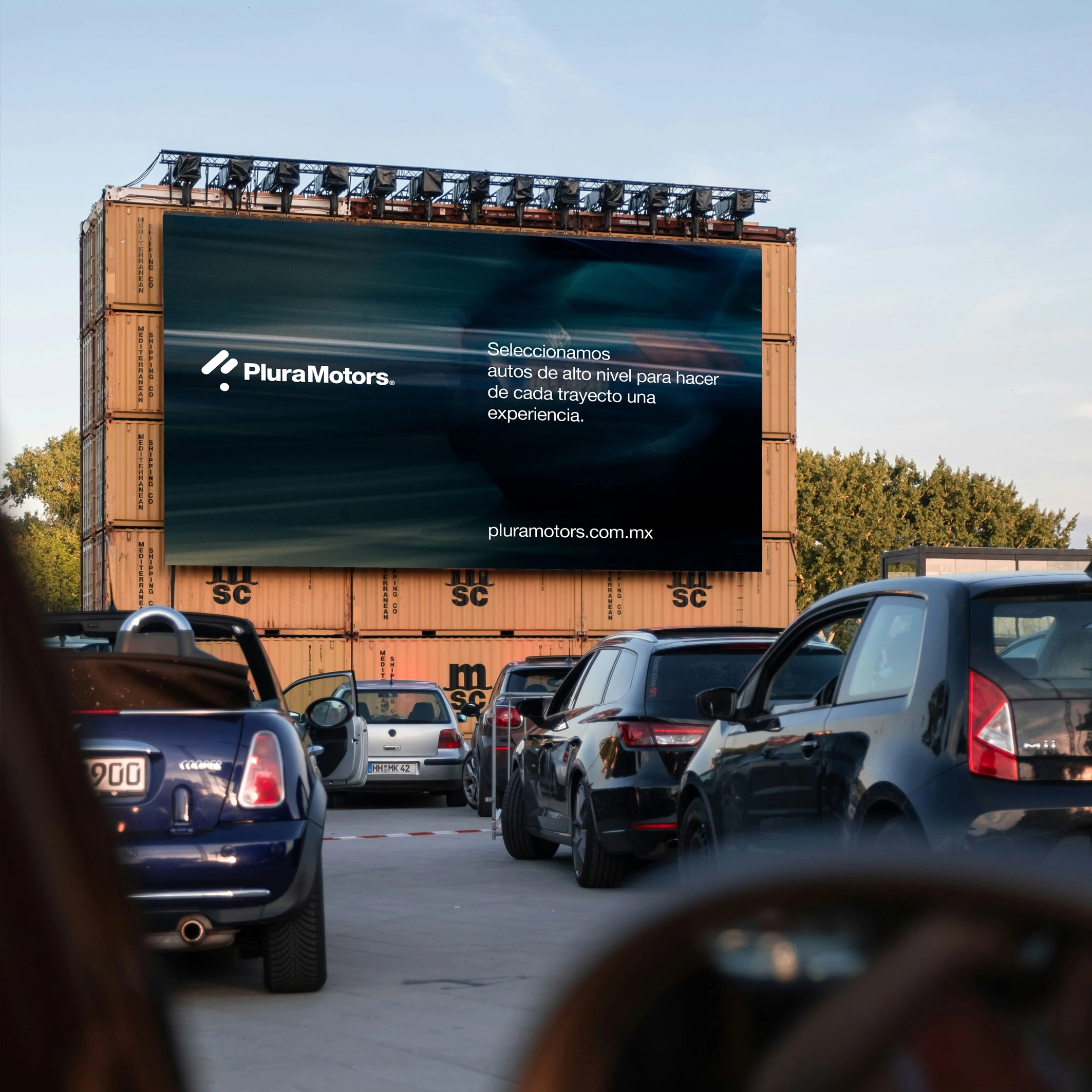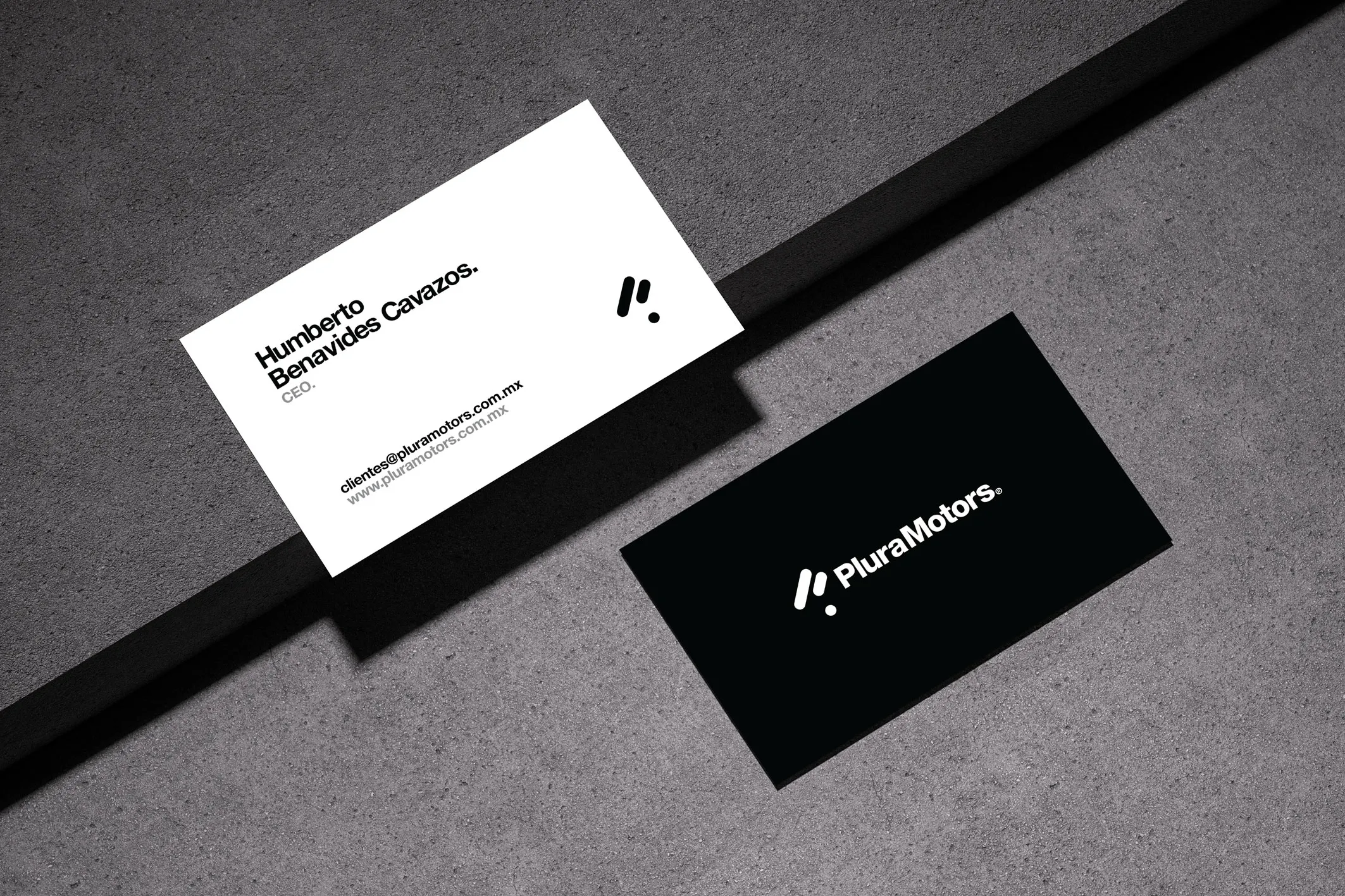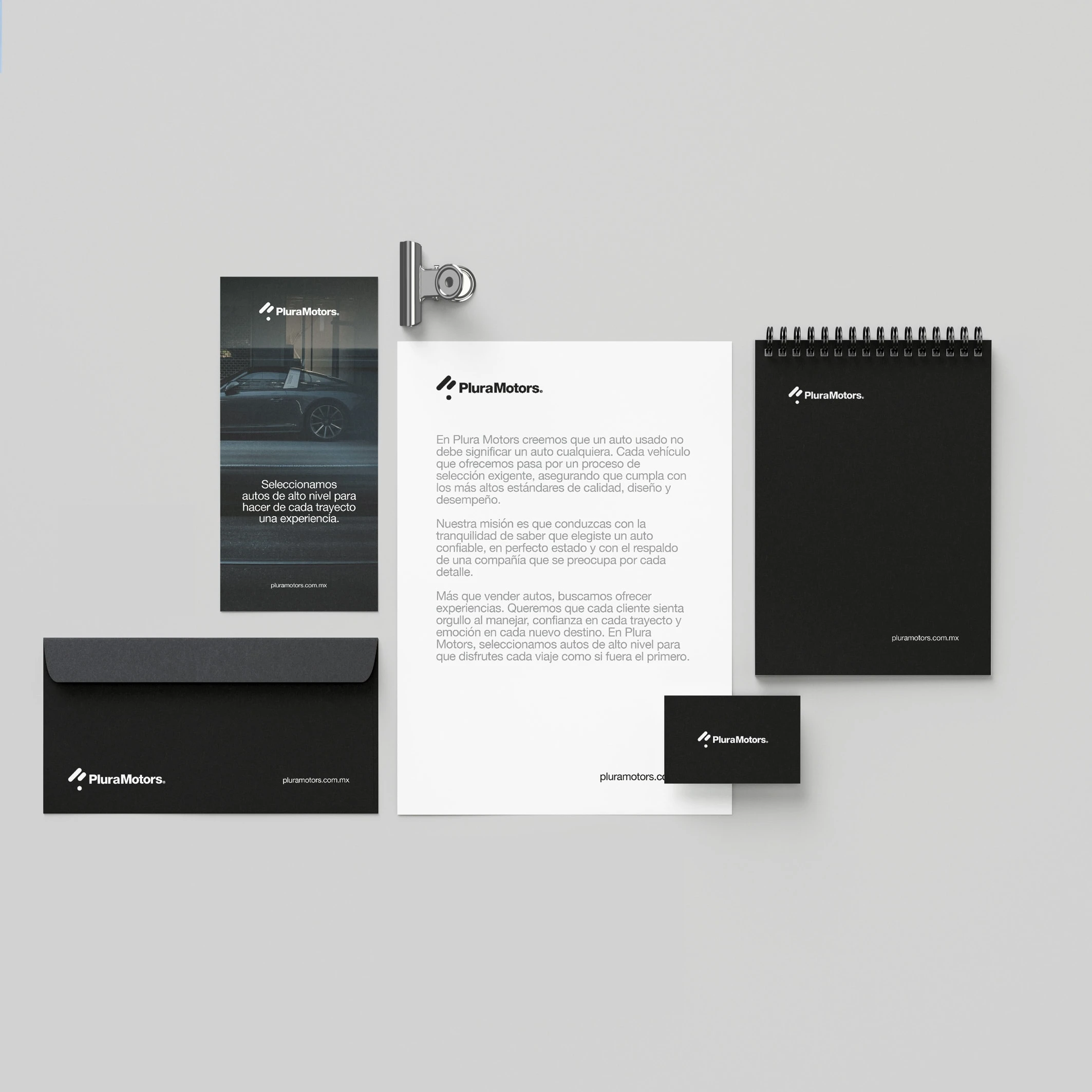 Plura Motors specializes in the purchase and sale of pre-owned vehicles, with a focus on high-end models. The client needed a visual identity that would reflect their vision of strength and simplicity. The solution was a robust, monochromatic, and modular brand design.