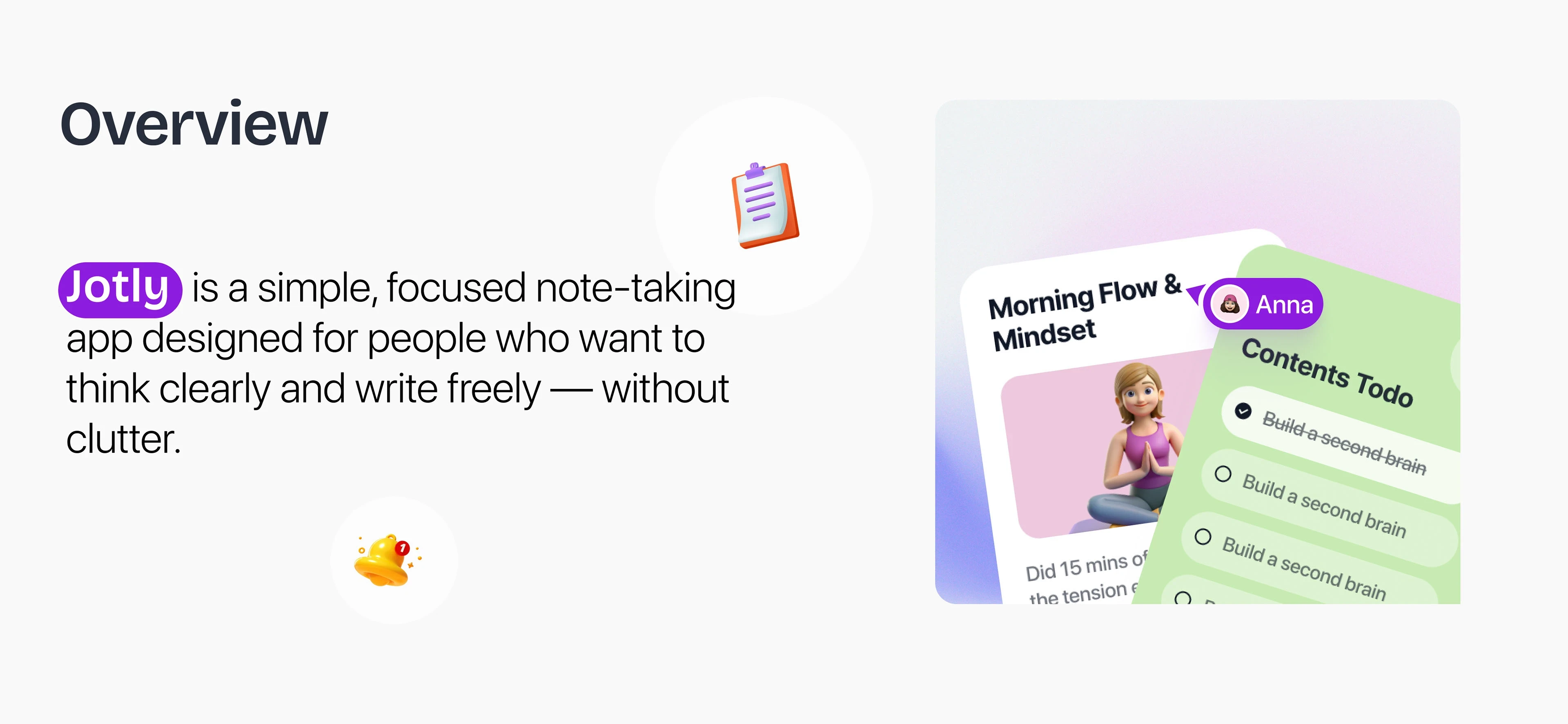 With a minimal, distraction-free design and intuitive navigation, Jotly transforms note-taking into a seamless, inspiring part of your daily workflow.