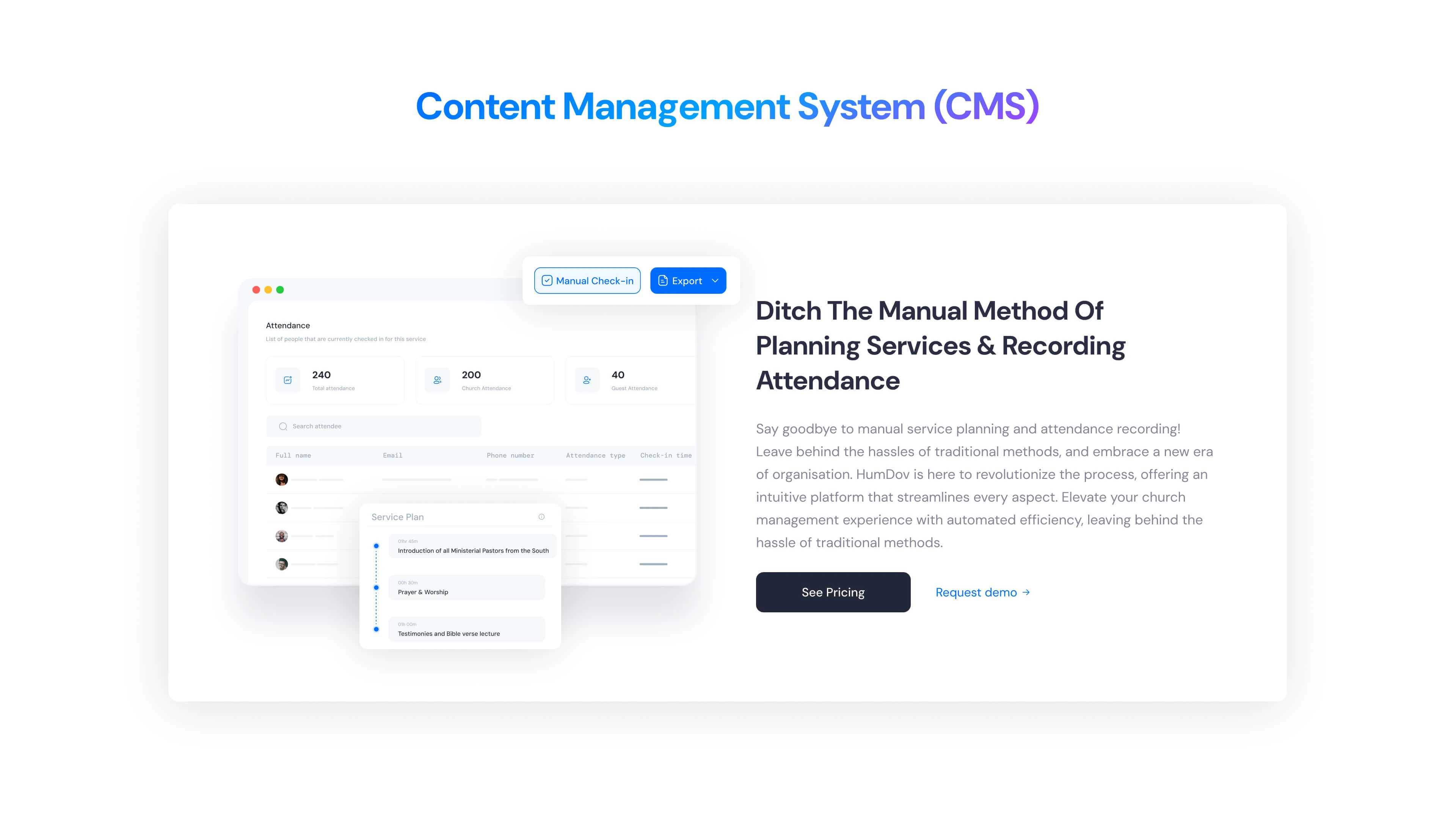 Churches and ministries often struggle to efficiently manage events, handle donations, and maintain meaningful engagement with their members in a digital space. Humdov offers software tools to solve these challenges, but lacks a clear, user-friendly website that communicates its offerings and supports easy onboarding.
