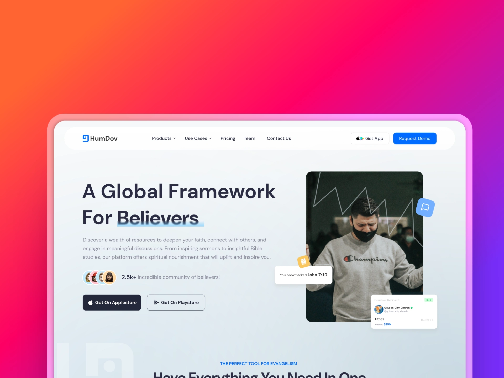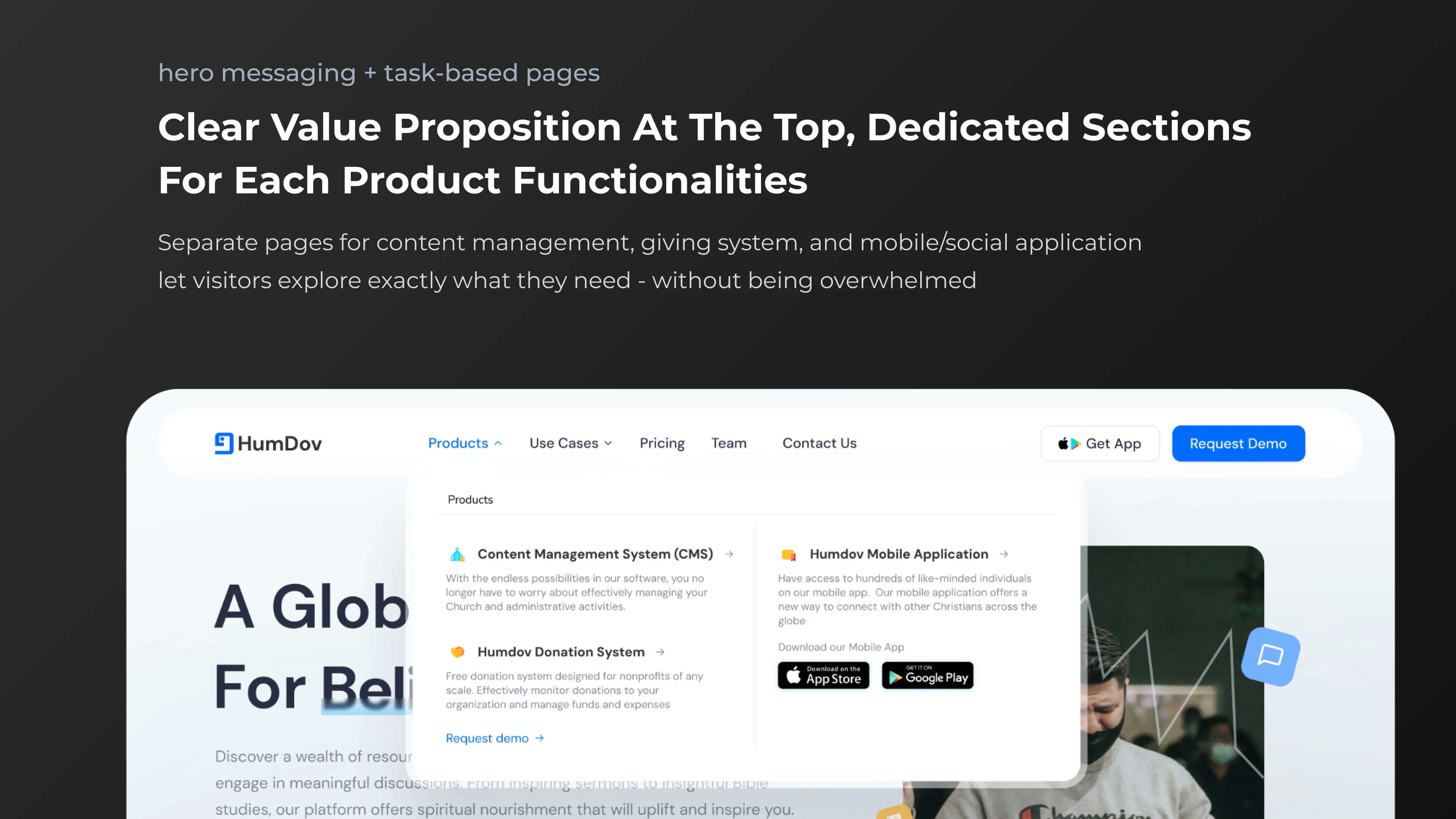 Humdov is a software company that builds tools like CMS, donation systems, and social networking apps to help churches and ministries manage events, receive donations, and connect with members and believers worldwide. My role is to design a website that clearly showcases their products and enables smooth user onboarding