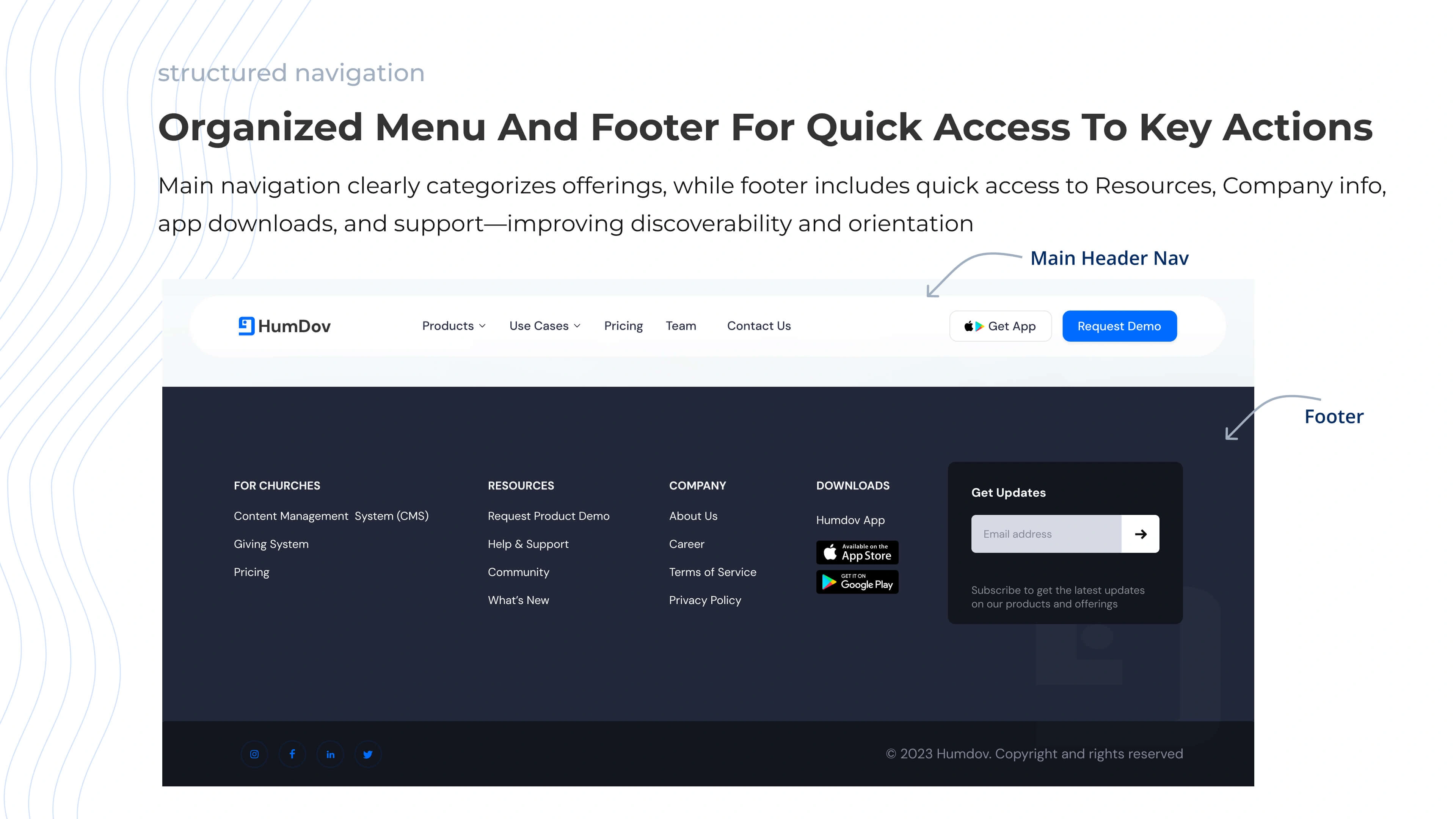 Humdov builds digital tools for churches to manage events, donations, and community. I designed a website to showcase products and streamline onboarding.