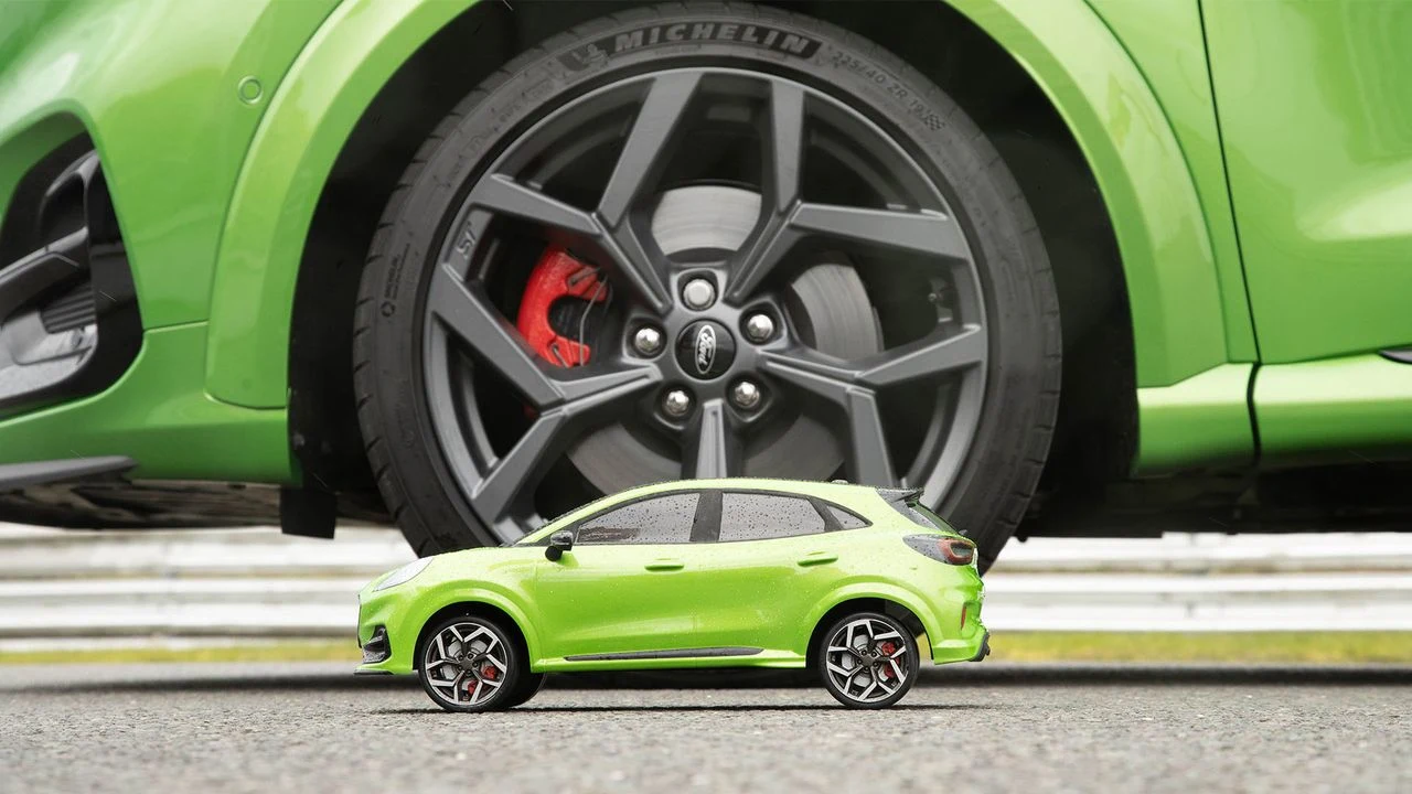 Let’s put its cornering capabilities to the test in a race against itself. Well, actually, against a 1/10th scale radio-controlled RC car replica.