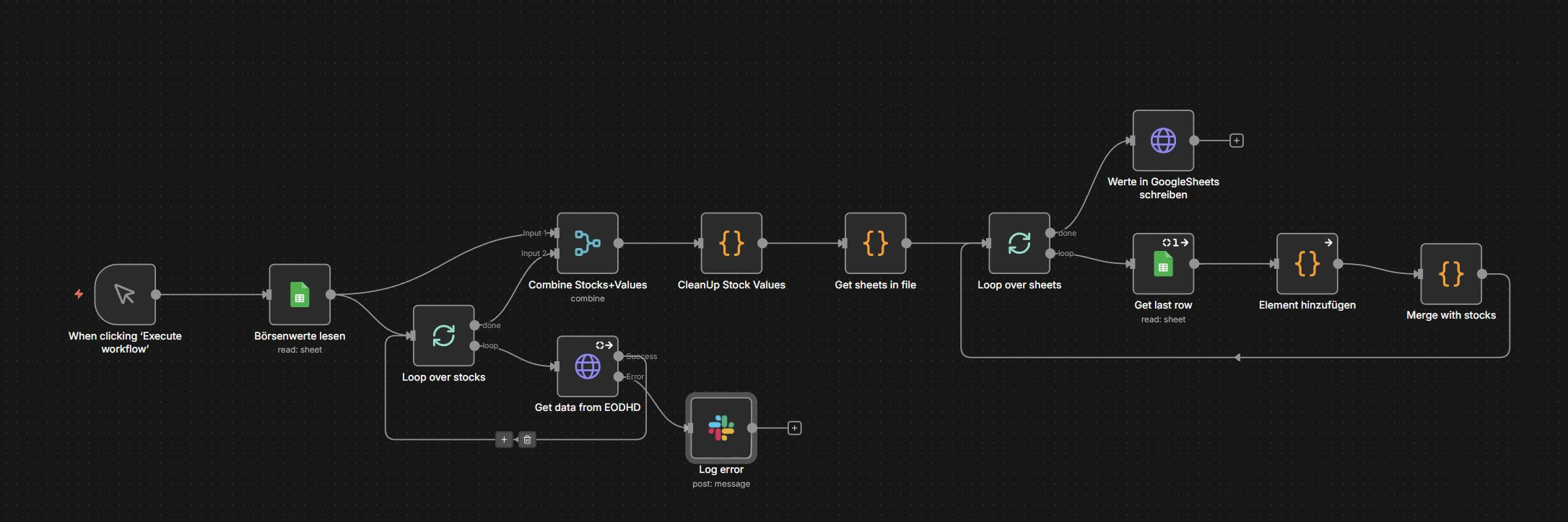 This workflow fetches daily end-of-day stock data from the EODHD API and writes it into a structured Google Sheet, organized by stock and sheet. It supports multiple stocks across different sheets, automatically identifies the correct row and columns for each entry, and handles missing data gracefully. Built with robust error handling, batch processing, and dynamic routing, it’s designed for scalable, reliable financial data tracking.