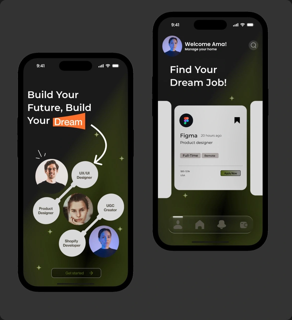Onboarding Screen: Interactive career path visual showing roles like UX/UI Designer, Product Designer, UGC Creator, and Shopify Developer. Encourages users to explore their dream career with a clear CTA (“Get started”).