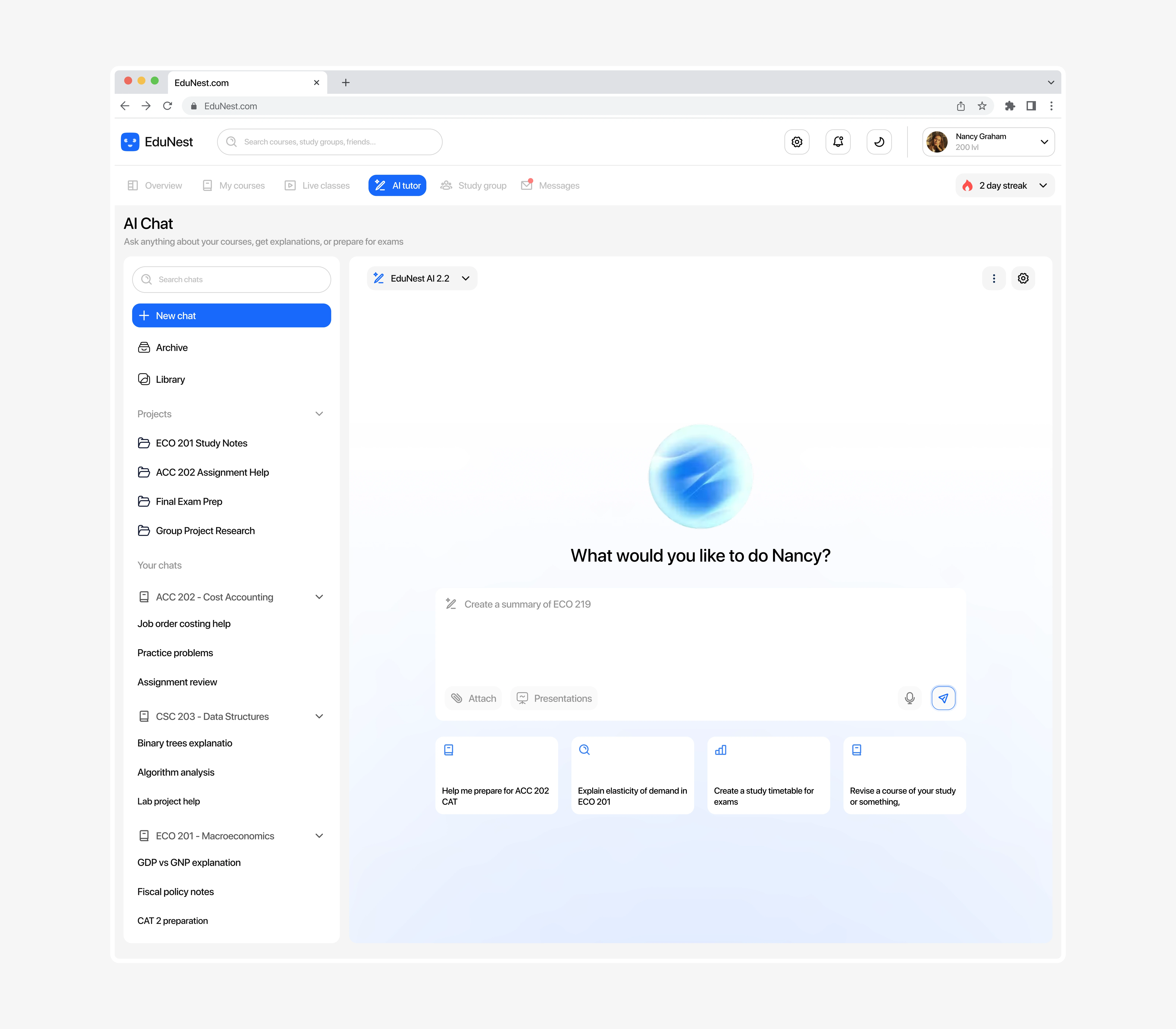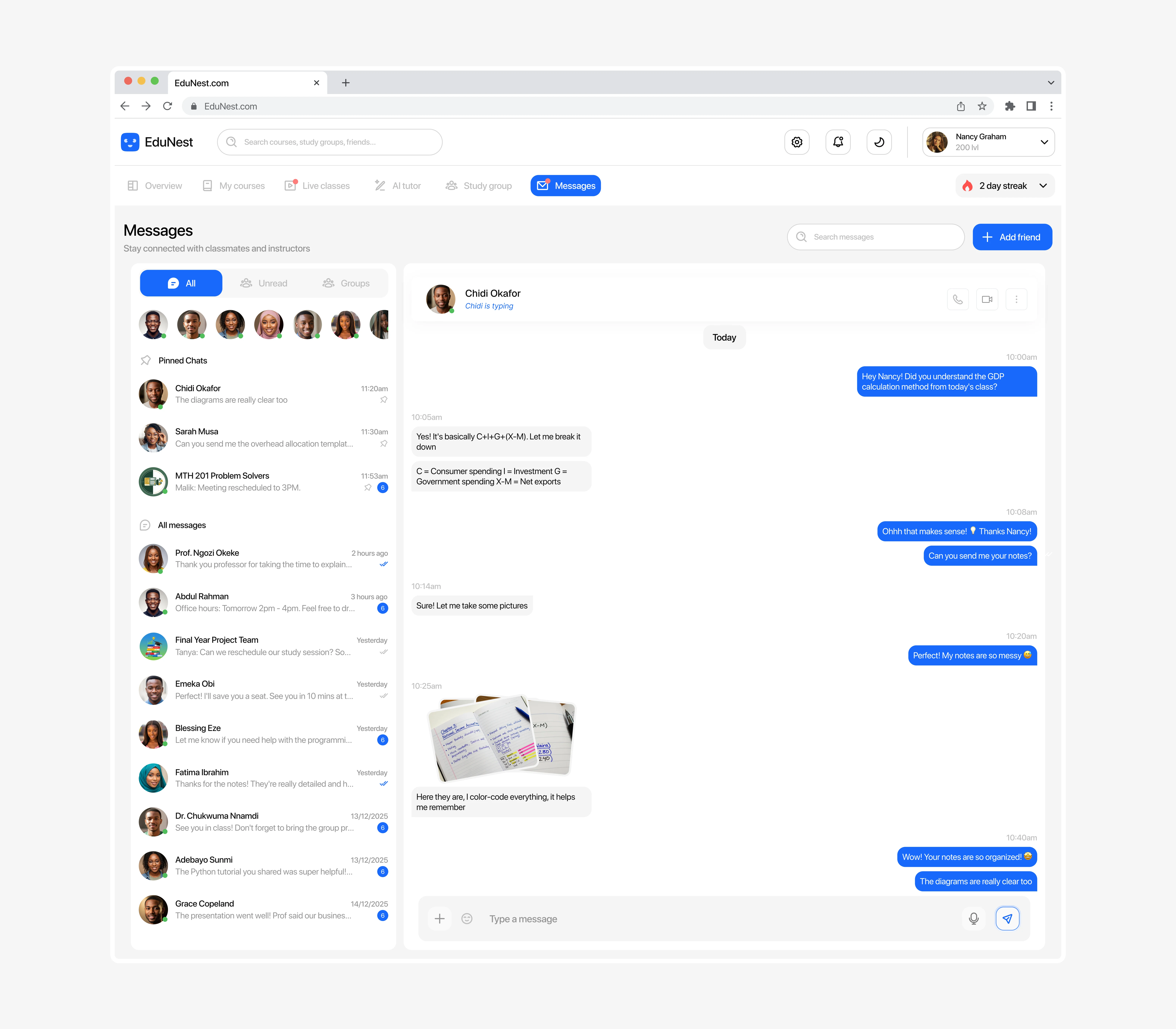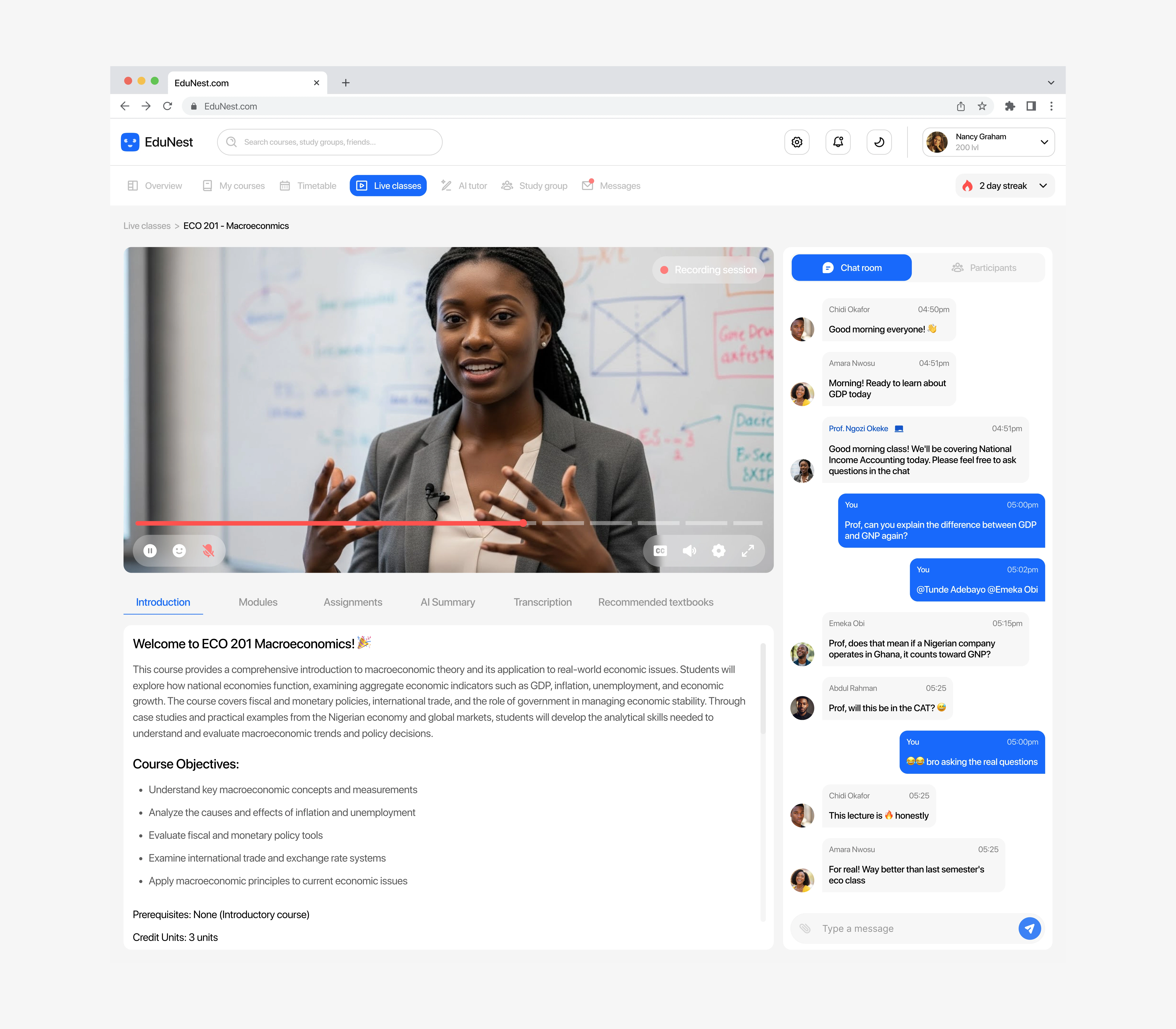 AI Tutor - Help That Knows Your Curriculum : Unlike generic chatbots, this AI understands each student's specific courses and materials. It explains concepts using the exact content from Prof. Ngozi's lectures, generates practice problems aligned with the curriculum, creates personalized study guides, and even explores topics beyond the syllabus when students want to dig deeper. All conversations stay organized by course and topic.