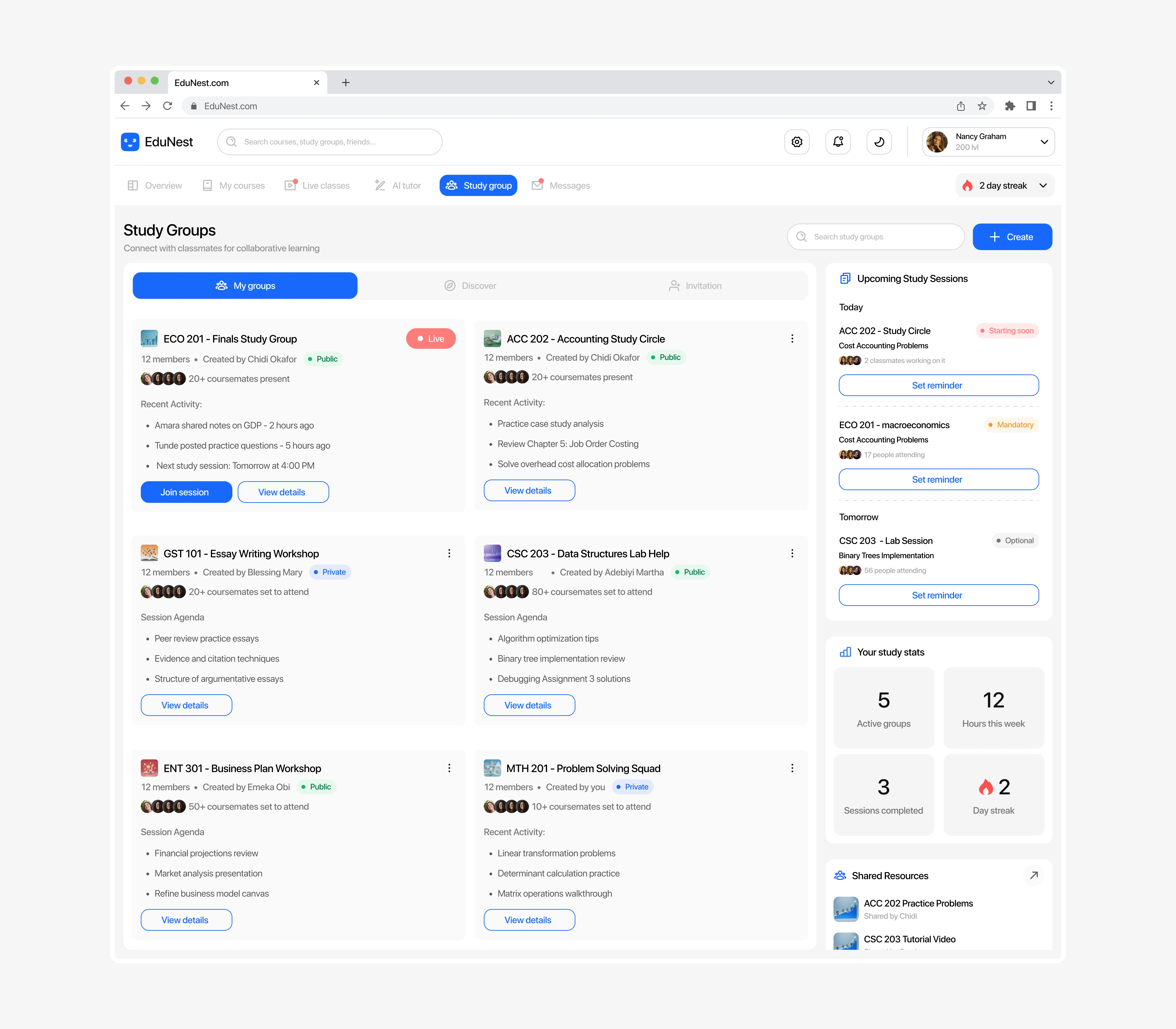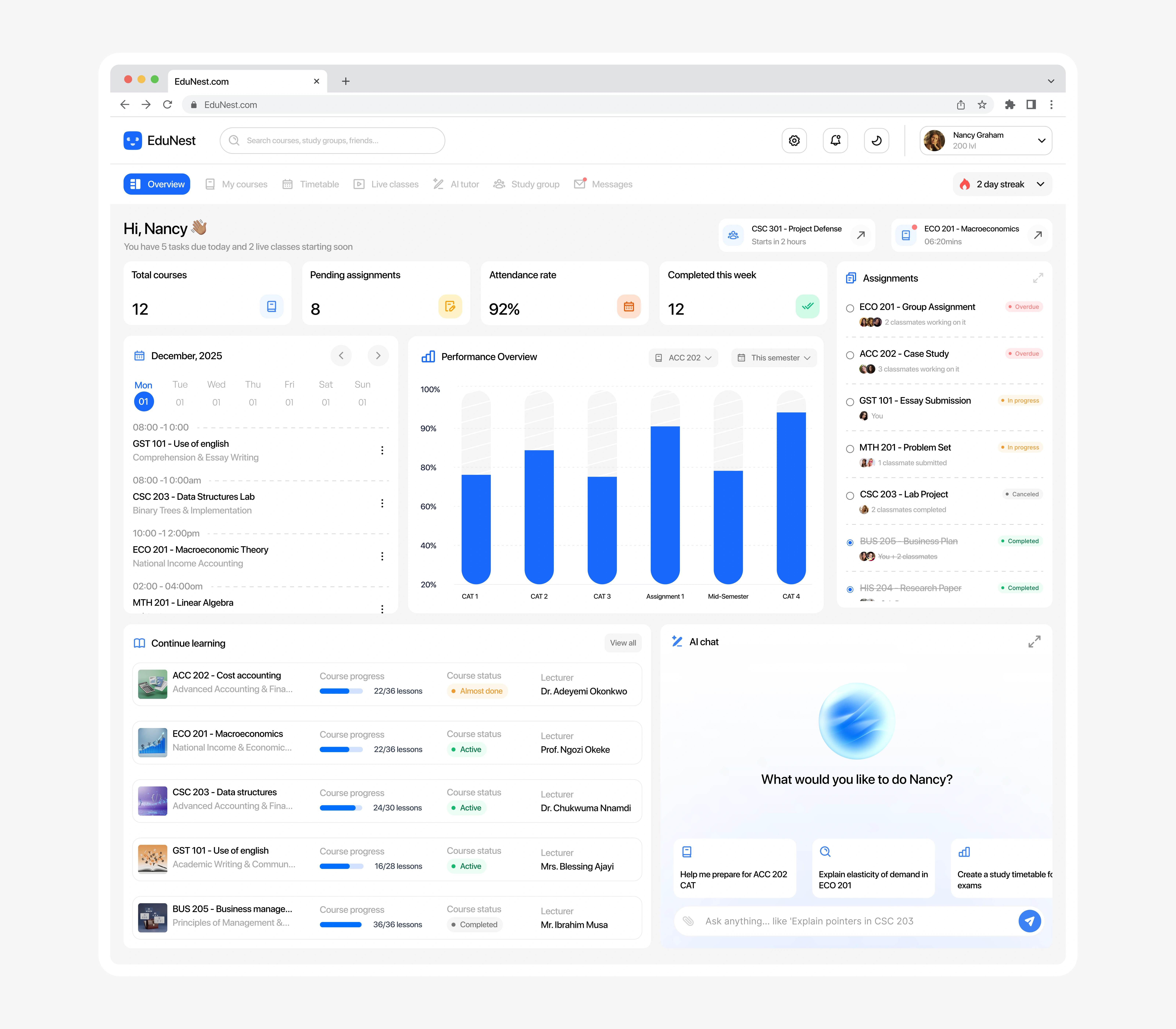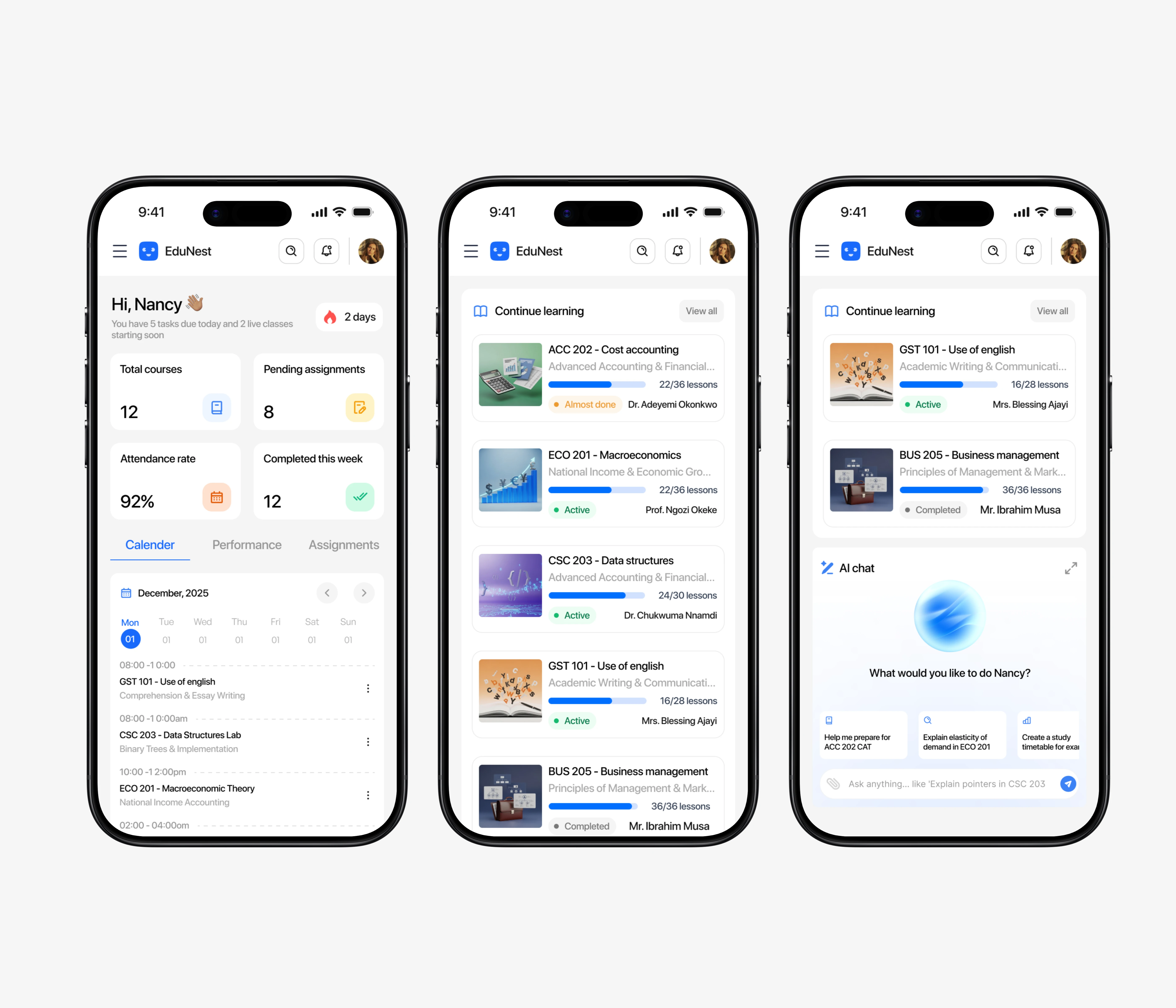 AI Tutor - Help That Knows Your Curriculum : Unlike generic chatbots, this AI understands each student's specific courses and materials. It explains concepts using the exact content from Prof. Ngozi's lectures, generates practice problems aligned with the curriculum, creates personalized study guides, and even explores topics beyond the syllabus when students want to dig deeper. All conversations stay organized by course and topic.