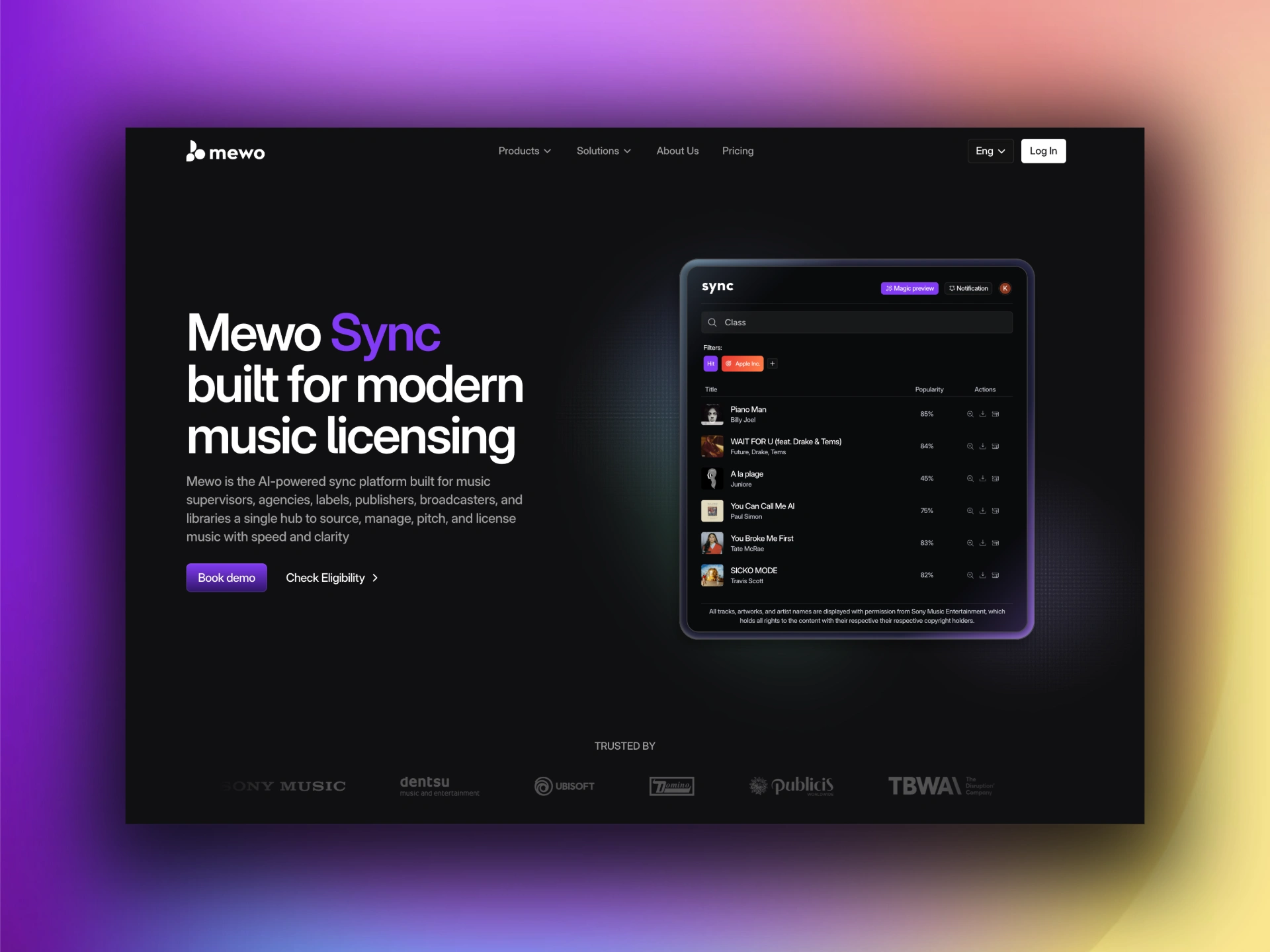 Built Mewo's website, a B2B music sync platform used by Publicis, Dentsu & Ubisoft. We handled design, dev, animation & copy.