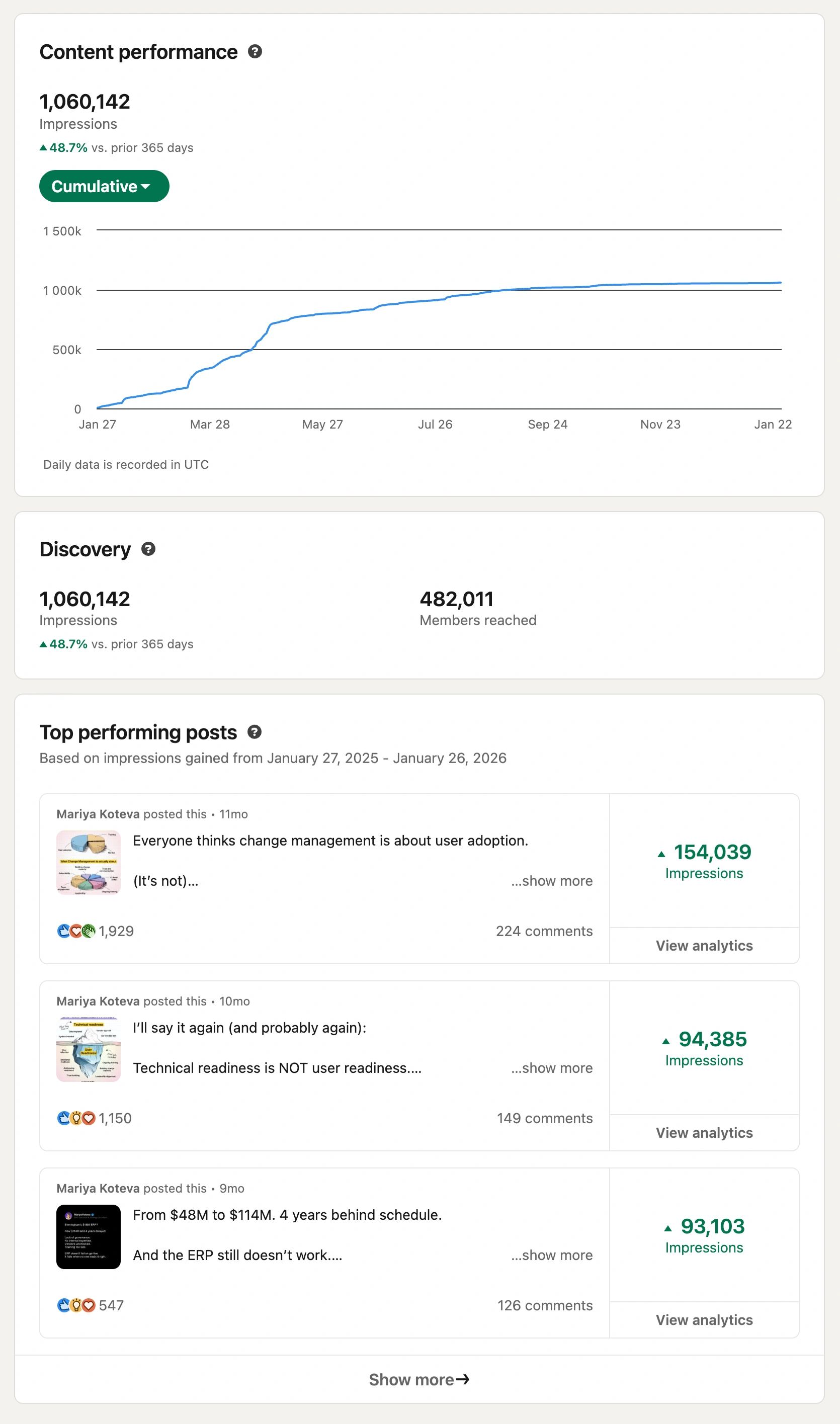 We started by identifying her unique unfair advantage, and built a positioning strategy around it. I developed a consistent posting plan focused on recurring themes and educational infographics, while optimizing her full LinkedIn profile to align with her new positioning. Together, we set clear KPIs: doubling her followers, securing speaking invitations, and testing audience fit for a new lead magnet.
