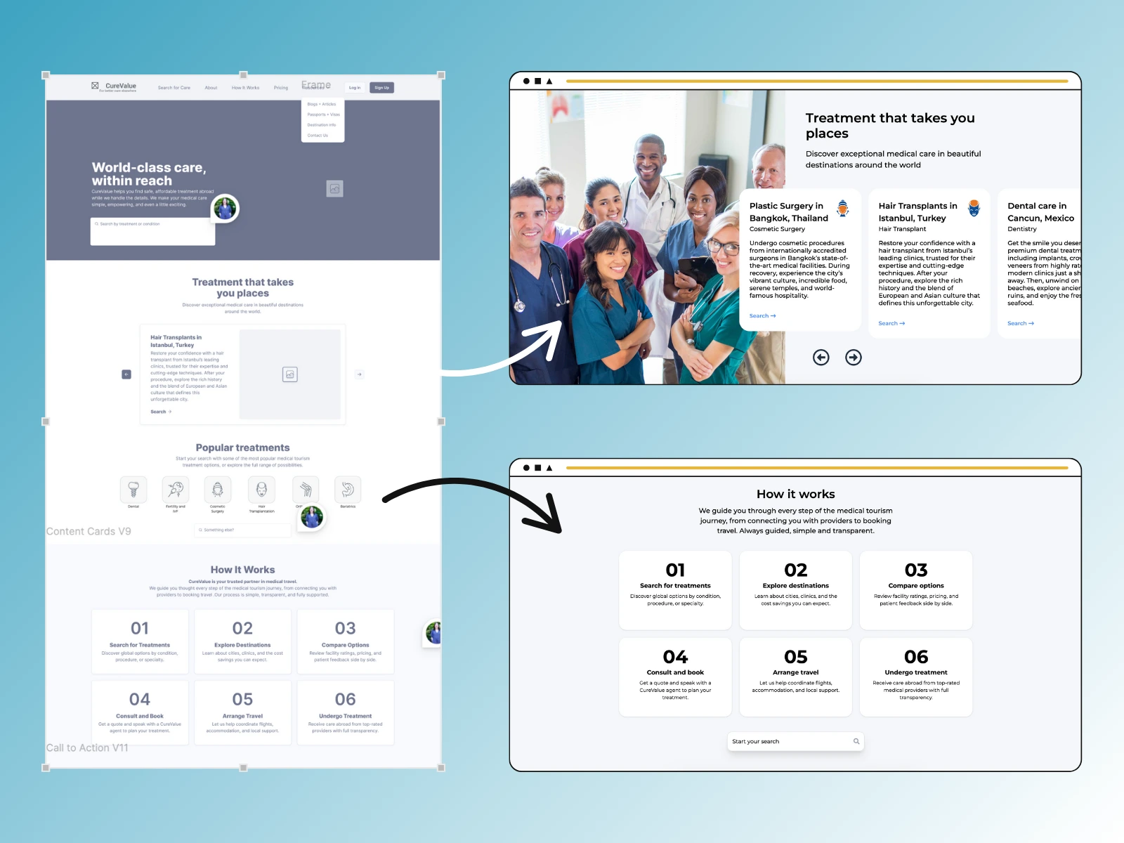 CureValue.org is a platform allowing people interested in medical tourism to search for treatments, doctors, and facilities, and receive personalized support and guidance in planning and booking their travel and medical care. The challenges to address included: