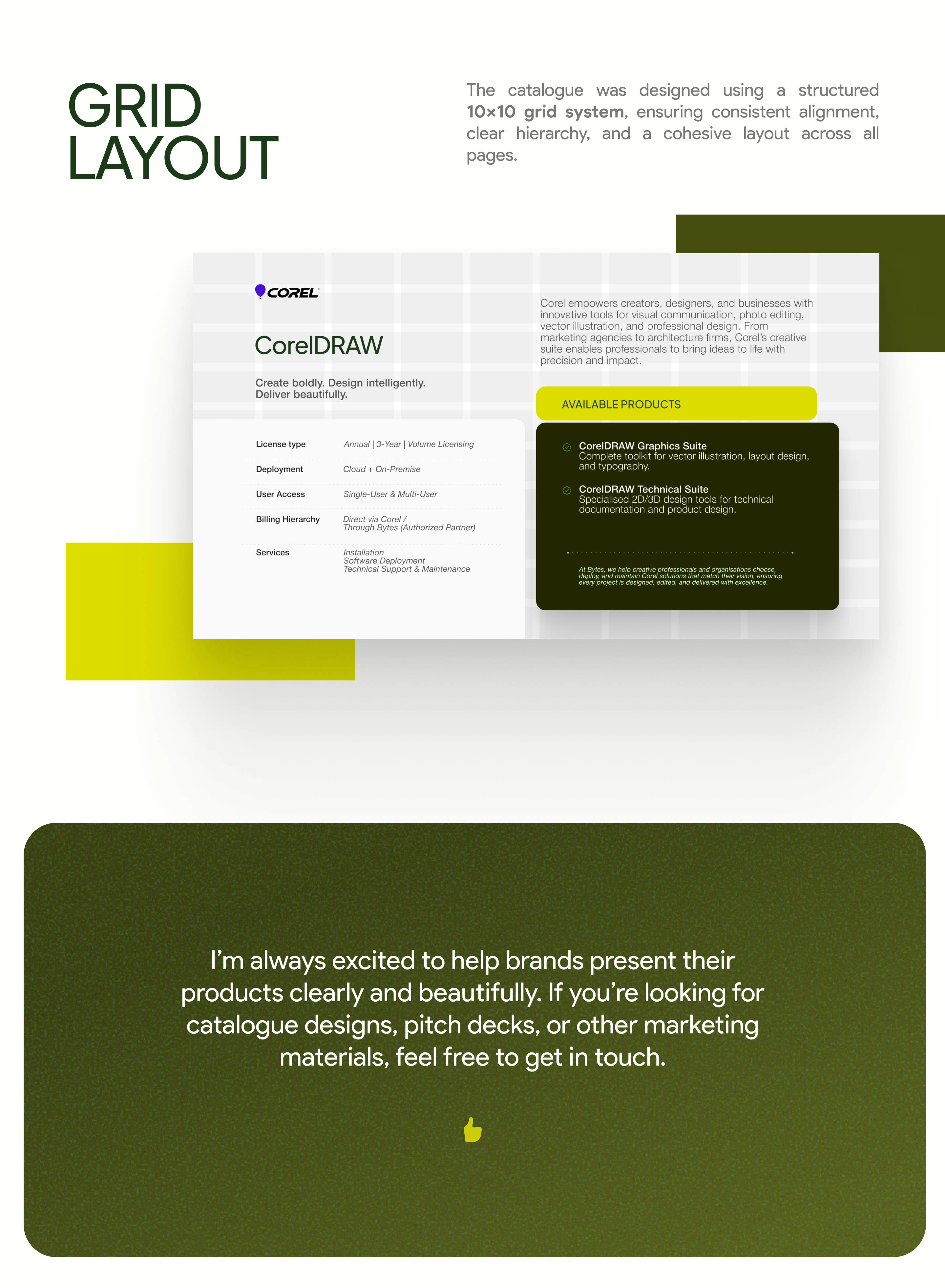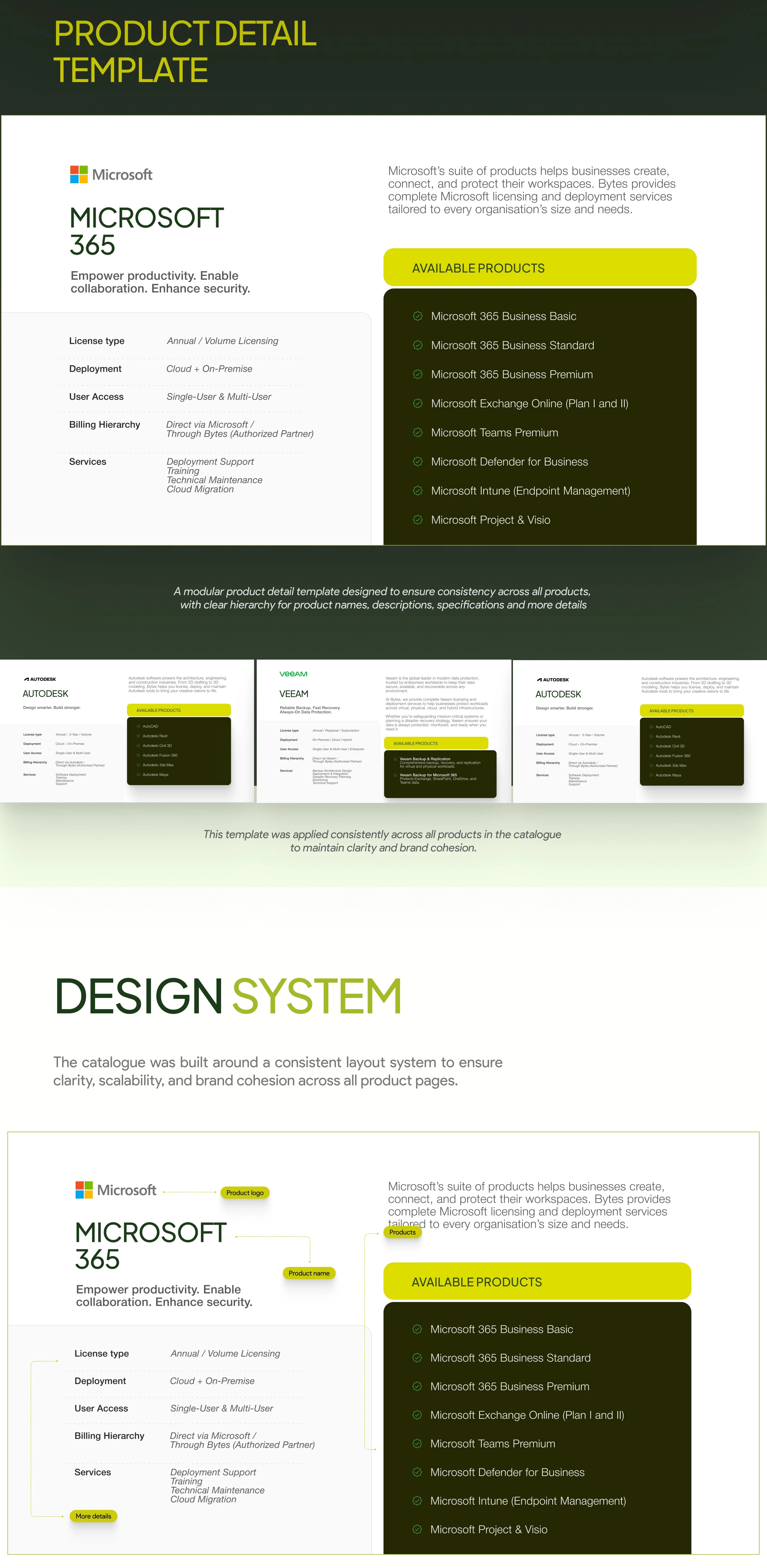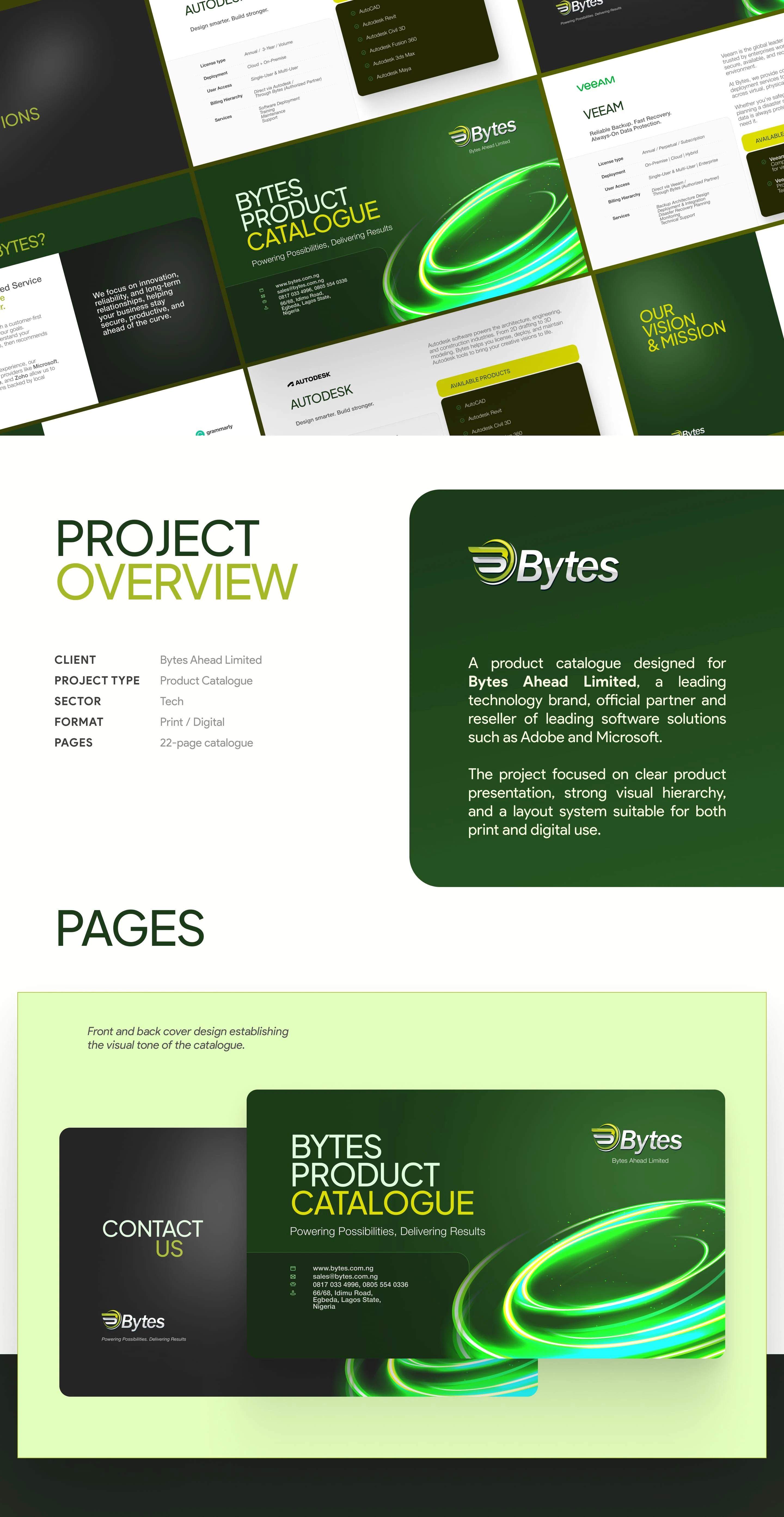 A thoughtfully designed product catalogue for Bytes Ahead Limited, a technology brand and official partner of Adobe and Microsoft. The project focused on creating a modular product detail template applied across all pages, ensuring clarity, consistency, and scalability. The catalogue system makes it easy to present products, available tiers, and key information, while maintaining a cohesive visual identity.
