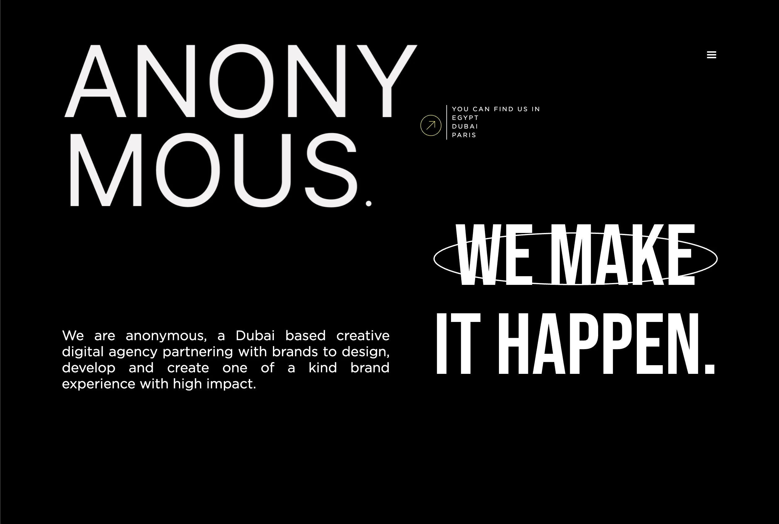 ANONYMOUS is a creative agency with offices in Cairo, Dubai, and Paris, specializing in branding, content creation, animation, and campaign strategy. The agency wanted a bold, minimalist website to mirror its confident visual identity and communicate its global presence.