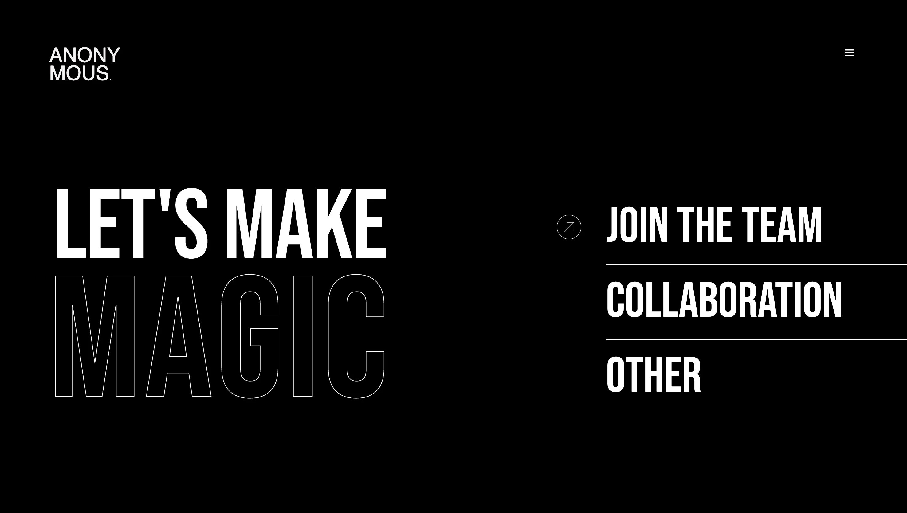 Showcase ANONYMOUS’ creative identity — sharp typography, bold contrast, and stripped-down UI that focuses attention on words and motion.