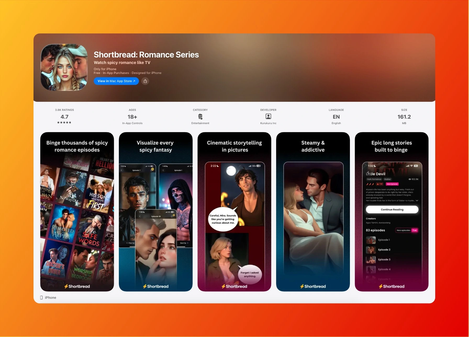 Shortbread is a premium interactive romance-story app designed for binge readers. It offers thousands of spicy romance episodes, cinematic illustrations, and long-form storytelling built like a visual TV series.