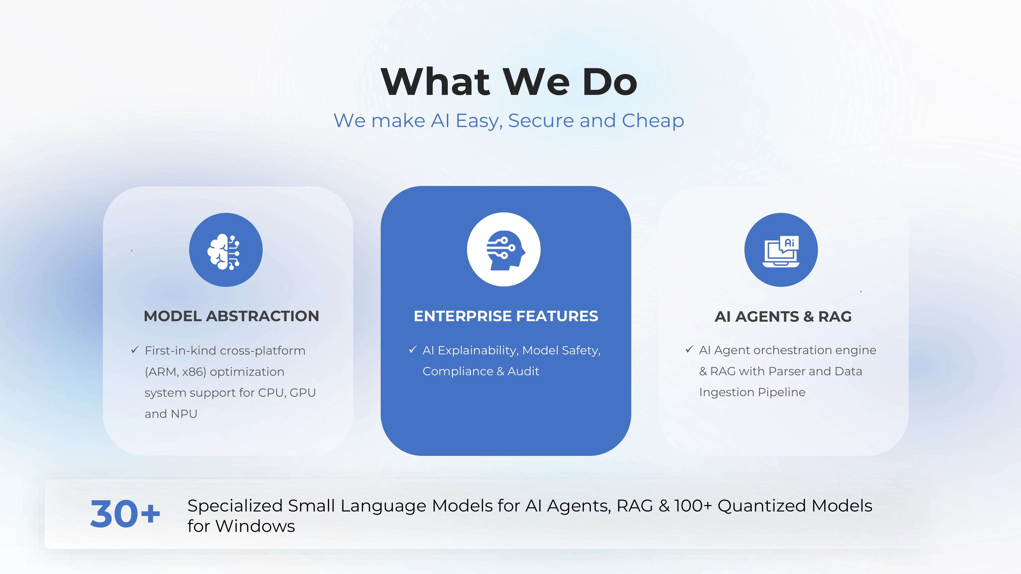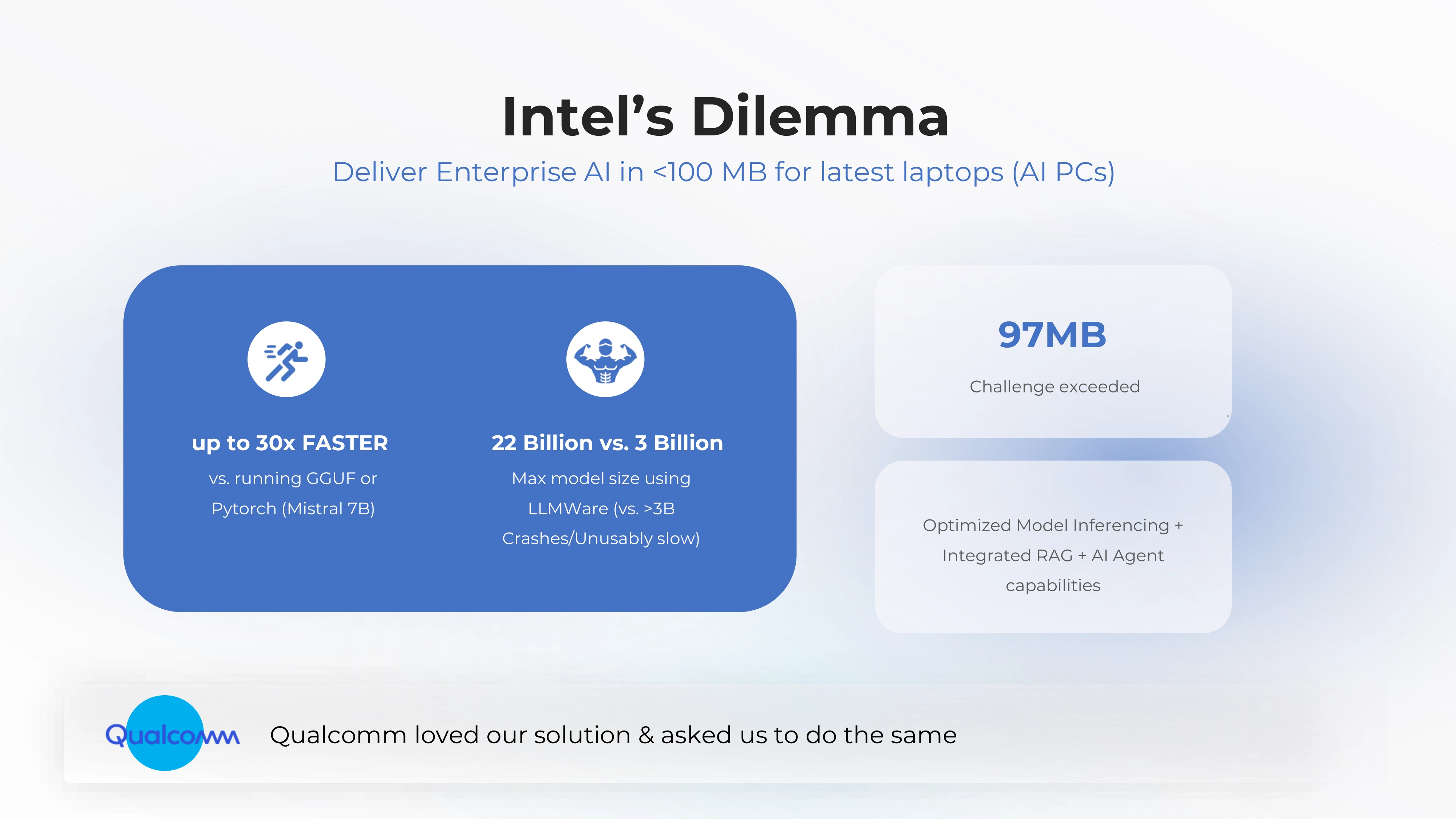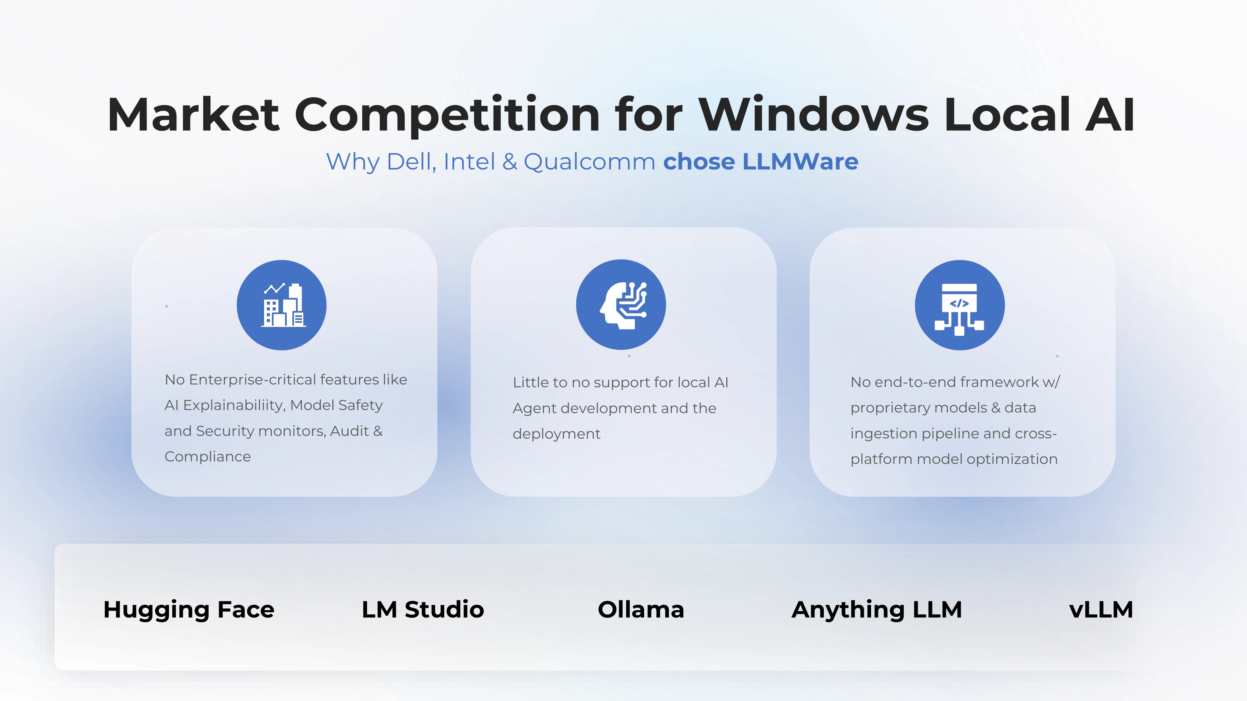 Designed an investor-ready pitch deck for LLMWare AI's SLM platform, showcasing local AI agents, small language models, and 100+ quantized models for Windows
