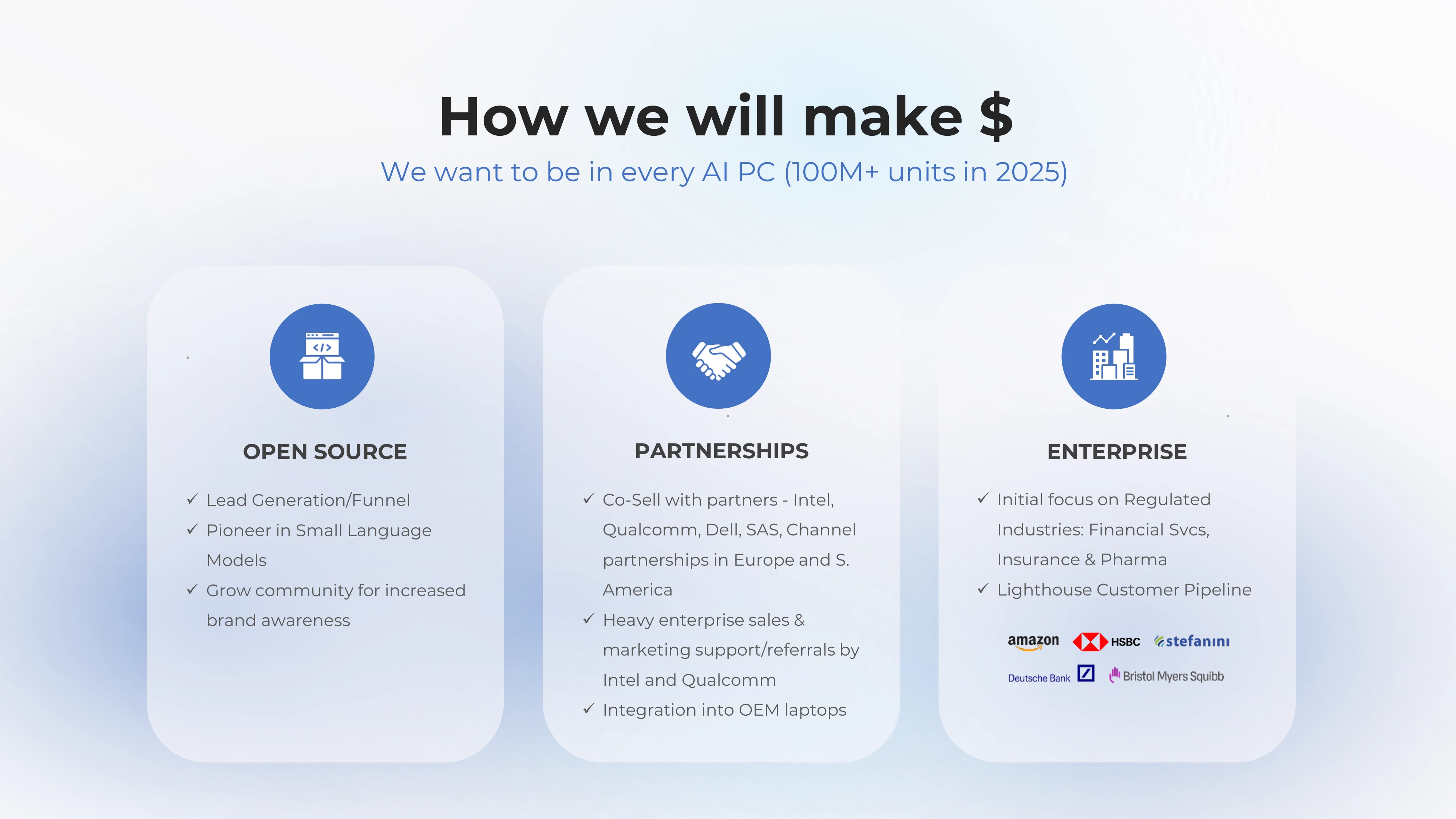 Co-Sell with partners - Intel, Qualcomm, Dell, SAS, Channel partnerships in Europe and S. America, Heavy enterprise sales & marketing support/referrals by Intel and Qualcomm, Integration into OEM laptops