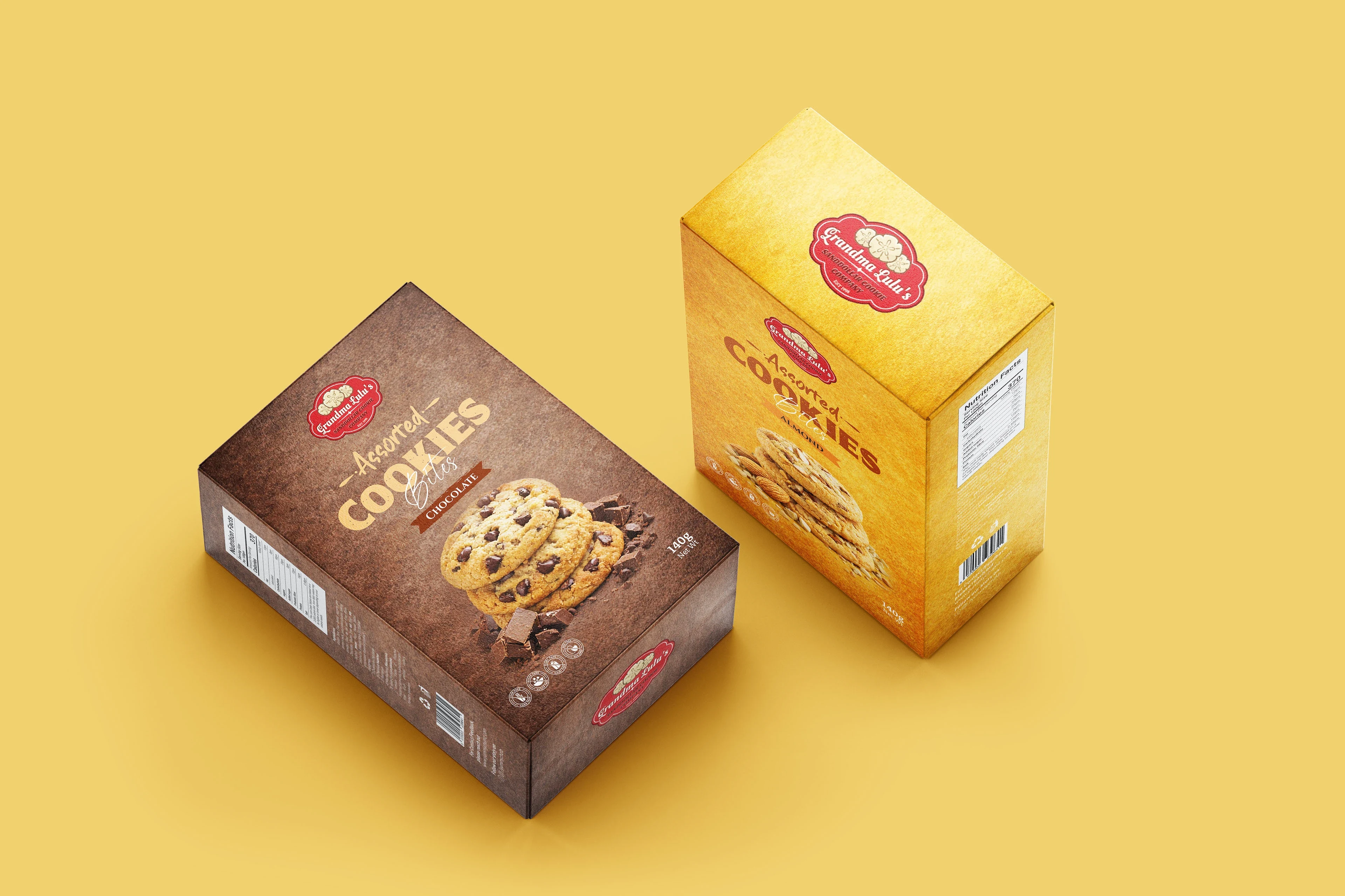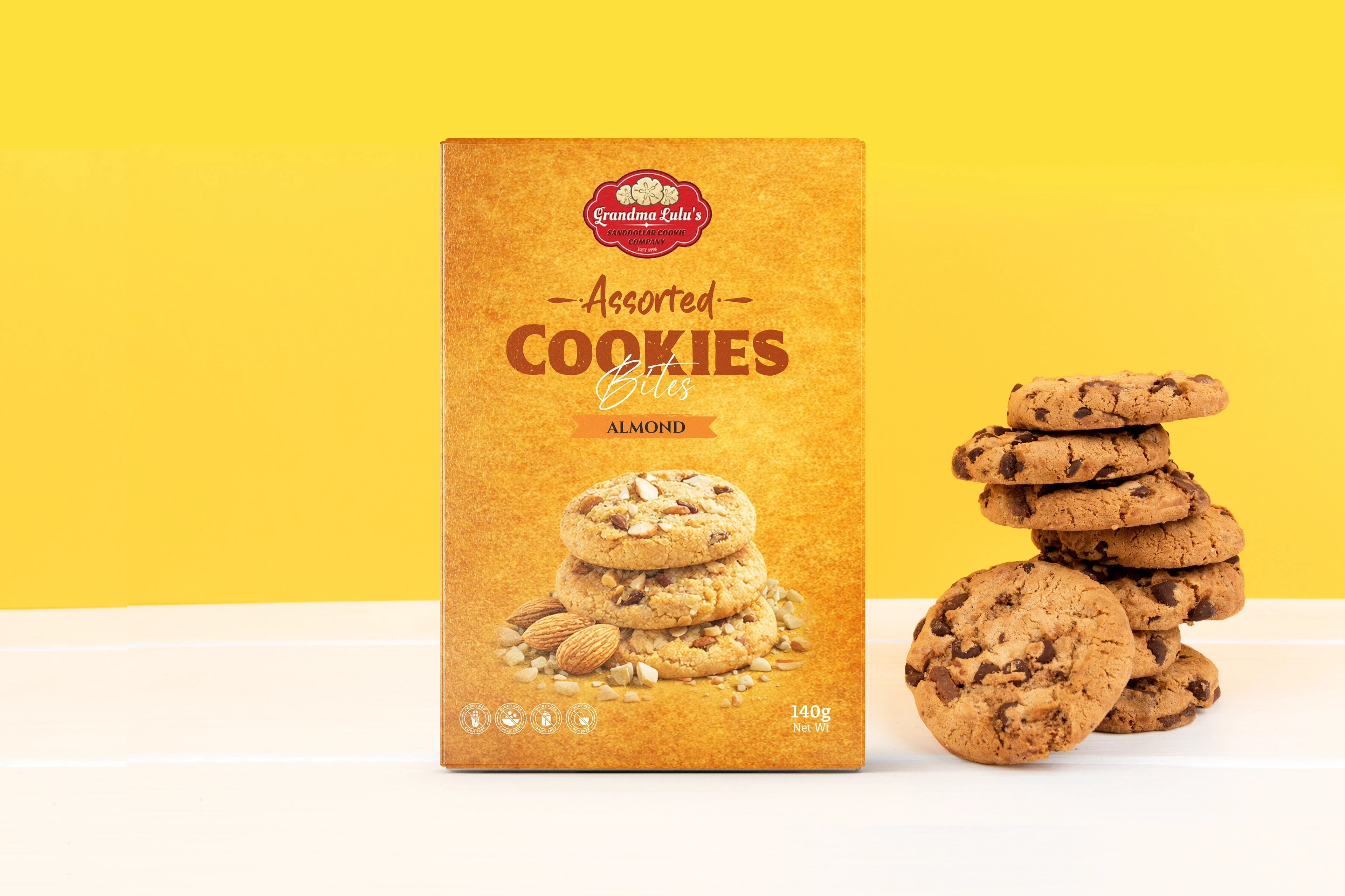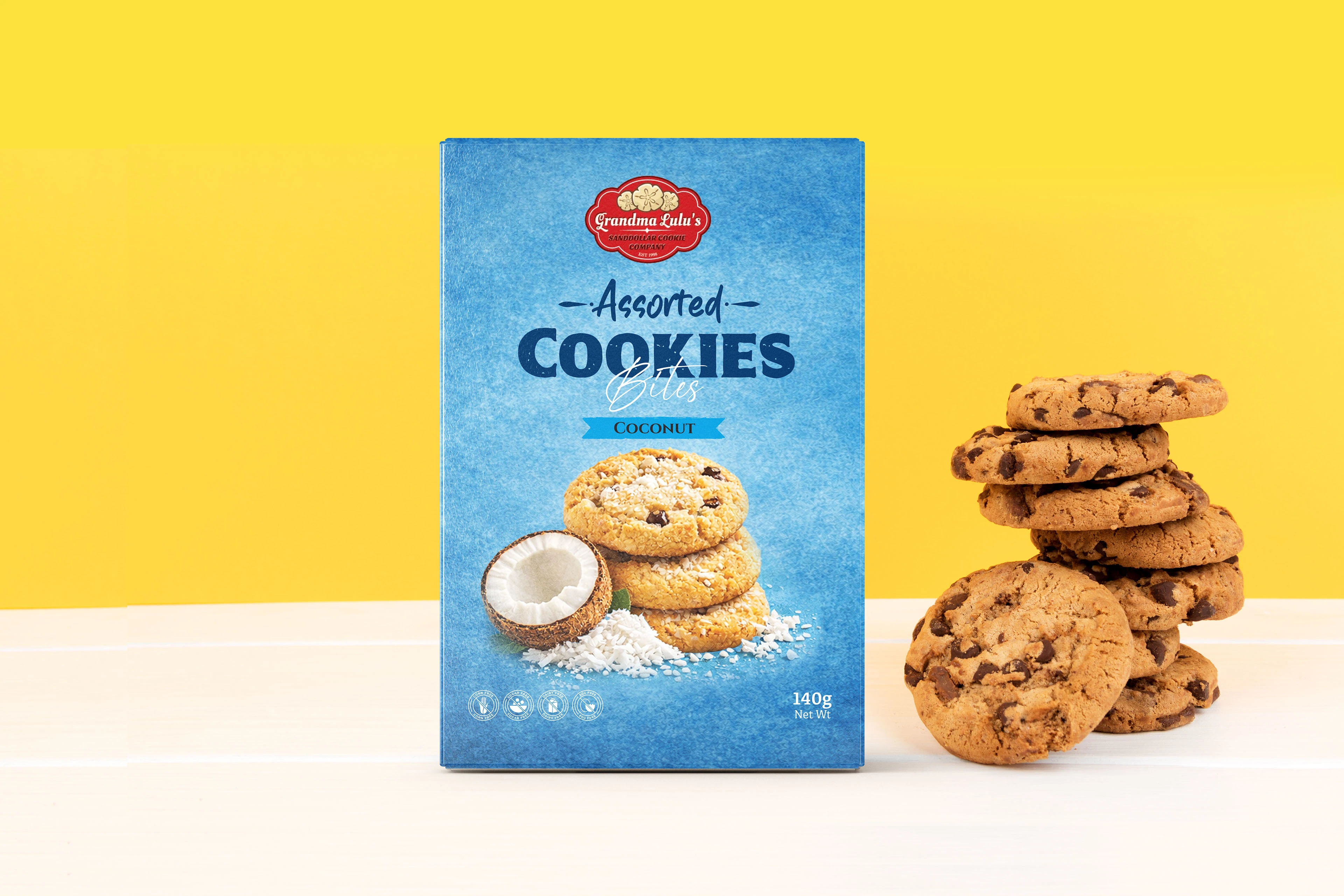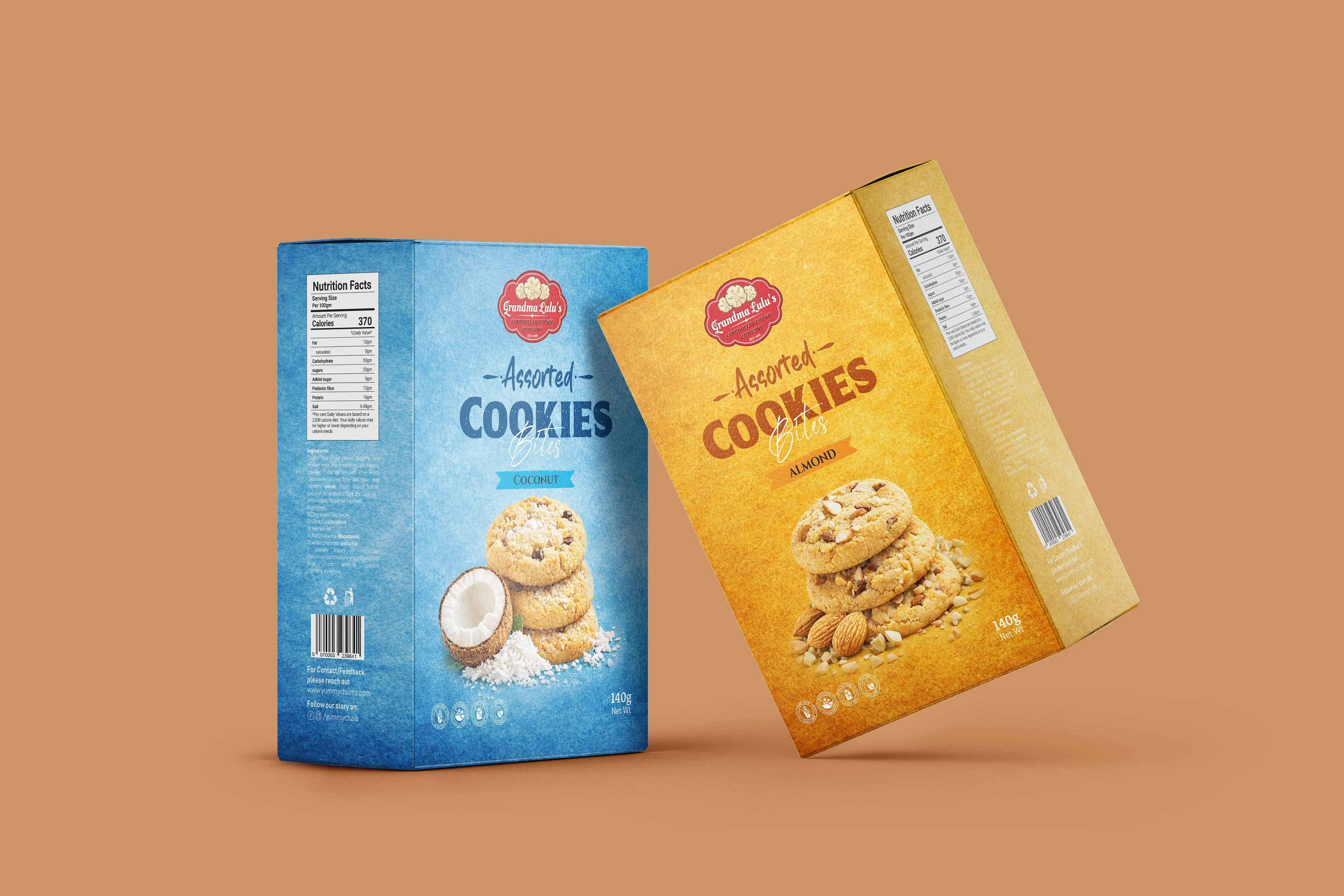 This packaging design presents a premium Assorted Cookies Bites product range featuring Chocolate, Coconut, and Almond flavors. Each pack is designed with a un…