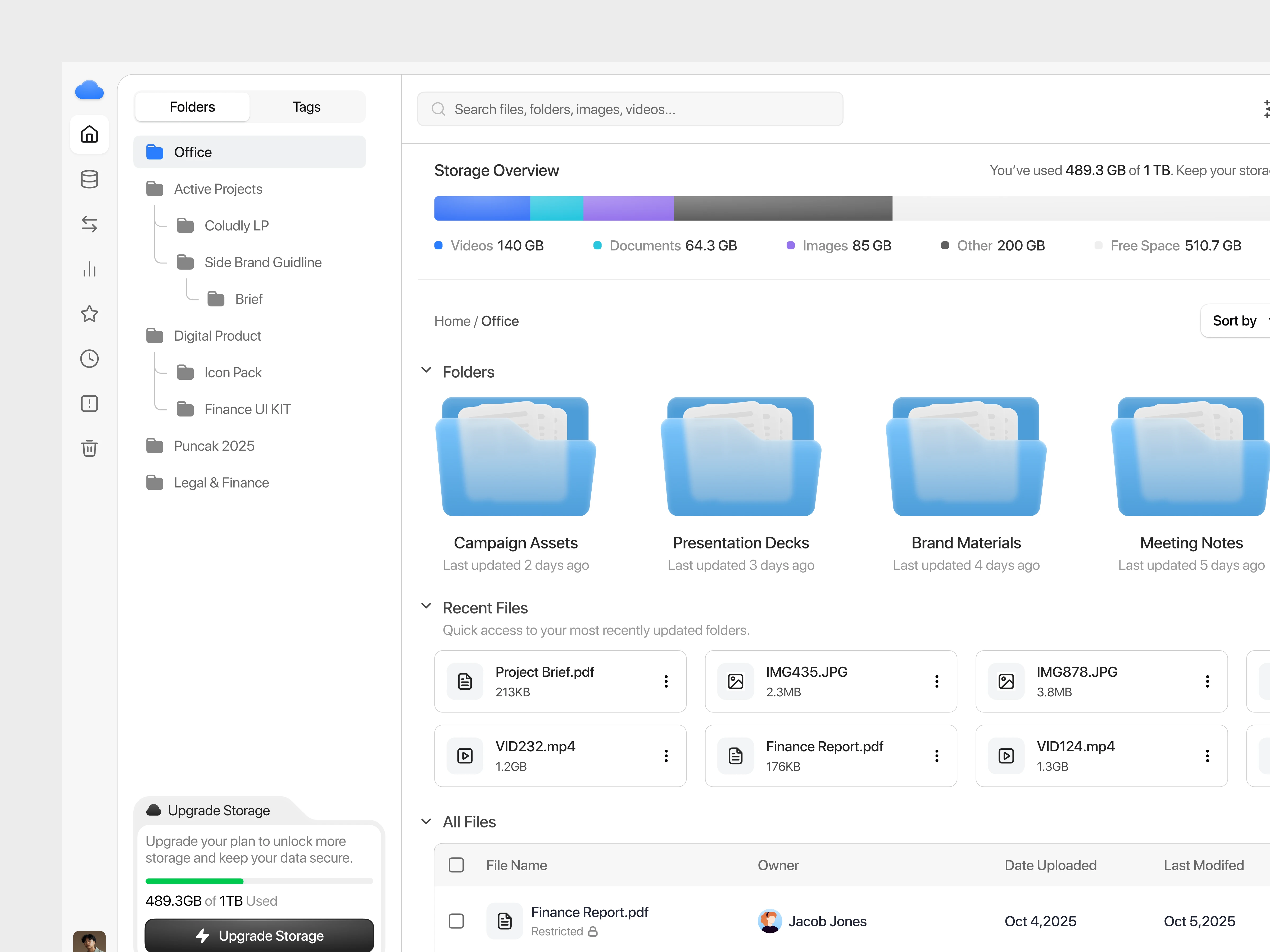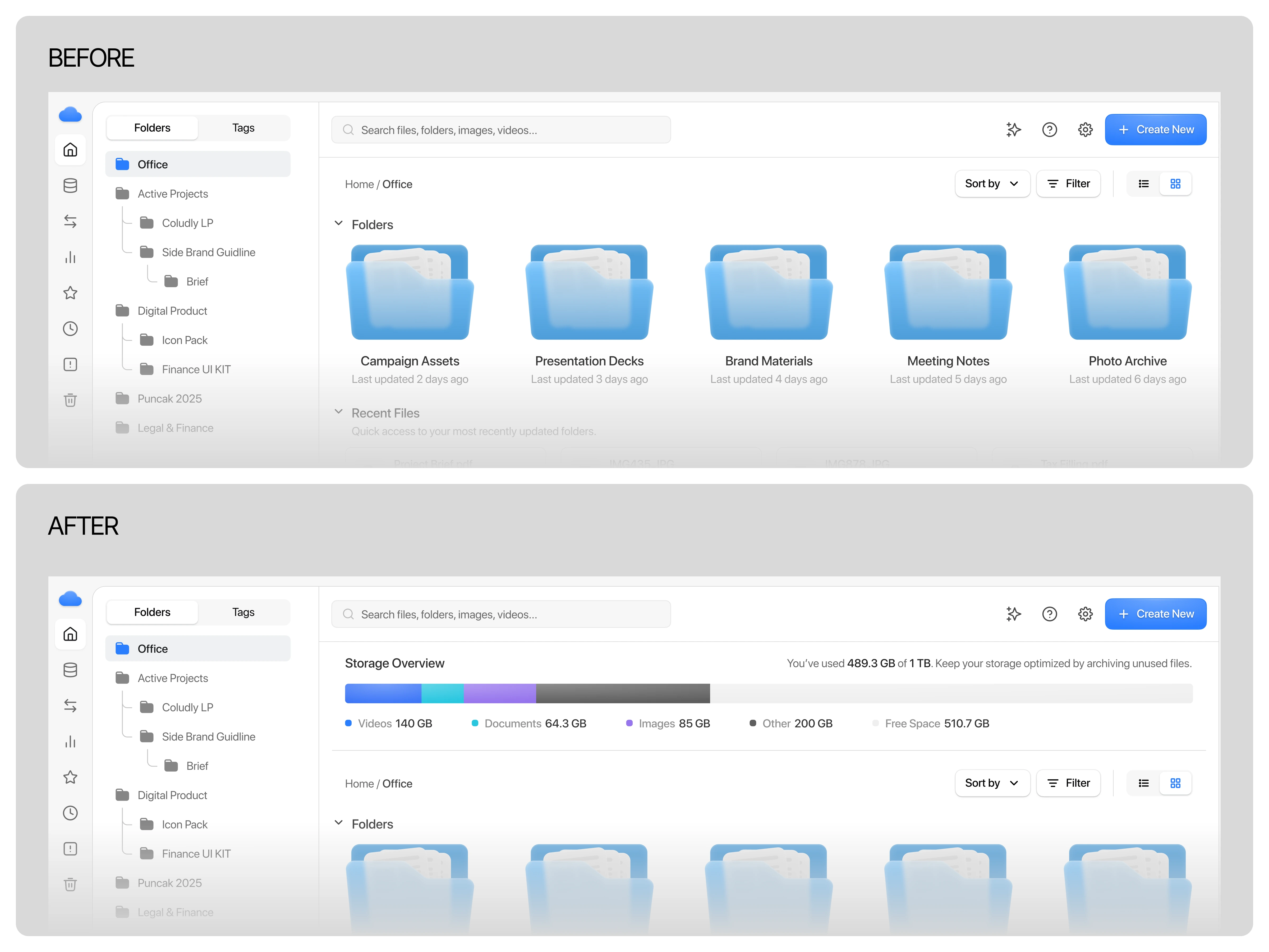 The system should always keep users informed about what is going on, through appropriate feedback within a reasonable time. This principle is crucial for building user trust and control. In the initial version (BEFORE), the file management interface completely lacked a storage overview section. Users had no immediate way to know their storage health how much space was consumed, the total capacity, or the remaining free space. This absence of feedback forced users to rely on trial and error or to navigate to a separate settings area to check their capacity, making file management a guessing game and increasing cognitive load. Users would only realize they were running out of space when a critical error message appeared, which is a reactive and frustrating experience.