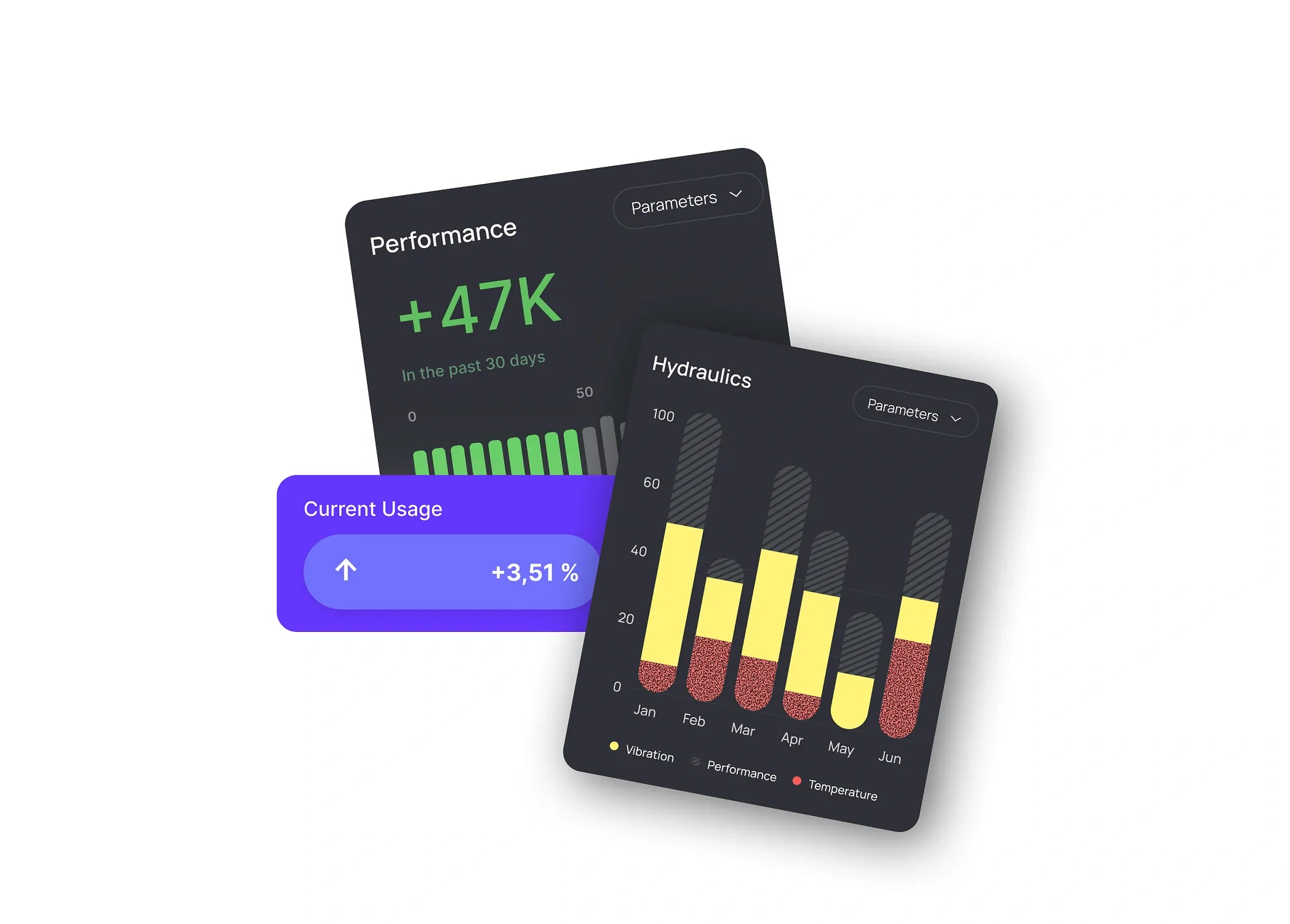 Telemetry, hydraulics, and performance indicators are integrated in one cohesive interface.