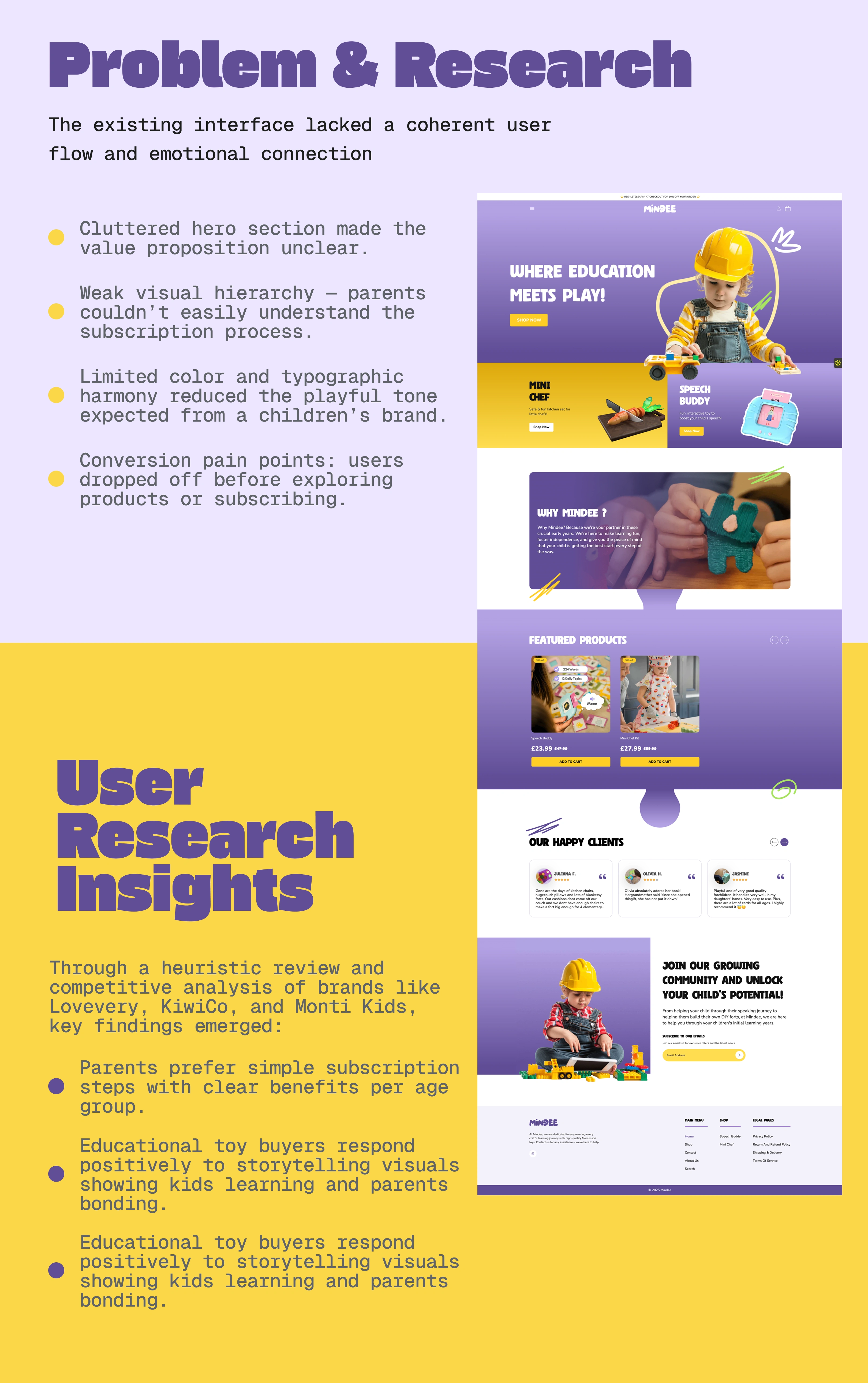 Introduced modular sections (“How Mindee Works,” “Browse by Age,” “Why Parents Love Mindee”) to improve scannability and storytelling.