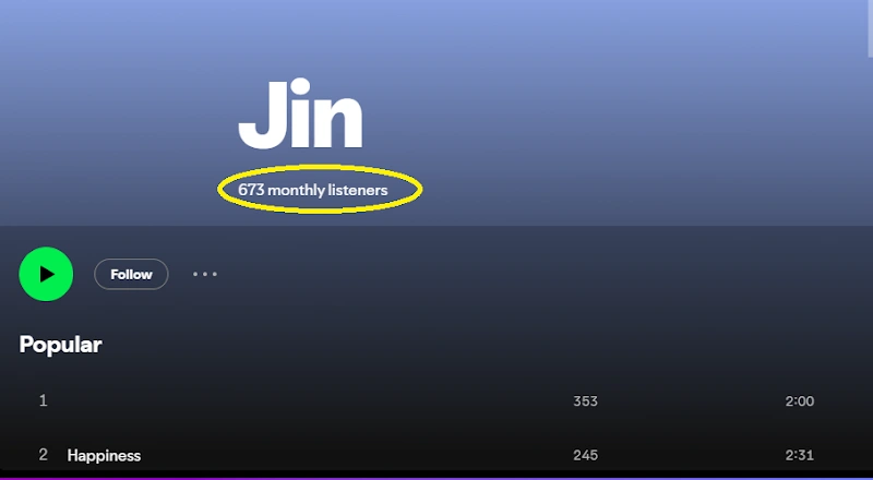 The campaign helped Jin expand his audience from a small listener base to a global fan community with over 5 million monthly listeners, reinforcing his visibility and influence on Spotify.