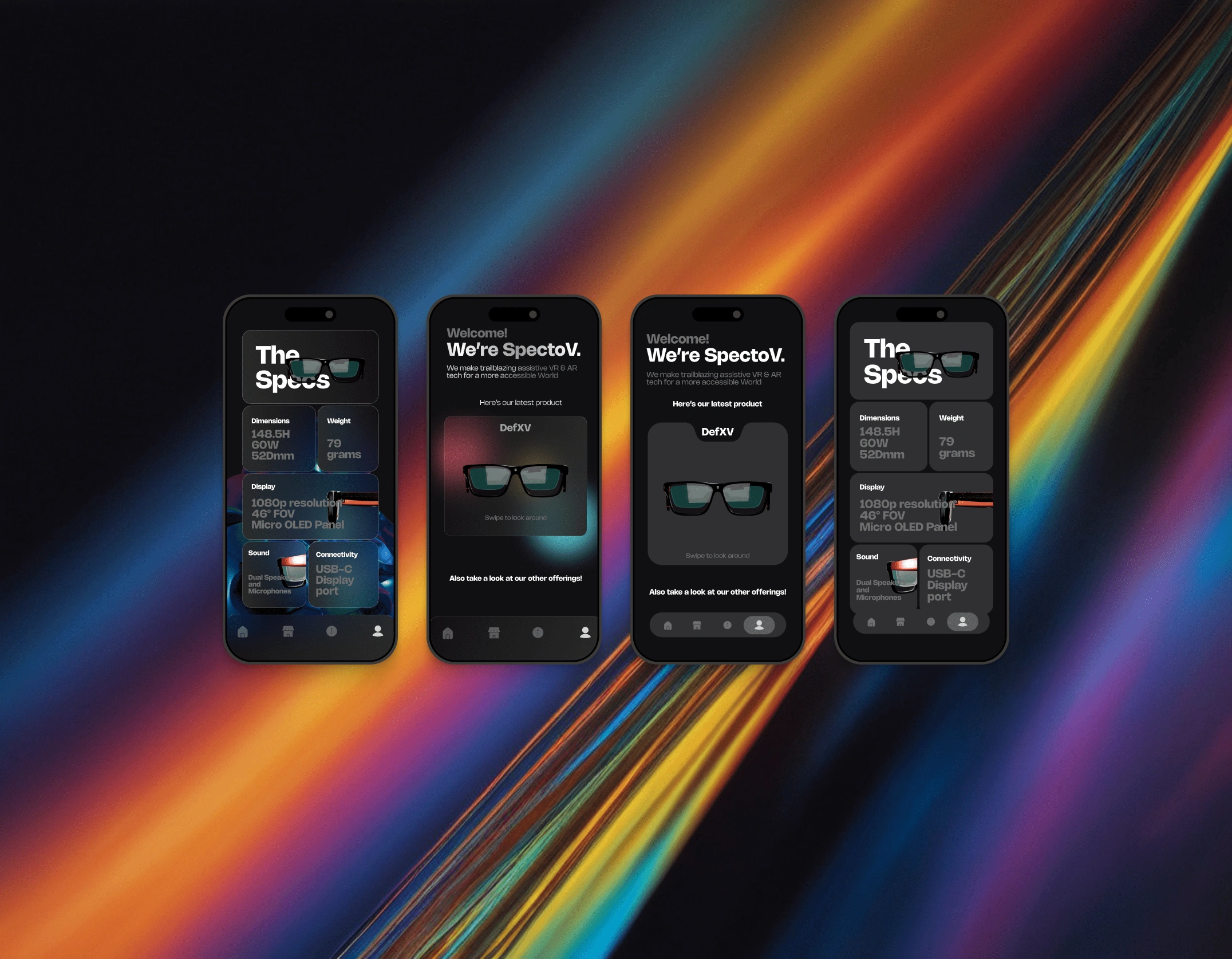 Designed the SpectoV mobile app to showcase AR/VR demos with smooth navigation, clean UI, and startup-ready visuals for pitching and user testing.