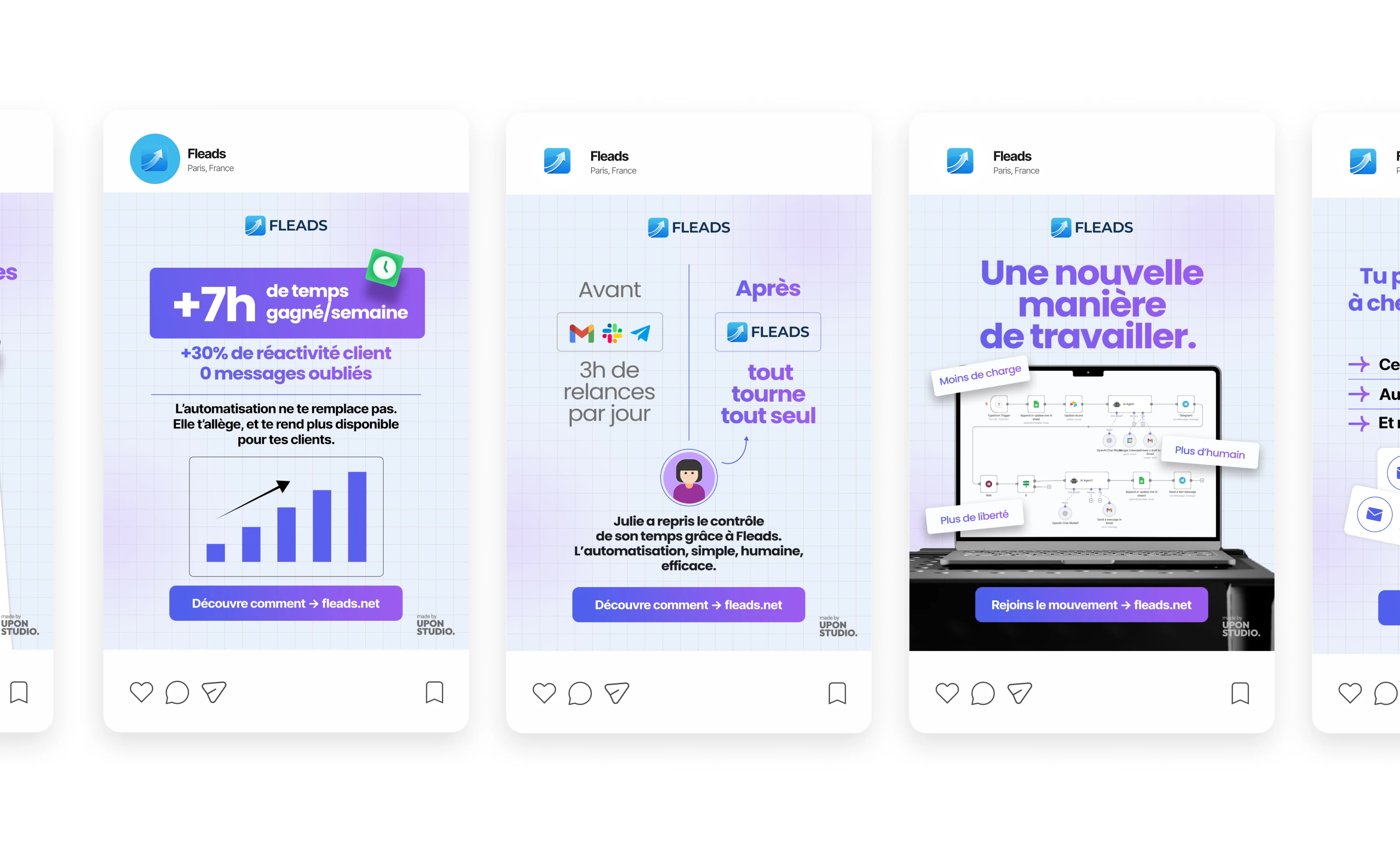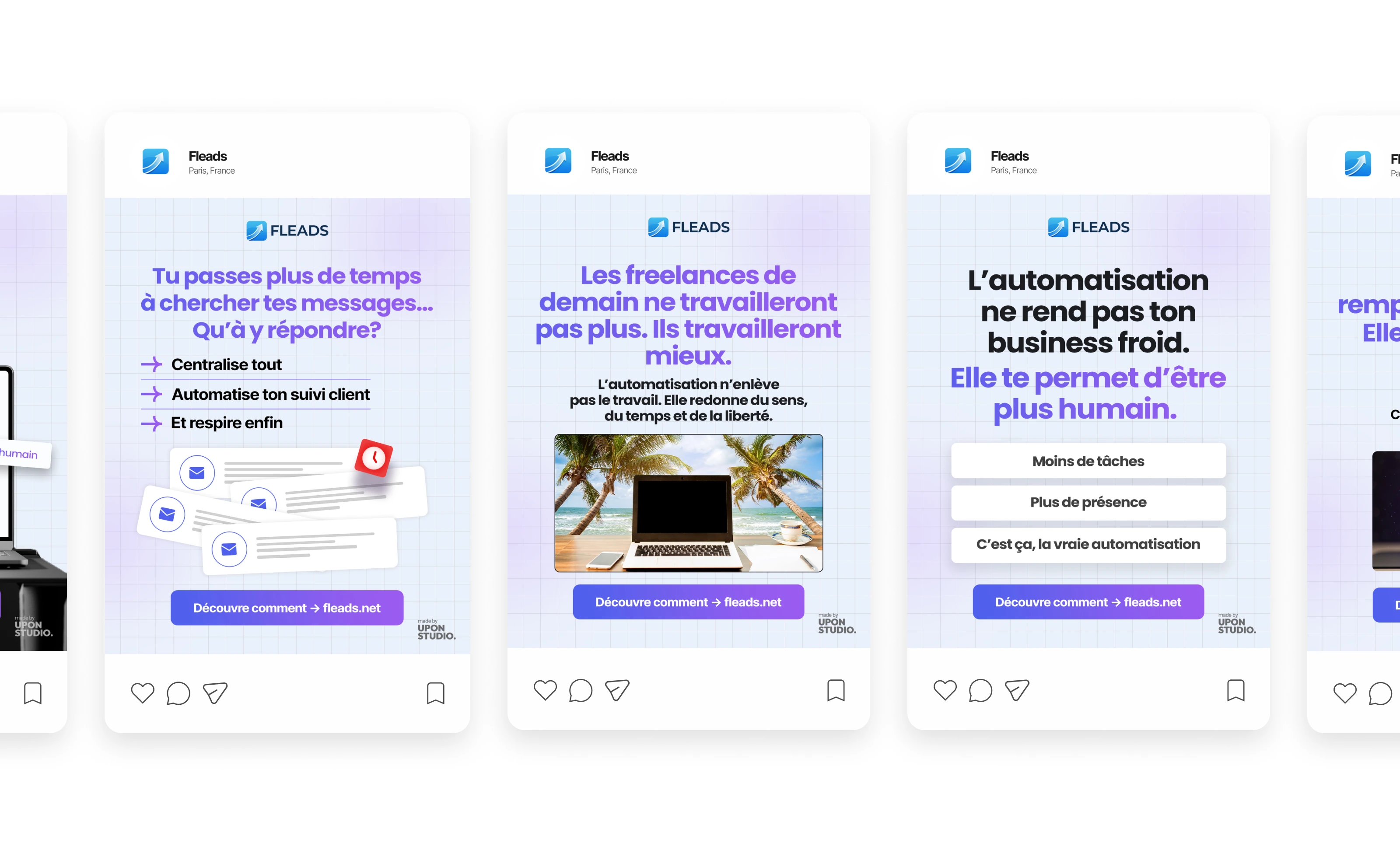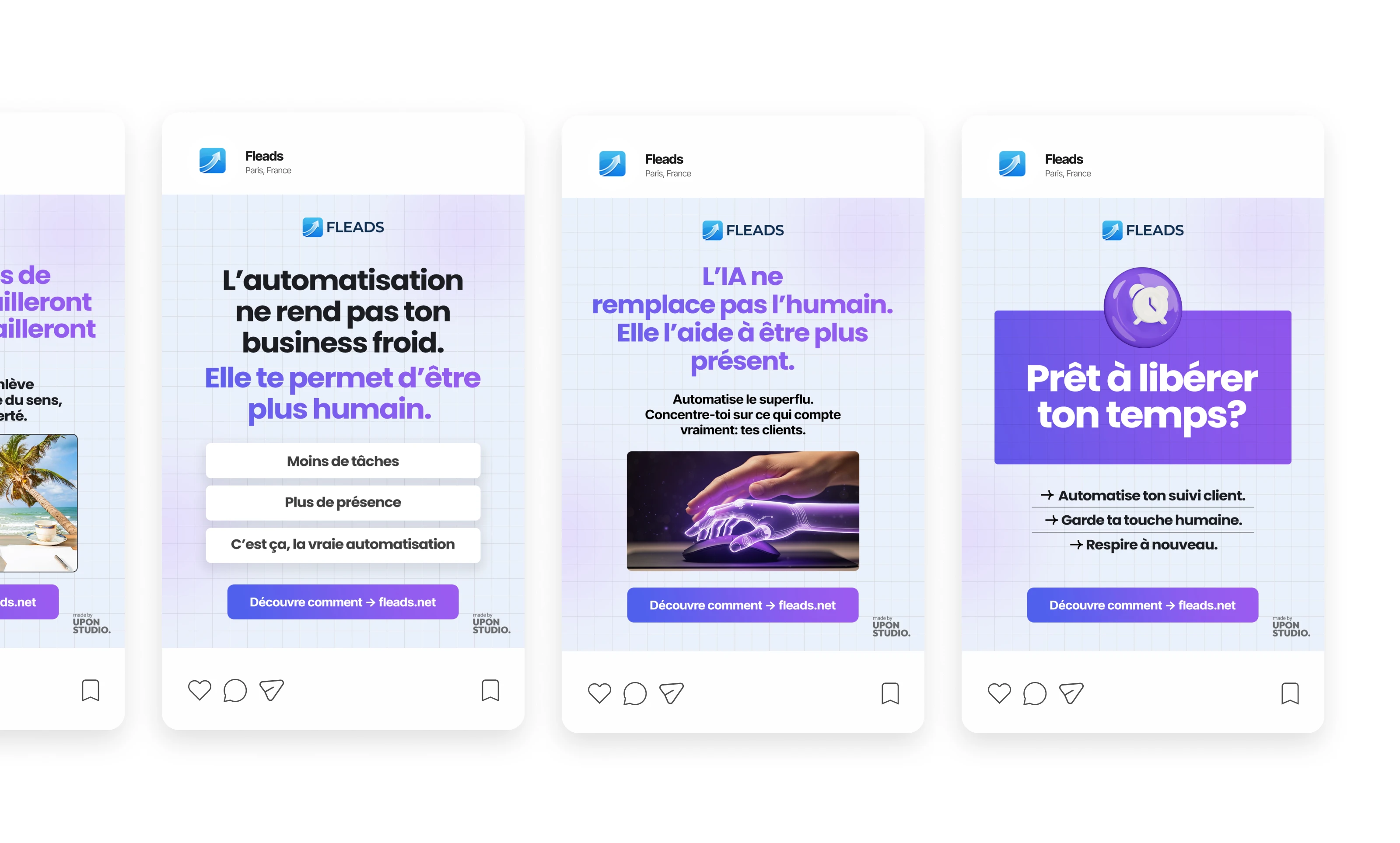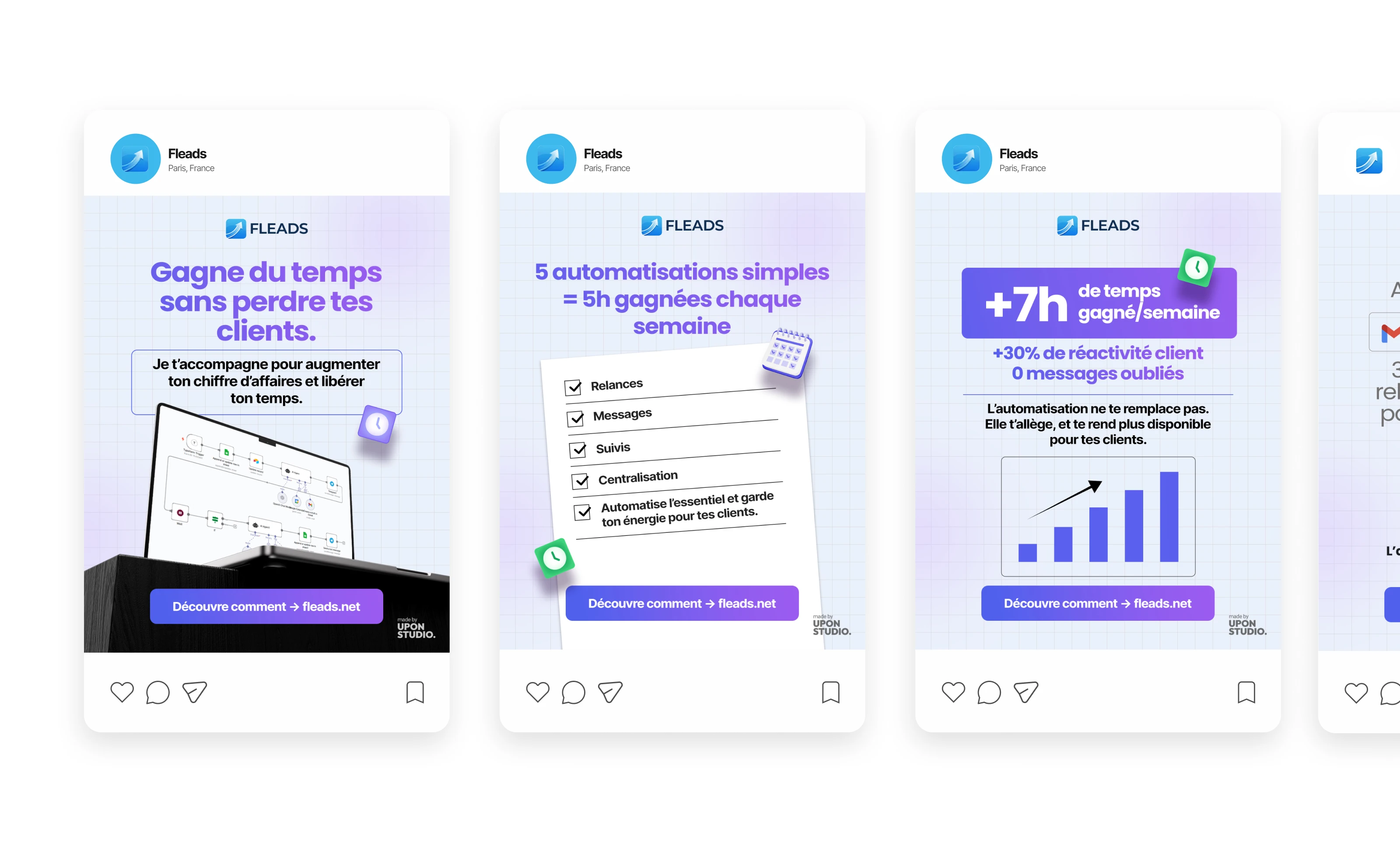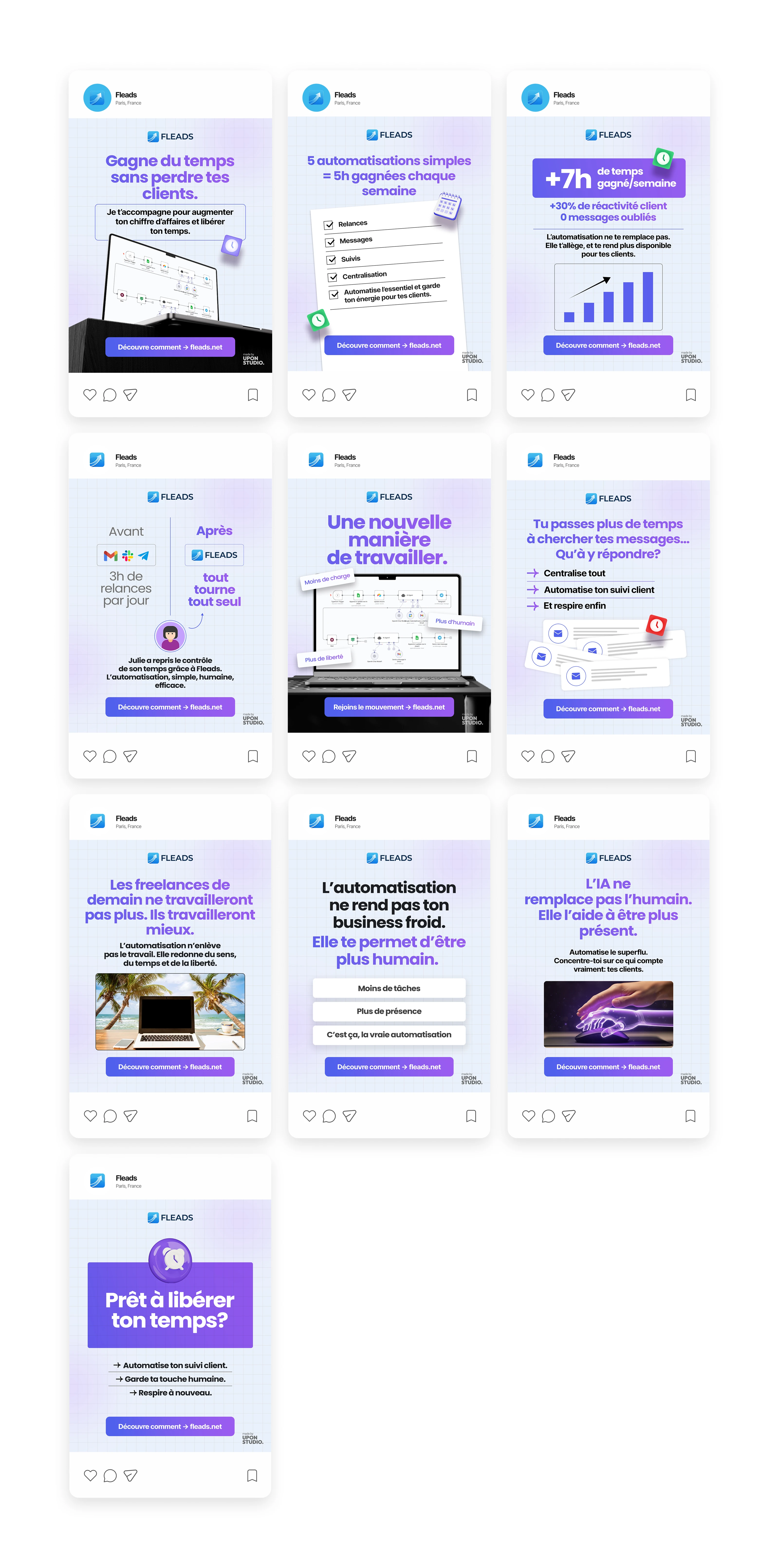 Designed clean French Instagram posts for Fleads, an automation service helping freelancers save time, improve client follow-ups, and stay consistent online.