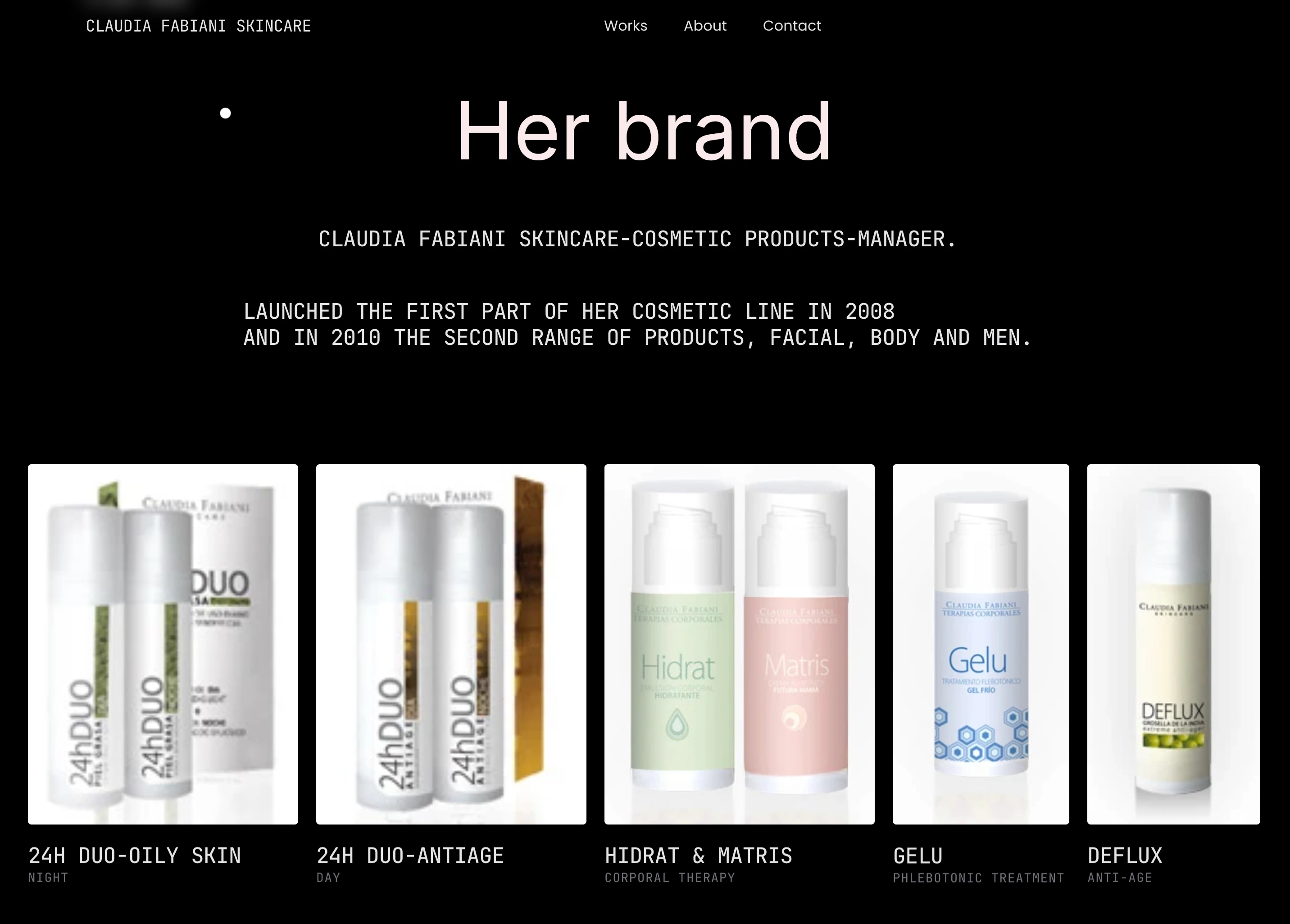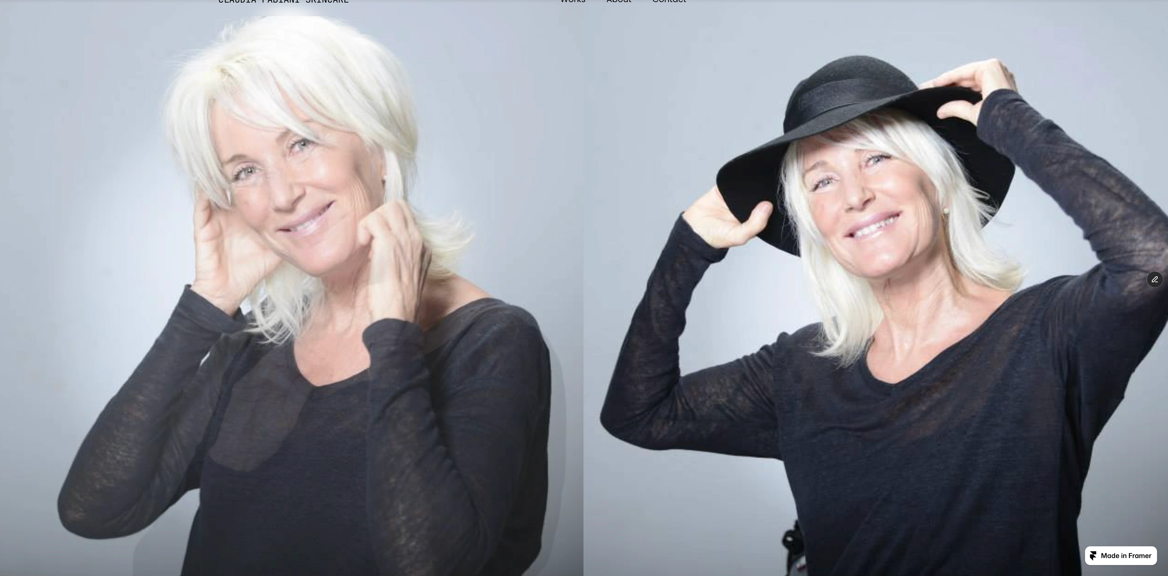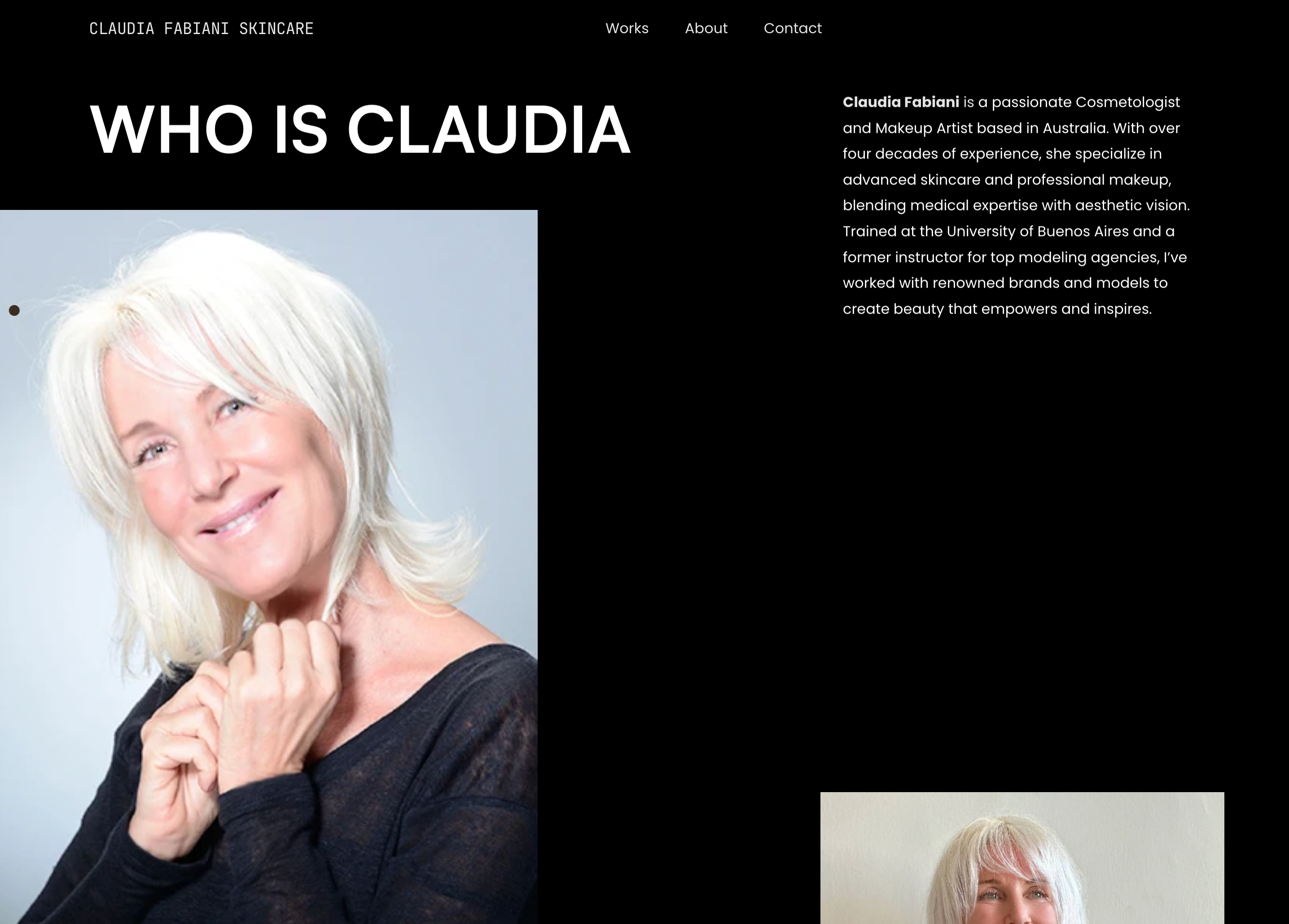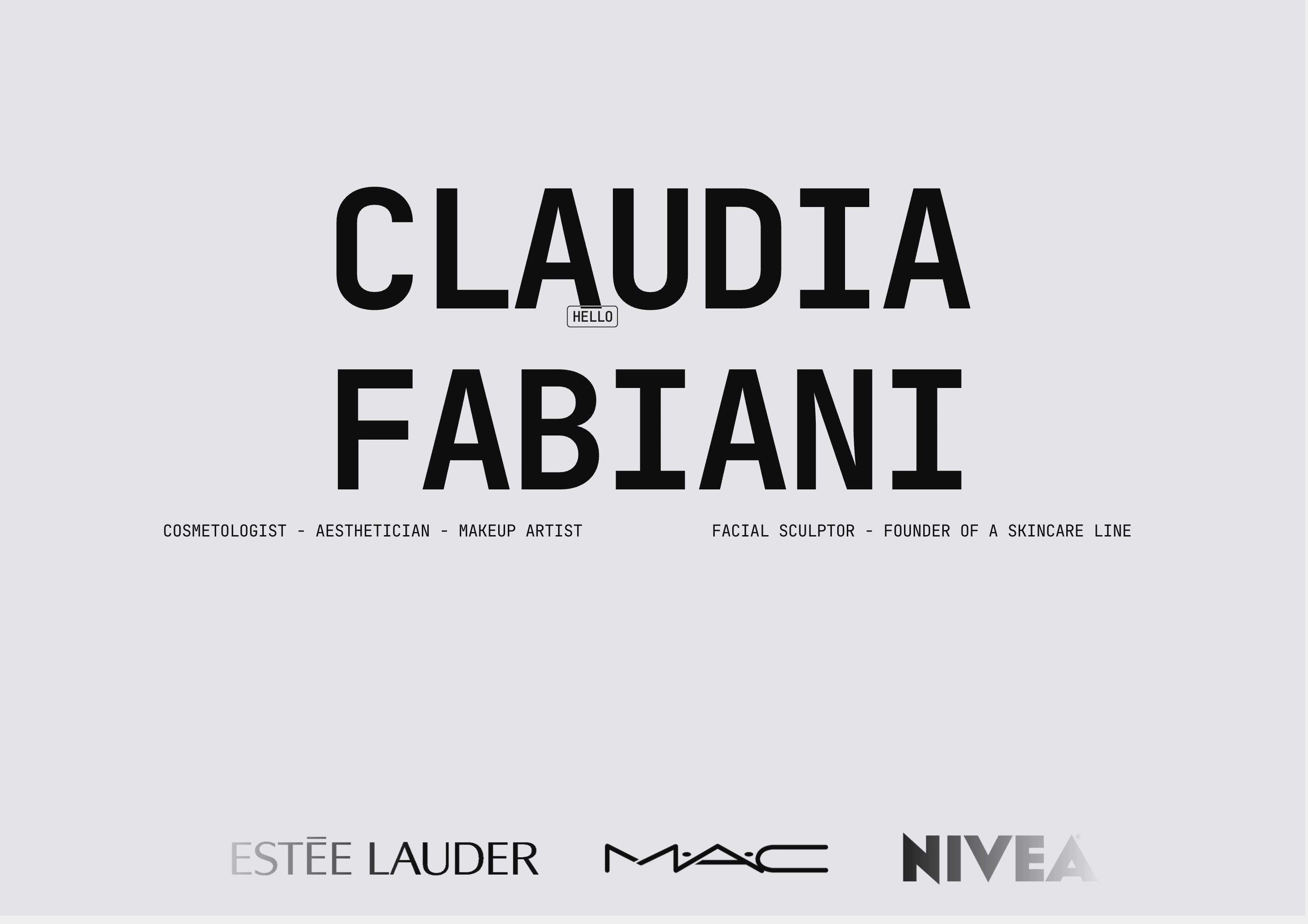 The design is clean, minimalist, and sophisticated, using whitespace effectively to give prominence to the content. The aesthetic relies on high-quality photography that is both professional (portraits, treatments) and aspirational (models, luxury hotels, events). This visual strategy immediately establishes Claudia’s credibility as a cosmetologist, aesthetician, and makeup artist with global experience.