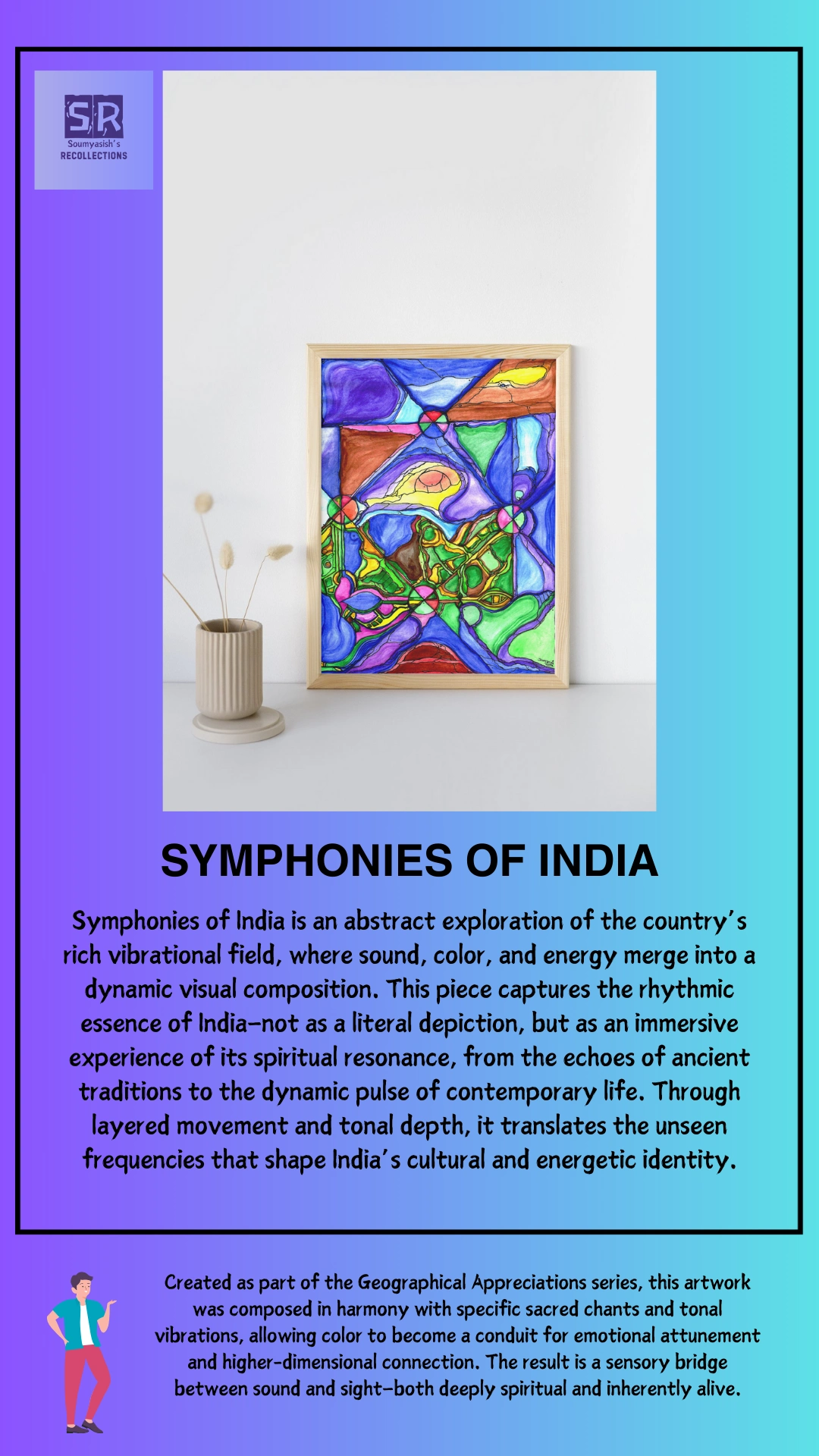 Symphonies of India is an abstract exploration of the country’s rich vibrational field, where sound, color, and energy merge into a dynamic visual composition.