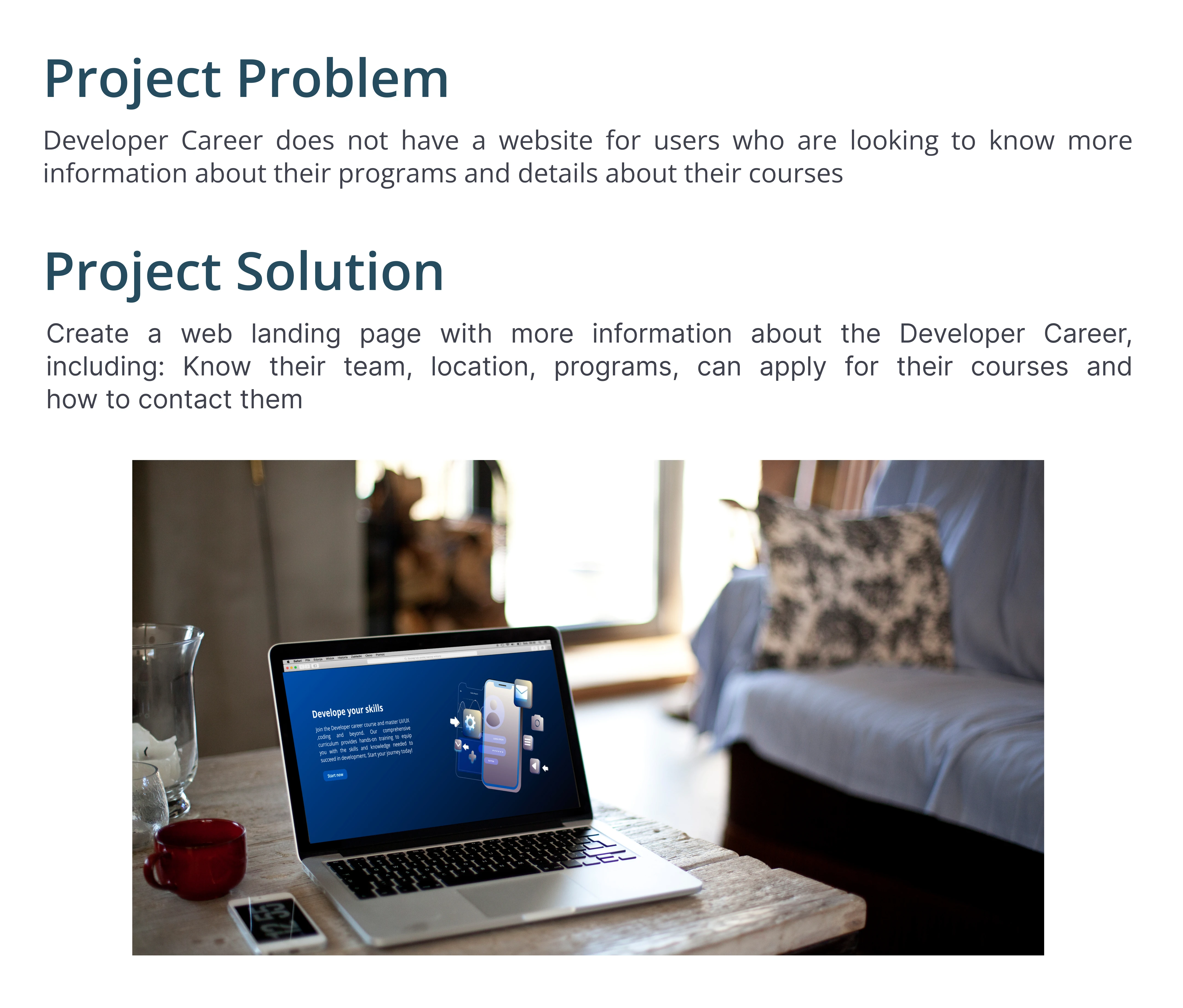 We create a web landing page with more information about the Developer's Career, including: Knowing their team, location, programs, and how to contact them