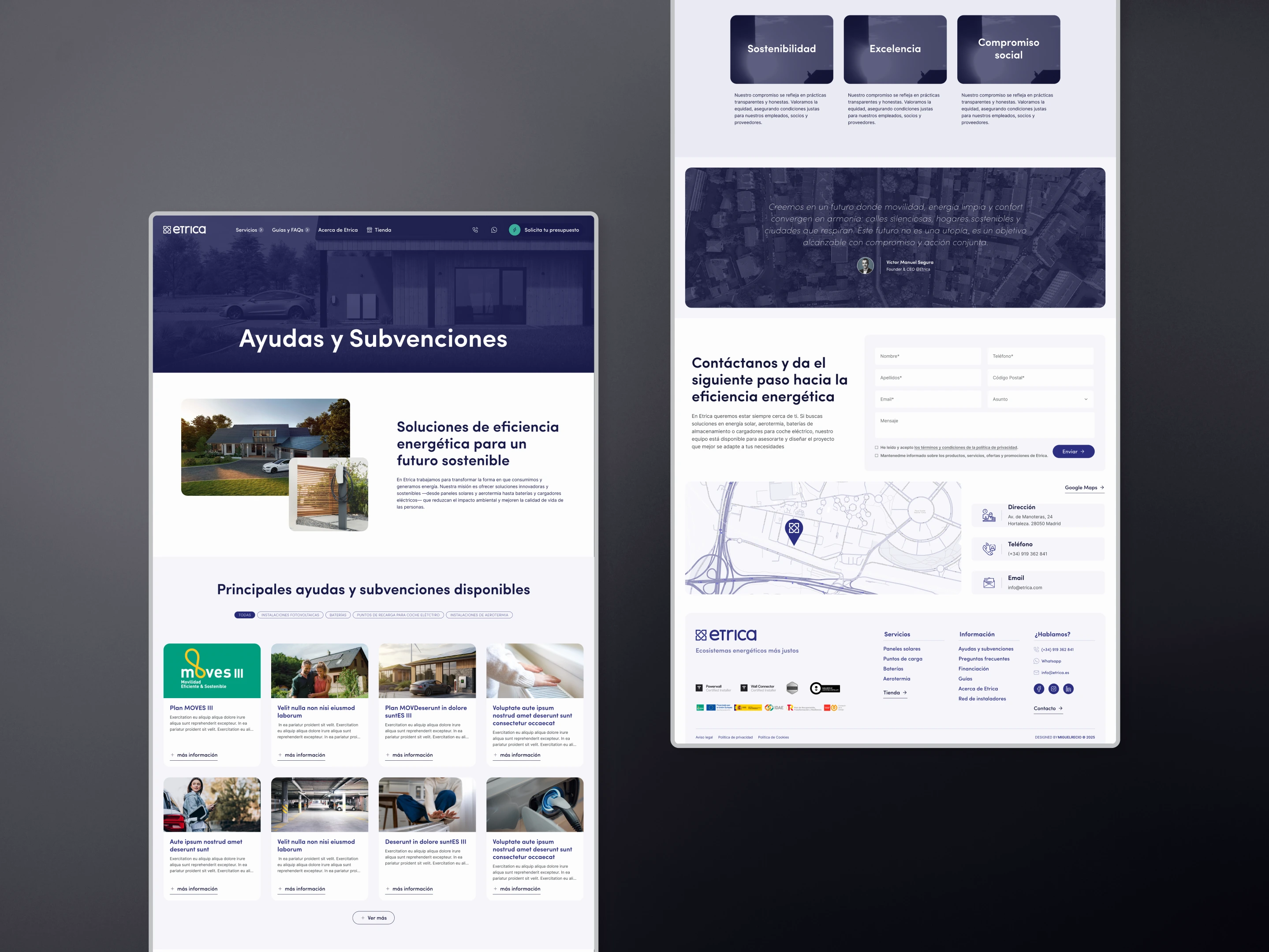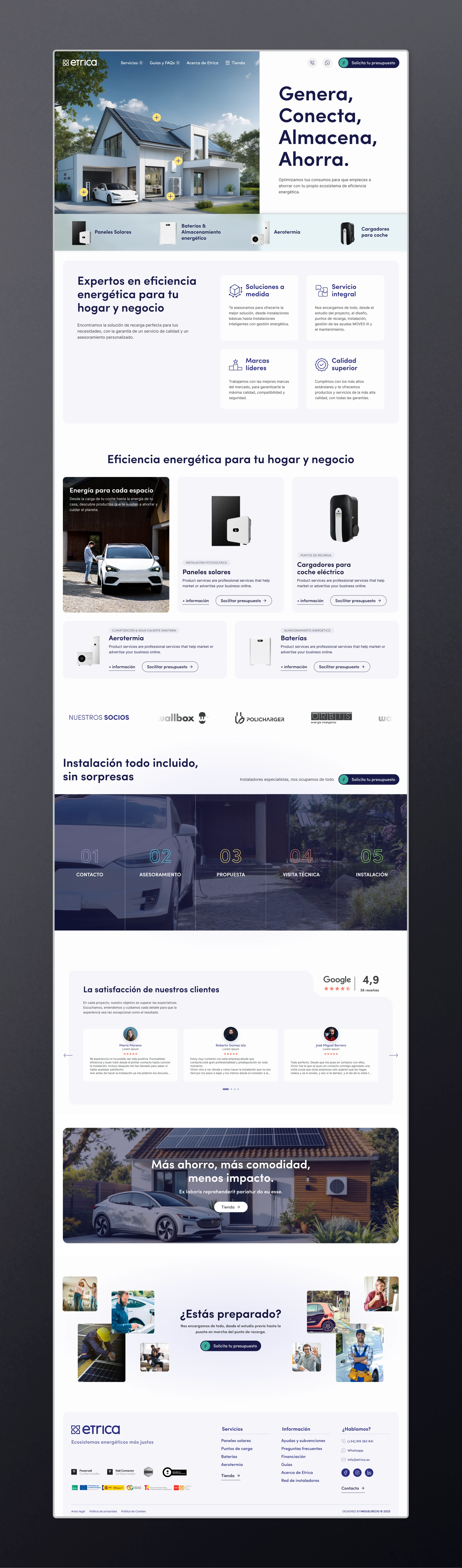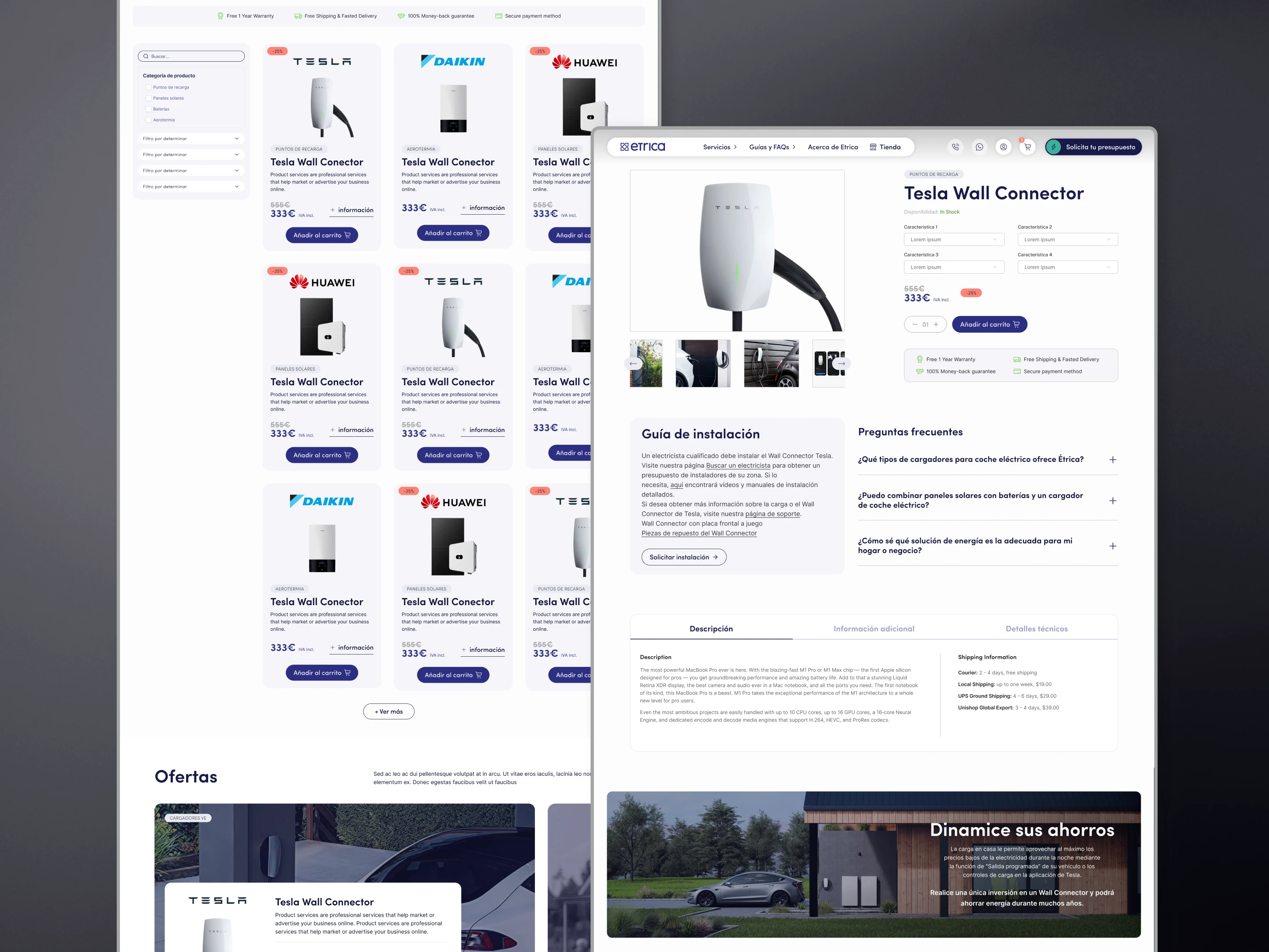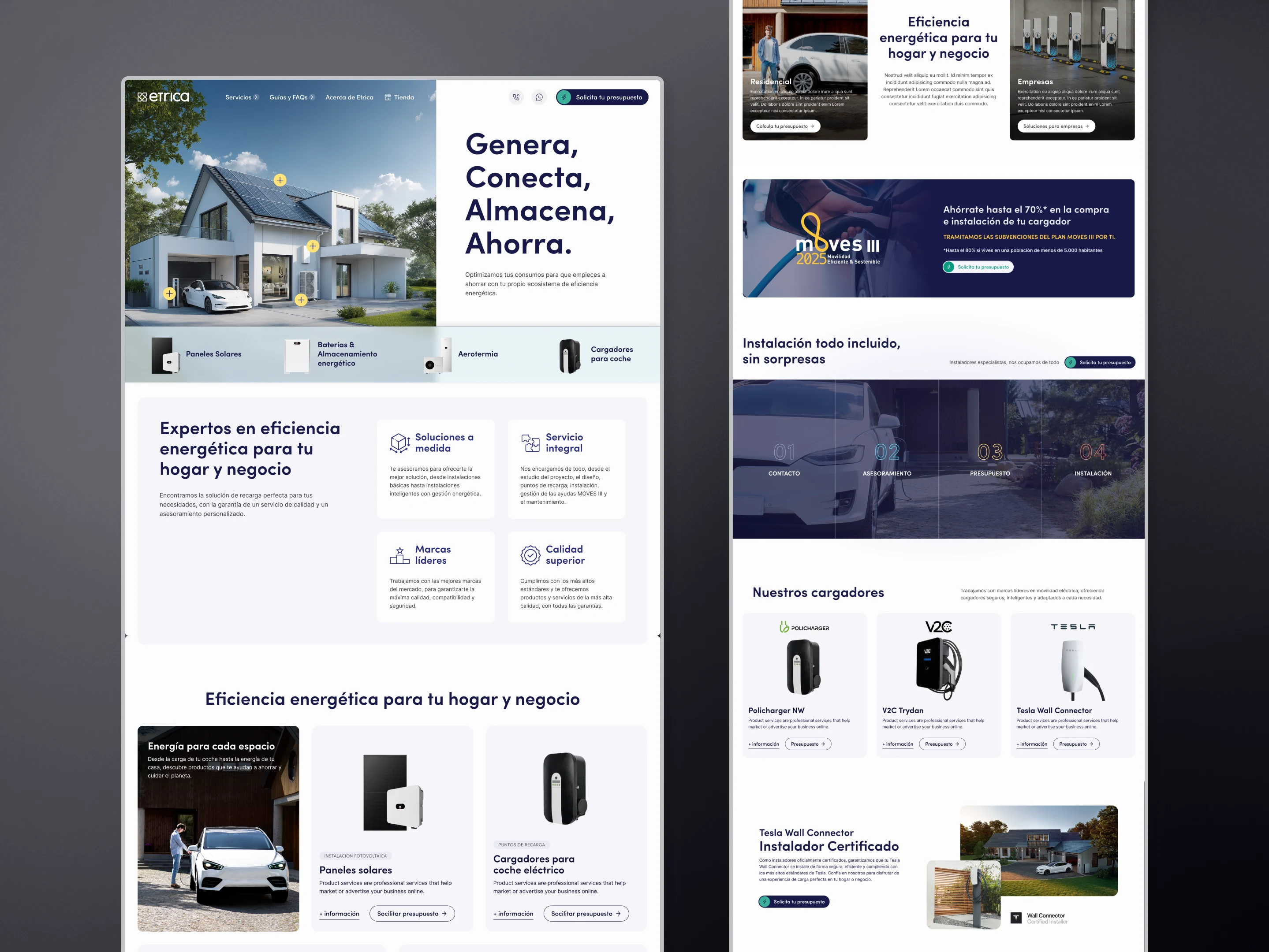 For this project, I redesigned their entire digital presence from the ground up. The goal was to transform a basic informational website into a complete digital platform: a modern, structured site that educates users, builds trust, and drives conversions. The result includes 30+ pages spanning service pages, a blog and guides section, a multi-step quote request flow, subsidy and financing information, and a fully integrated e-commerce store with products from brands like Tesla, Wallbox, Huawei, and Daikin.