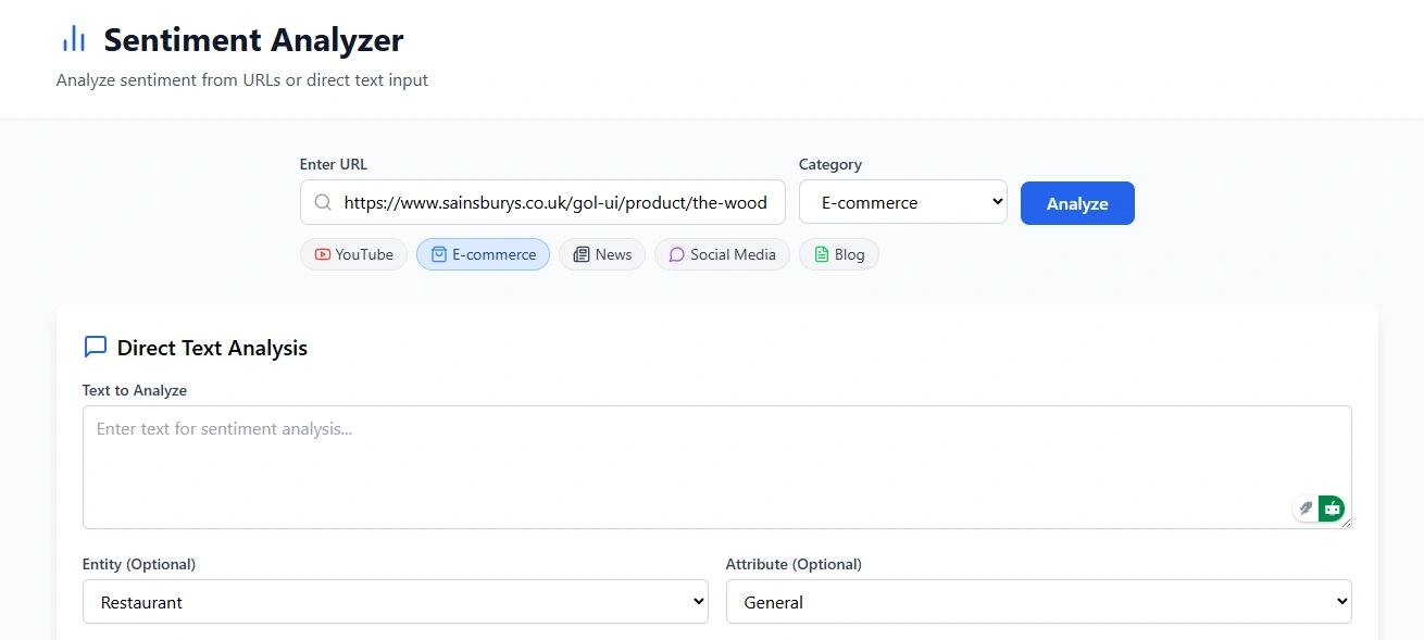 A modern sentiment analysis application that analyzes text from various sources including direct input, YouTube, e-commerce, news, social media, and blogs.