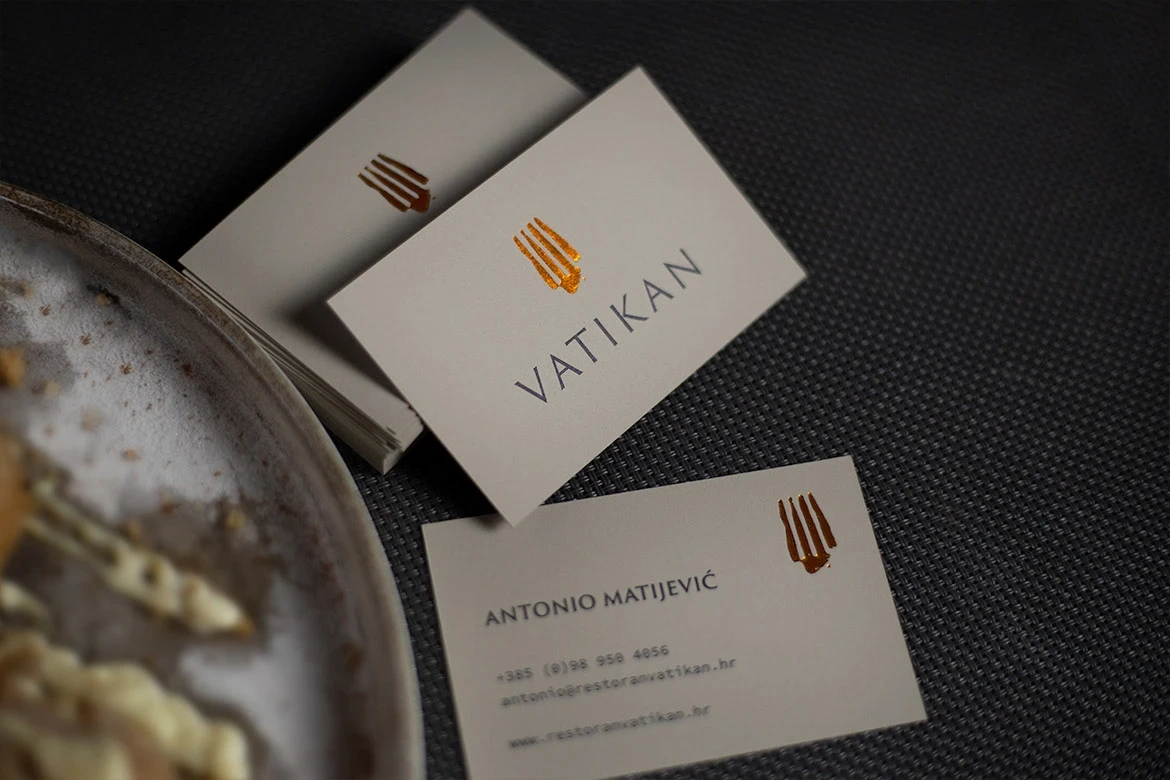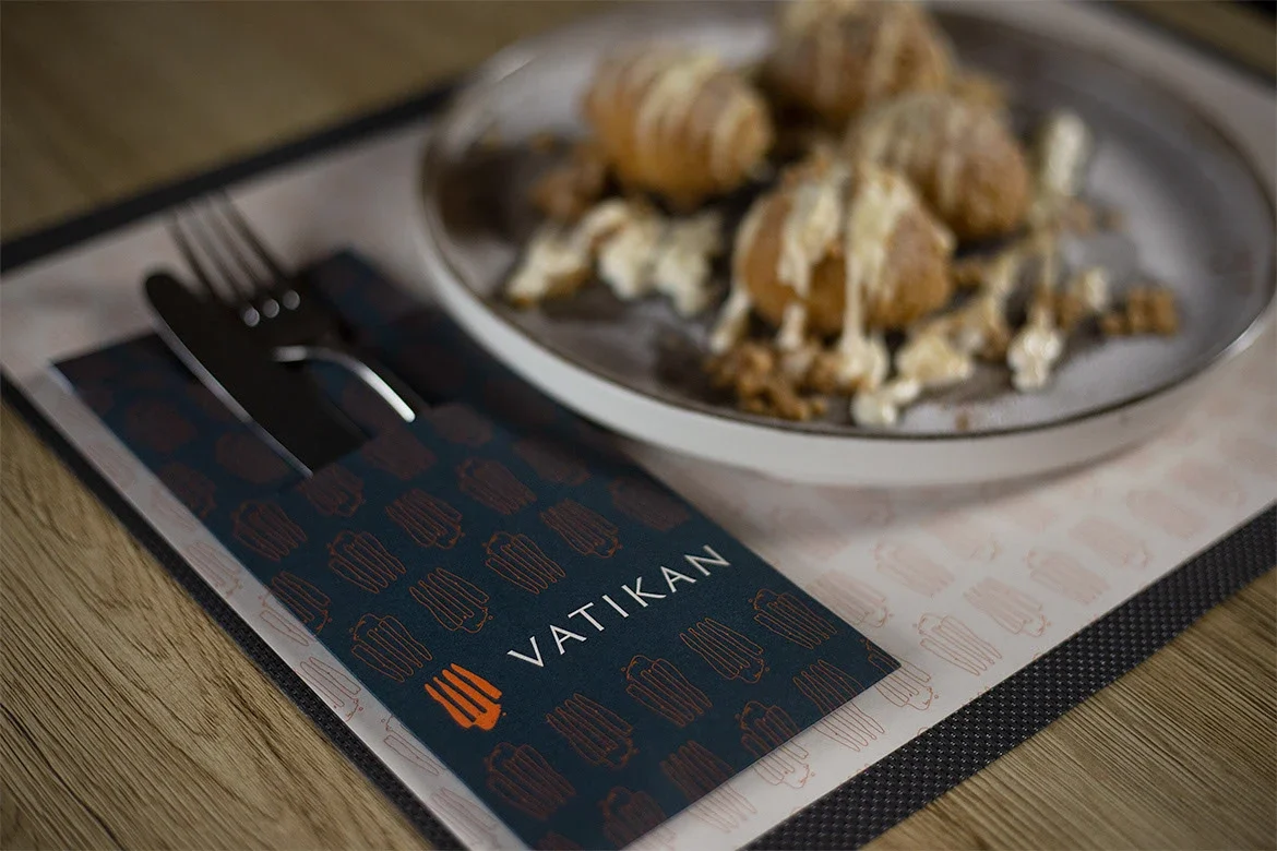 Restaurant Vatican is a family restaurant opened in 1992, located in the town of Vinkovci. A long family tradition of running a restaurant has created a reputation based on a top offer of food and complete gastronomic services. The entire offer of dishes is prepared from quality ingredients of local family farms, which the restaurant owners want to create cohesion between the climate, local food quality, knowledge and expertise of the staff of the Vatican restaurant. The client's goal is to continue to maintain correlation with customers, offering them a superior product and service as well as staying in a pleasant interior with a recognizable brand identity.