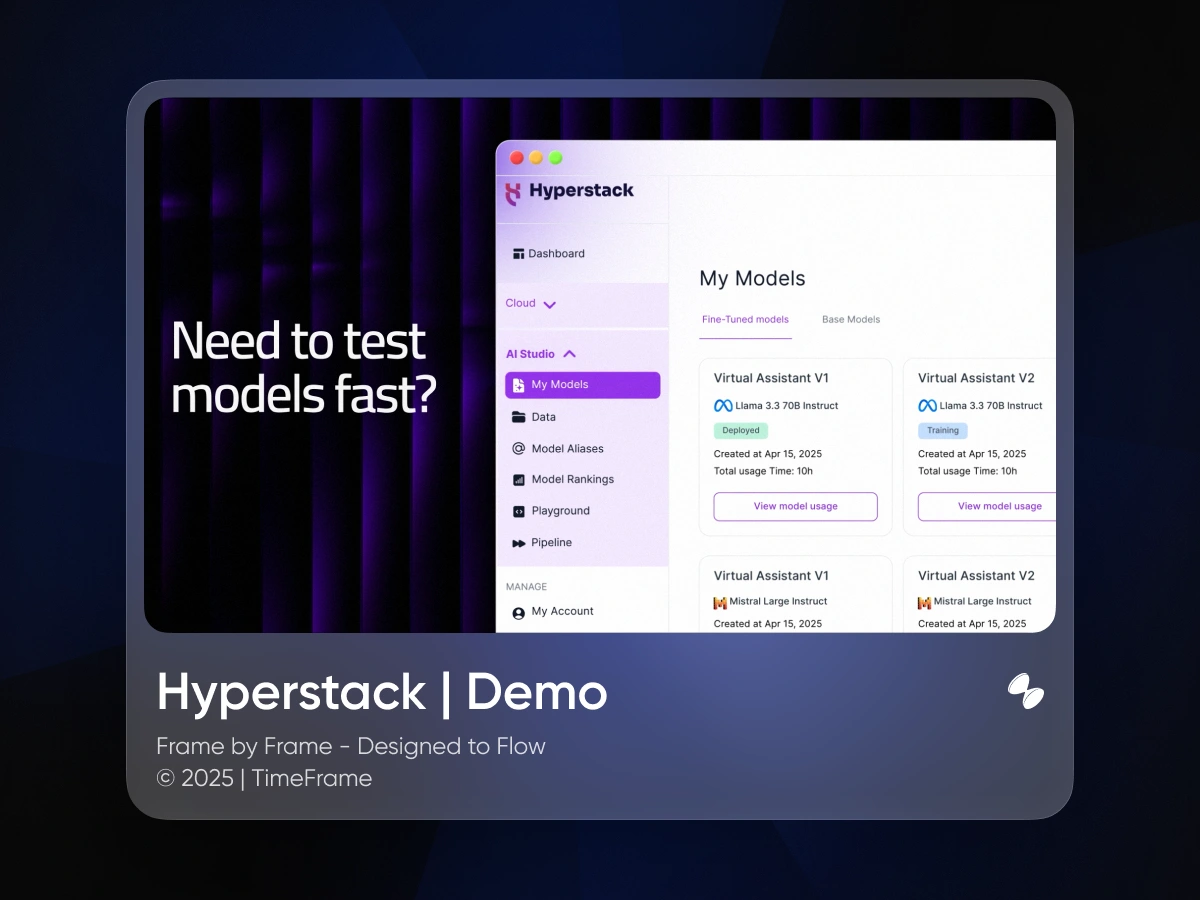 Create a dynamic demo video that combines UI animation, 3D motion graphics, and cinematic storytelling to visually guide users through Hyperstack’s core features. The video had to showcase interactive dashboards, animated workflows, and feature highlights in a sleek, modern style. Using 2D animation, 3D rendering, and After Effects compositing, the goal was to produce a video that feels like a tech promo while functioning as an informative explainer. The deliverable needed to appeal to SaaS audiences, investors, and tech-savvy founders while reinforcing Hyperstack’s brand as an AI startup leader.