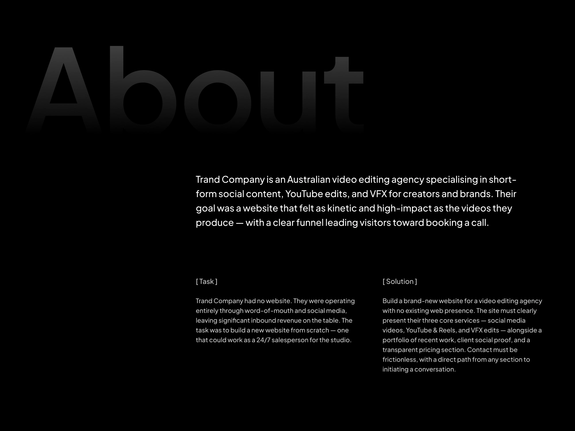 The design started with a single principle: the site should feel like the work it is selling. A dark cinematic aesthetic was chosen to reflect the world of high-end video production and position Trand Company above typical freelance offerings. The layout was kept focused, with each section serving one clear purpose and leading naturally to the next.