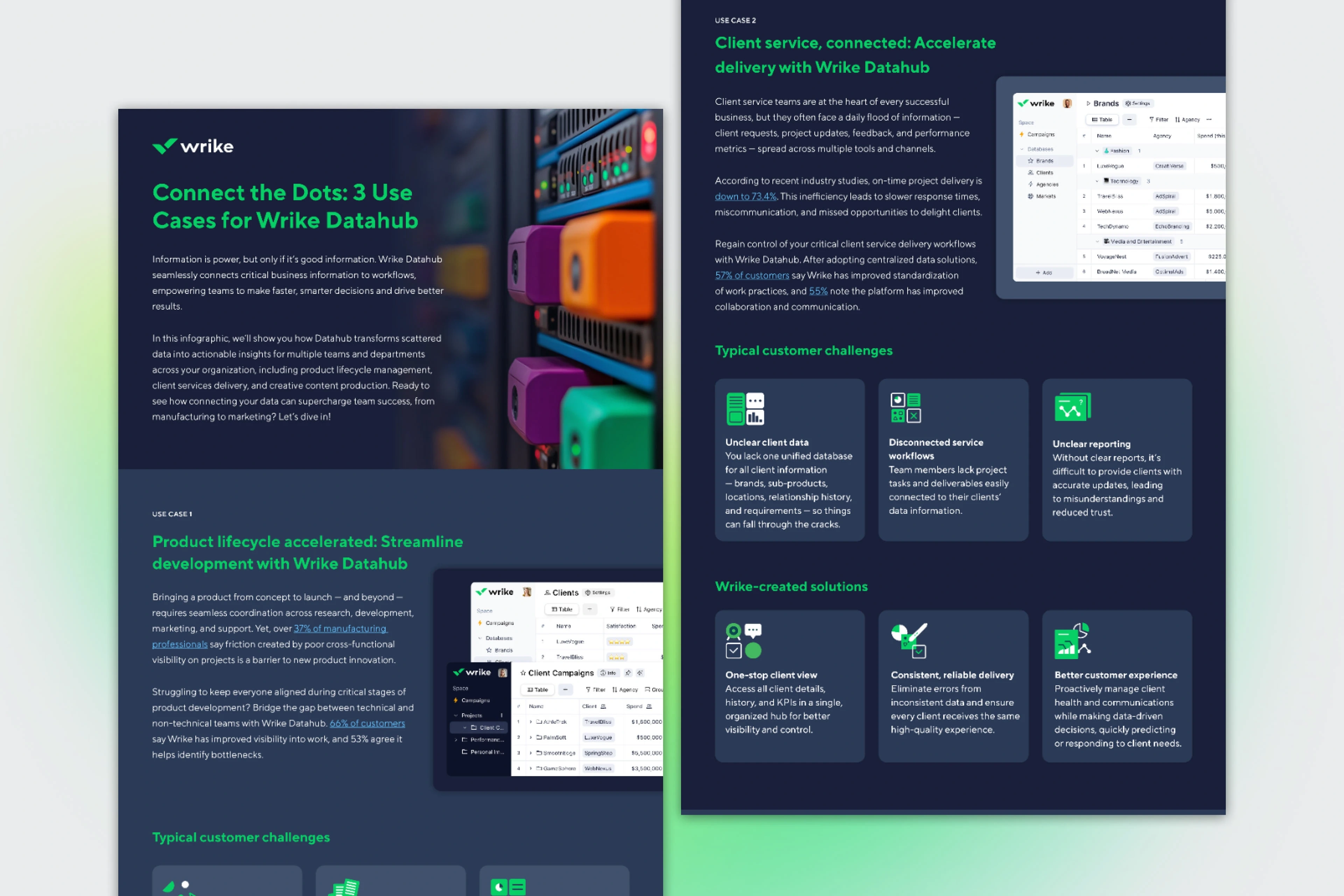 Wrike presents its services through extended documents labeled as infographics. They contain a mix of tutorials, case studies, quotes, and insights.