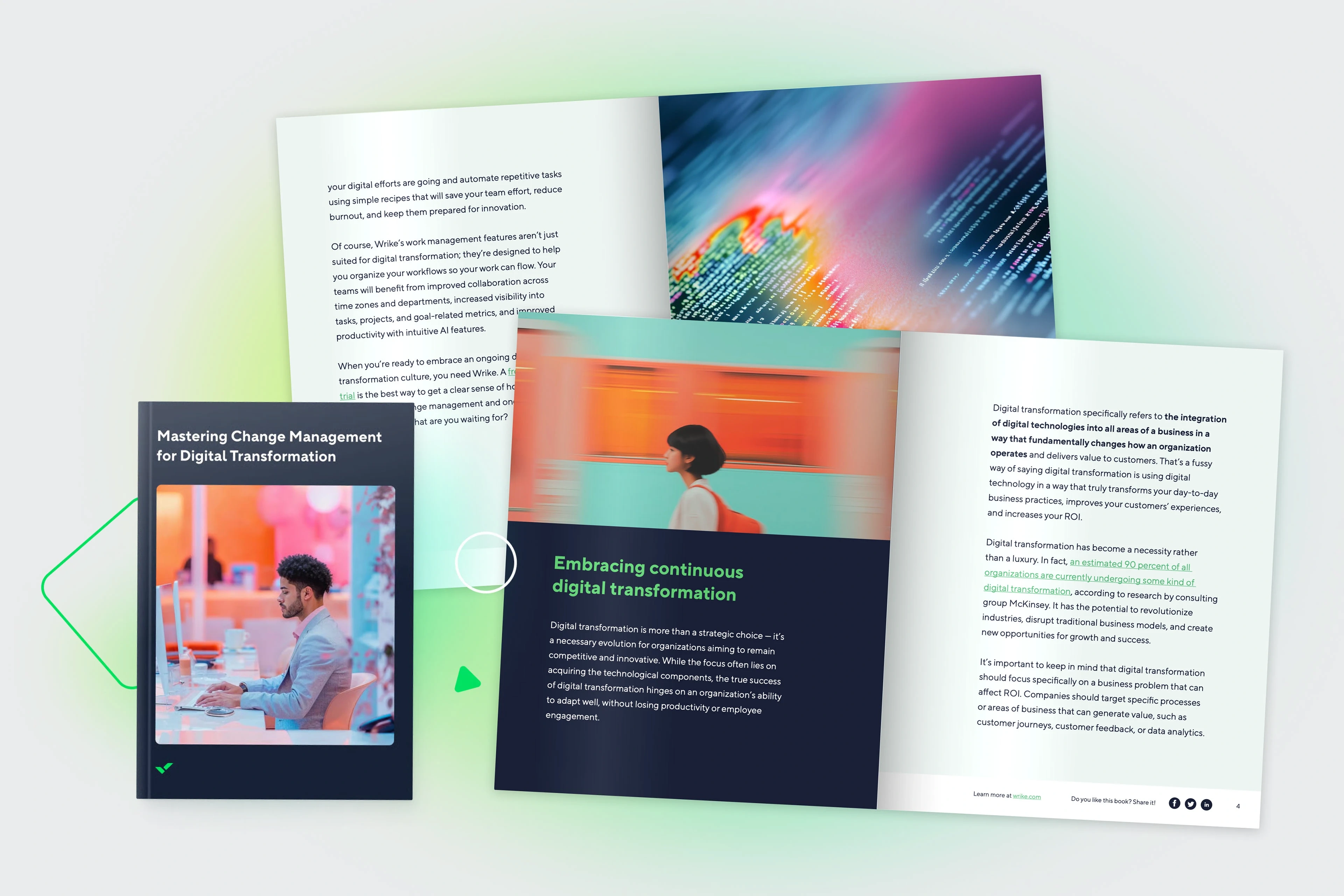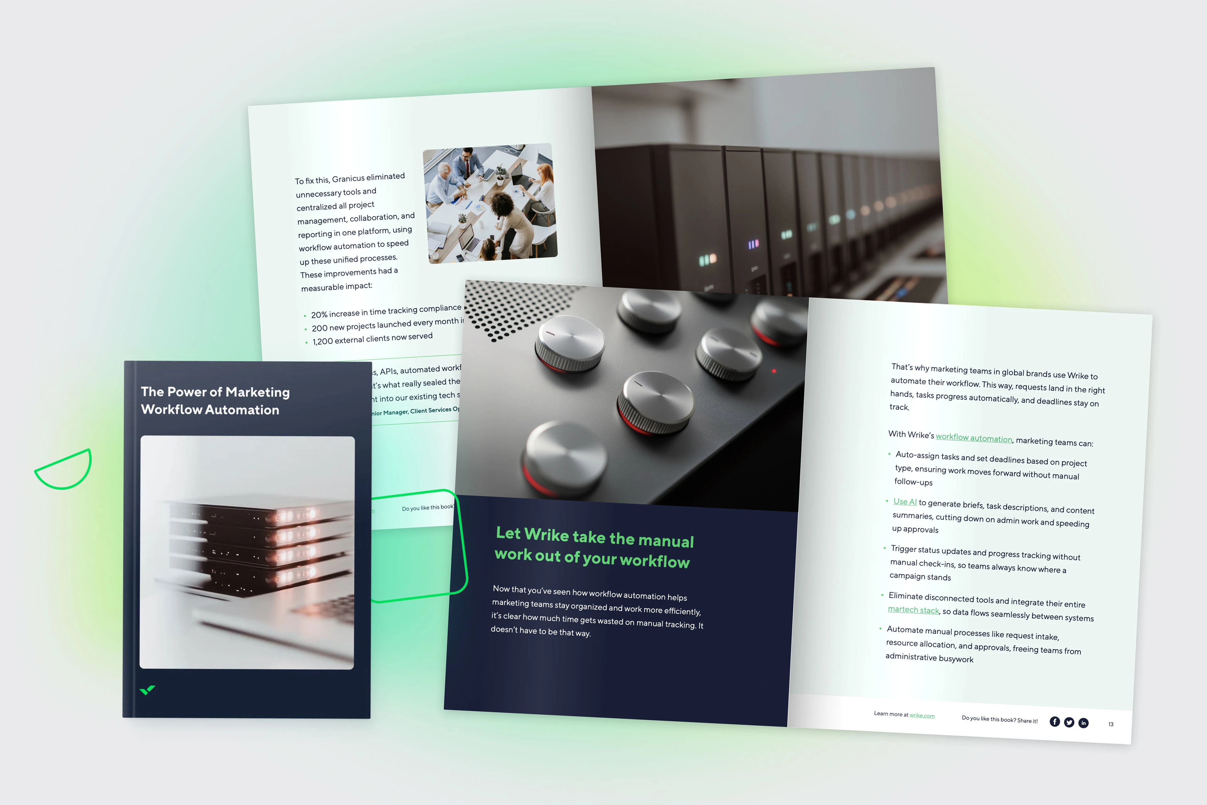 An example of ebook design ranging from 20 to 40 pages: the selection of imagery reflects the content of the document, enriched with illustrations and icons from the Wrike design system.