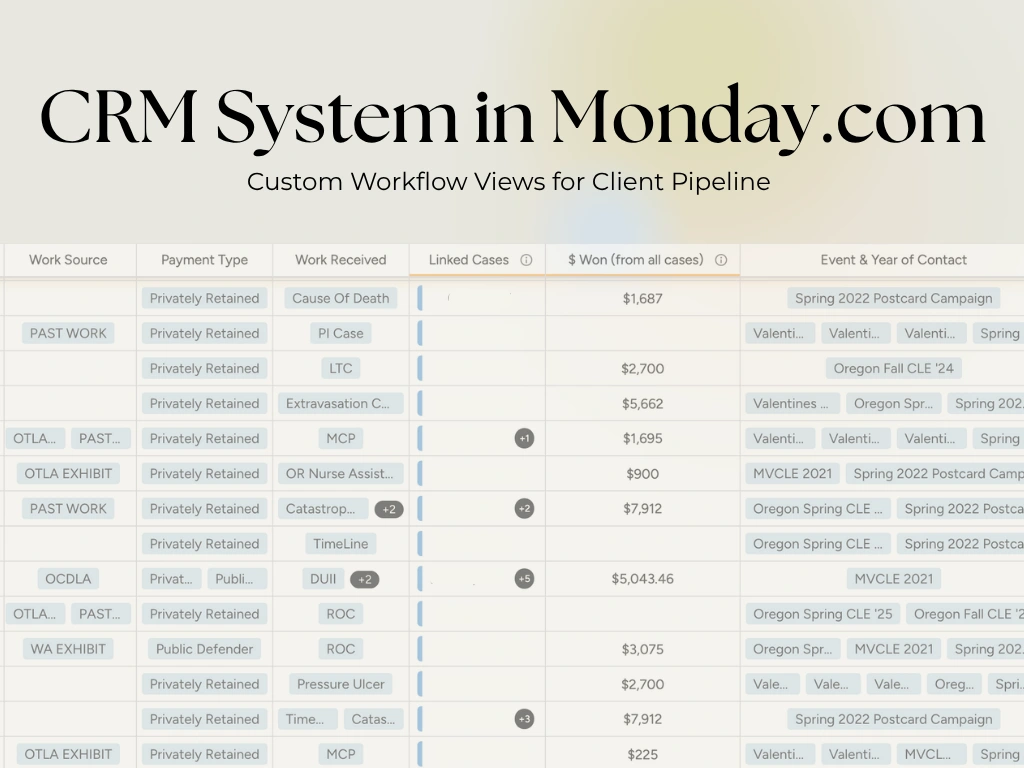 Originally, the information lived across more than 50 separate spreadsheets. The goal of this build was to create a centralized, organized hub that reflects the full progression of client engagement — from early stewardship, exhibit attendance, and postcard campaign participation, all the way to “Work Received.” This structure allows the team to clearly understand where each relationship stands and what actions are needed next.