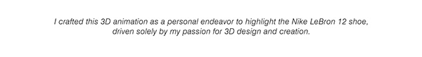 I crafted this 3D animation as a personal endeavor to highlight the Nike LeBron 12 shoe, driven solely by my passion for 3D design and creation.
