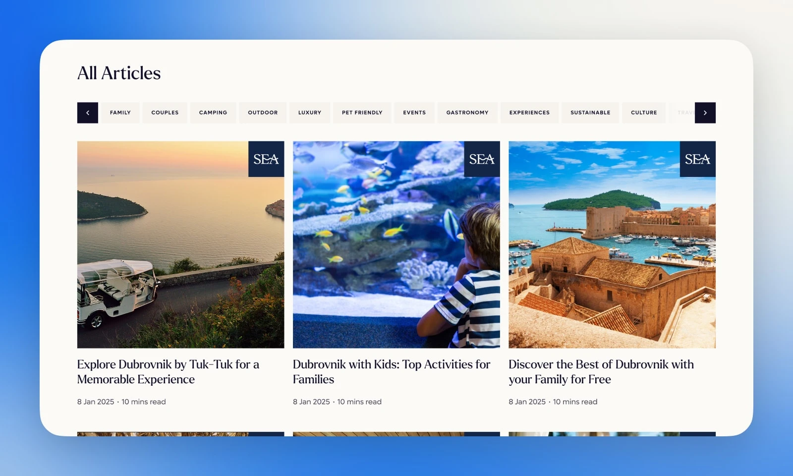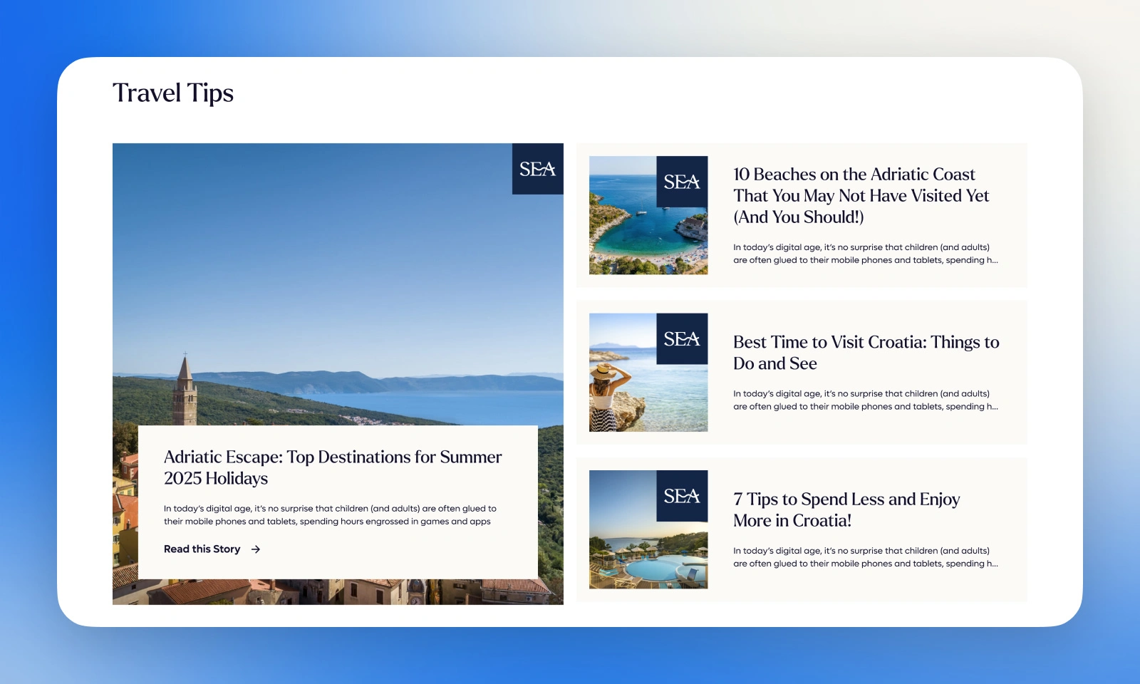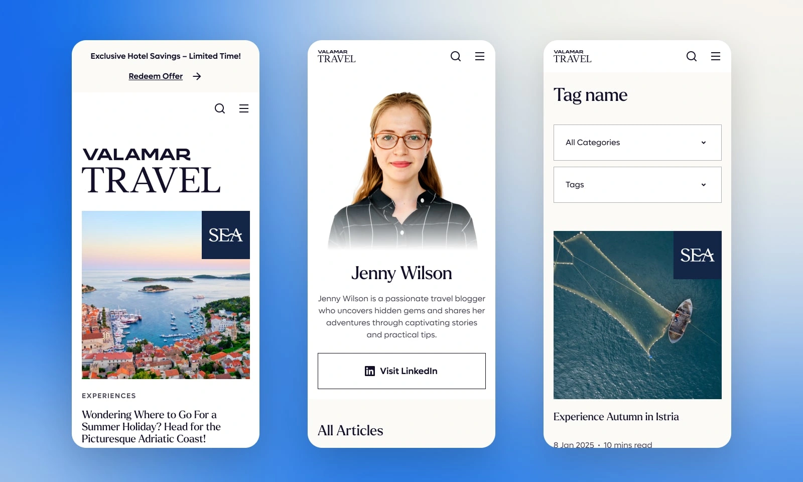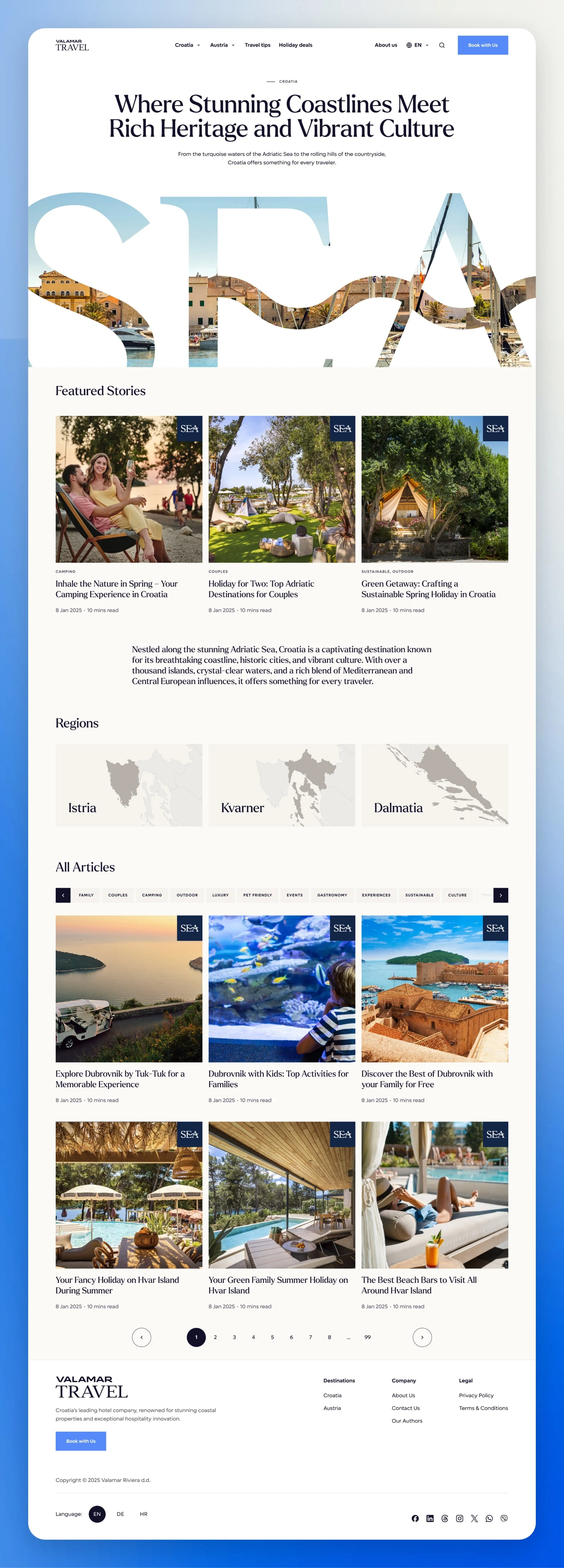 We redesigned Valamar’s travel blog to create a more premium and flexible editorial experience for one of the region’s best-known hospitality brands. The goal was to elevate the way Valamar presents travel inspiration, while supporting a wide range of content formats across its blog ecosystem.