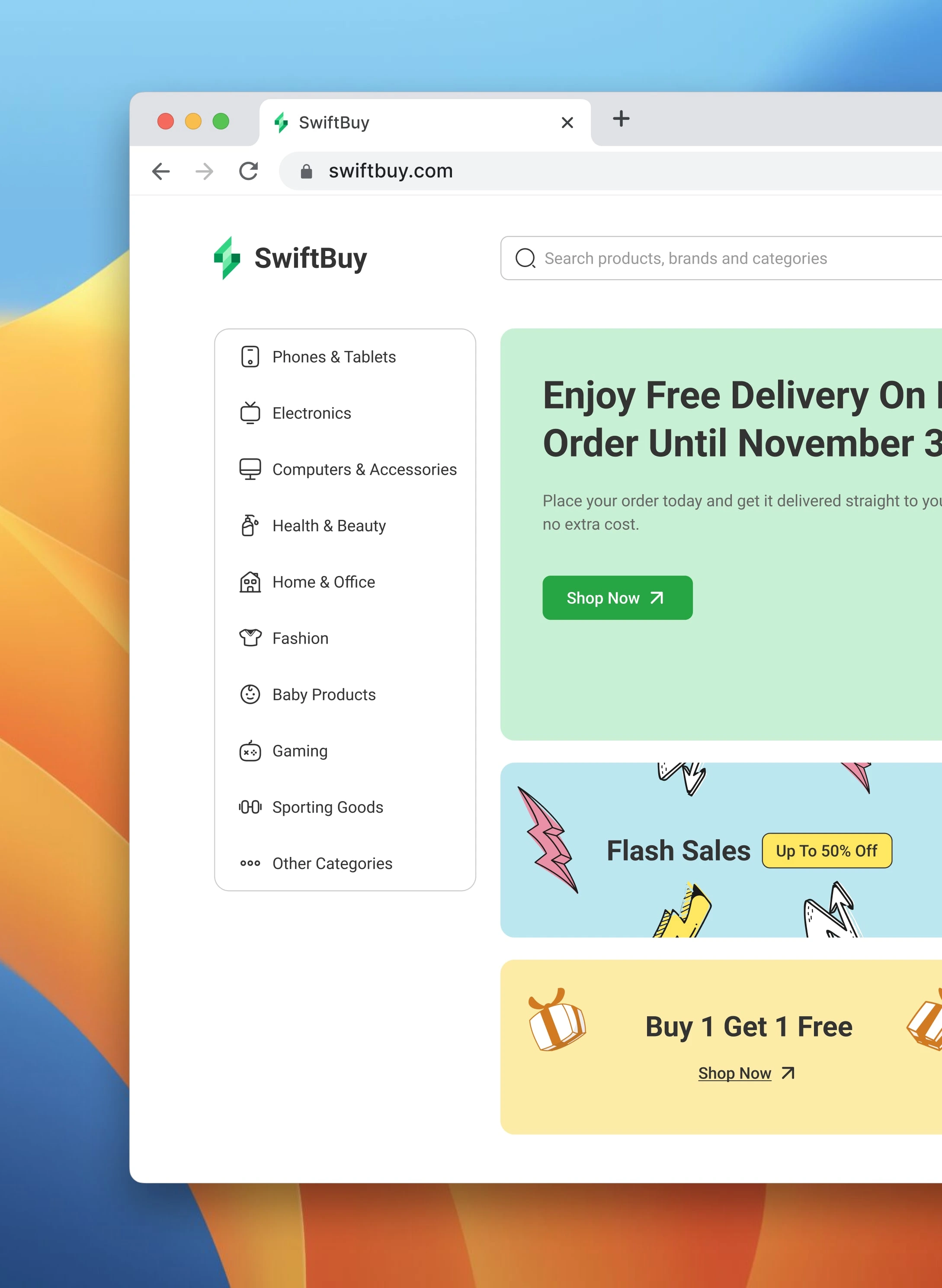 The SwiftBuy design enhances the customer journey from browsing to checkout. By combining intuitive navigation with promotional highlights, the platform not only simplifies shopping but also encourages customer retention and repeat purchases.