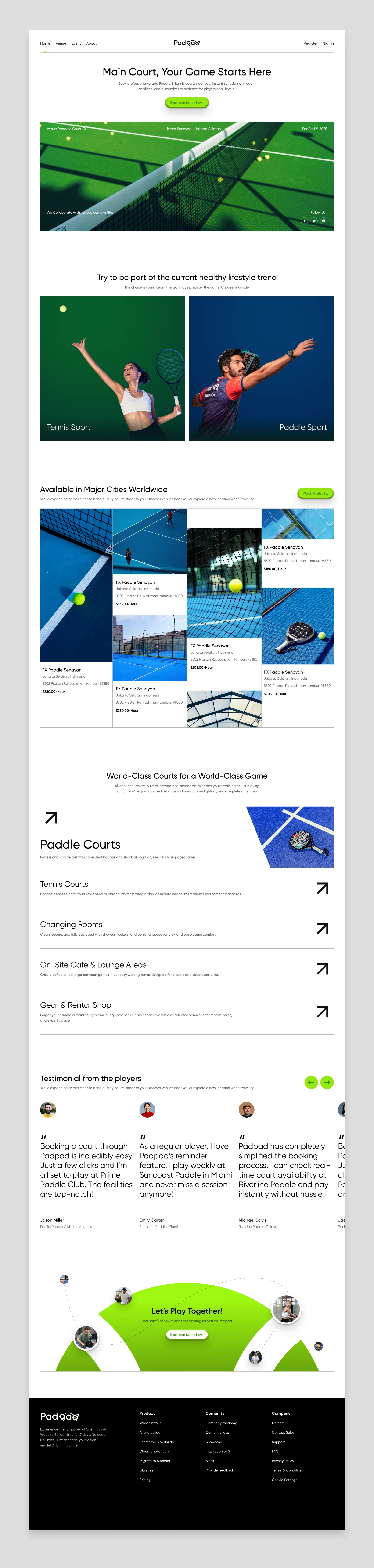 A modern and user-friendly web design concept for a padel & tennis court rental platform — designed to make discovering, booking, and managing court time effortless.