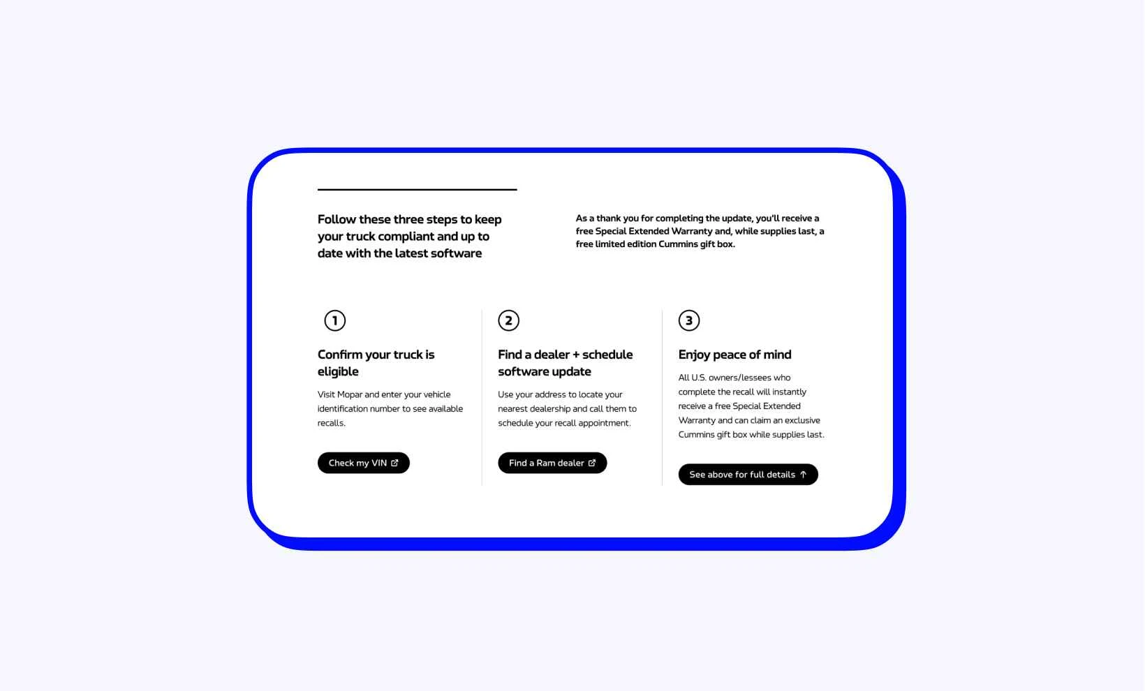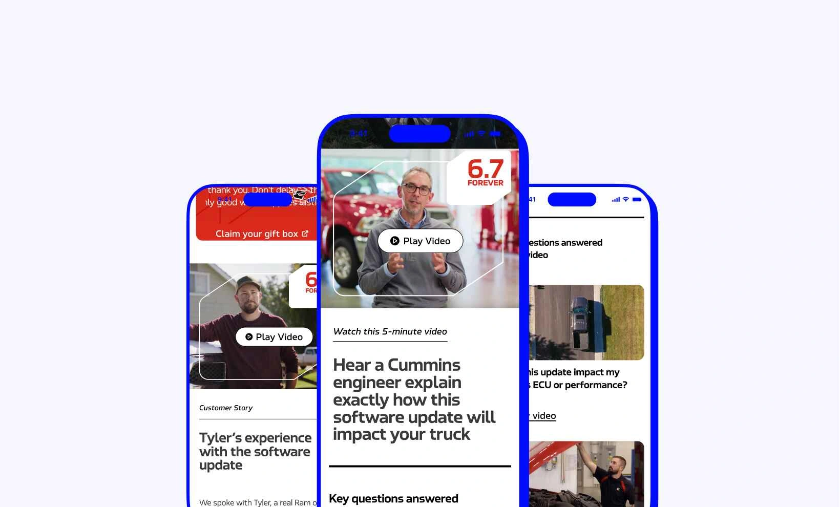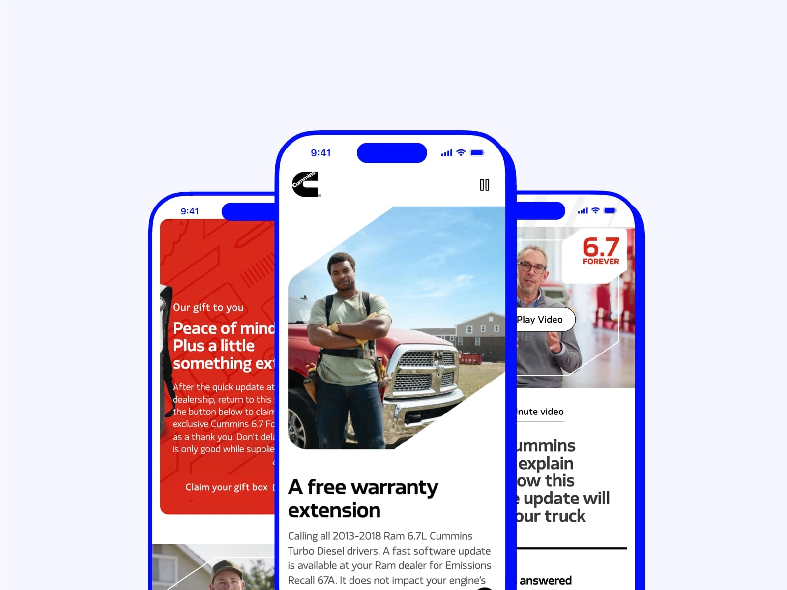 Cummins, a global leader in manufacturing, was in the middle of a large recall to update software in more than 600,000 vehicles supplied with their engines. After experiencing lackluster numbers attributed to growing skepticism from vehicle owners–they reached out for support in improving a less-than-helpful user experience on their existing landing page and provide a typically loyal customer base with the reassurance that they were looking for and encourage participation.